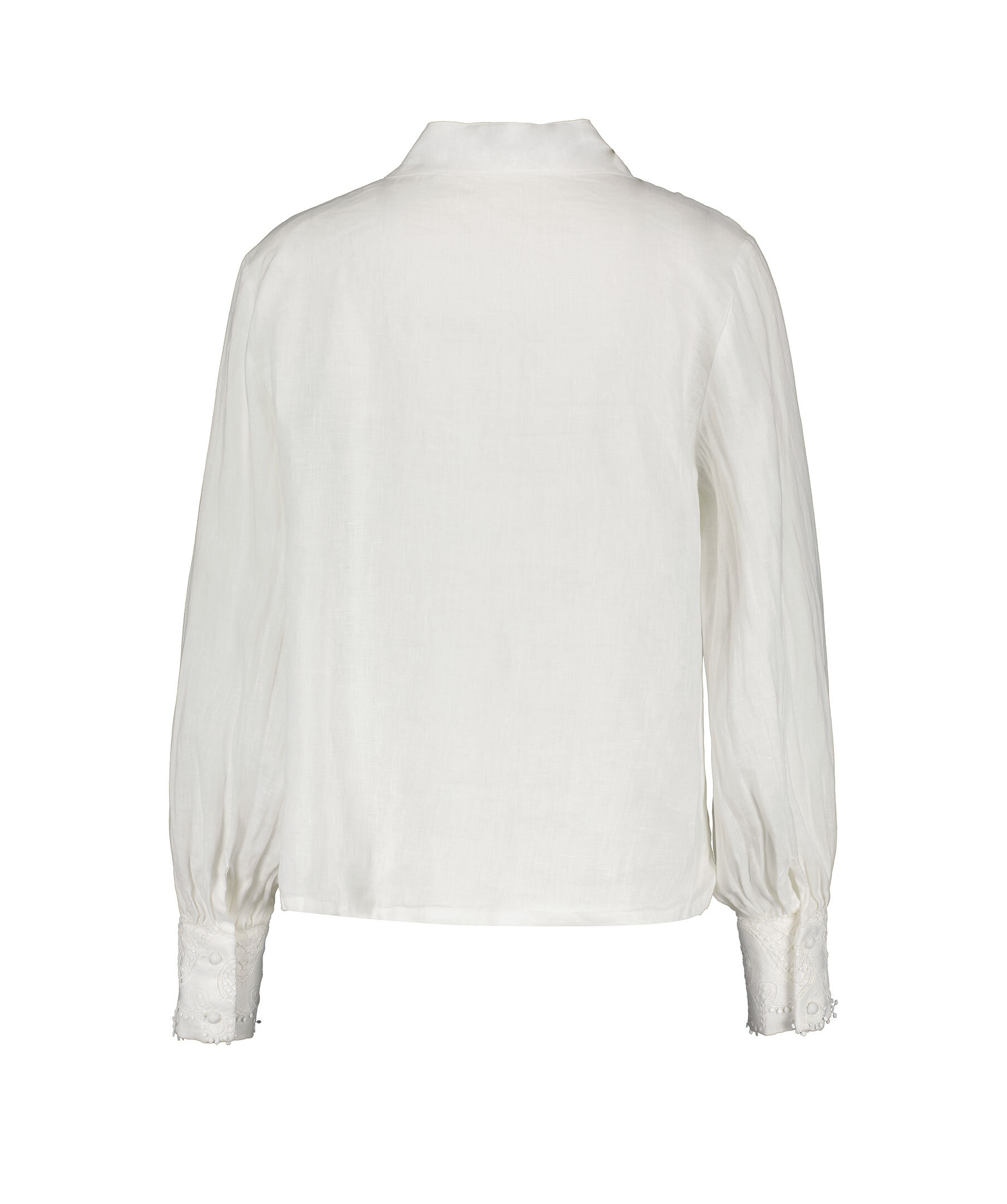 Vit blus från My Aurora. Blusen stängs med klädda knappar framtill och har något bredare och högre krage. Den har även ett broderat hålmönster längs med knappstängningen samt på manschetterna. Tillverkad i 100% lin.