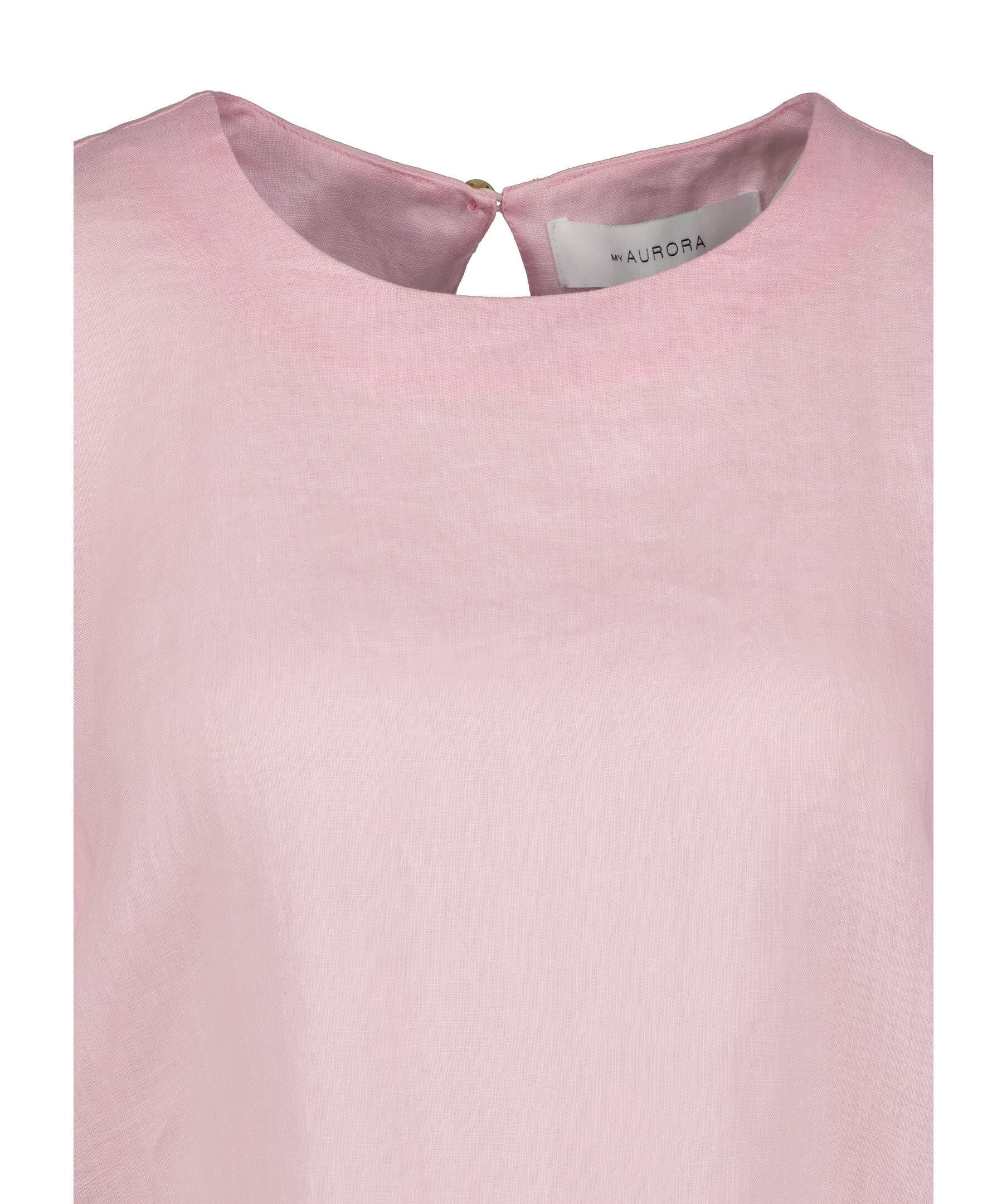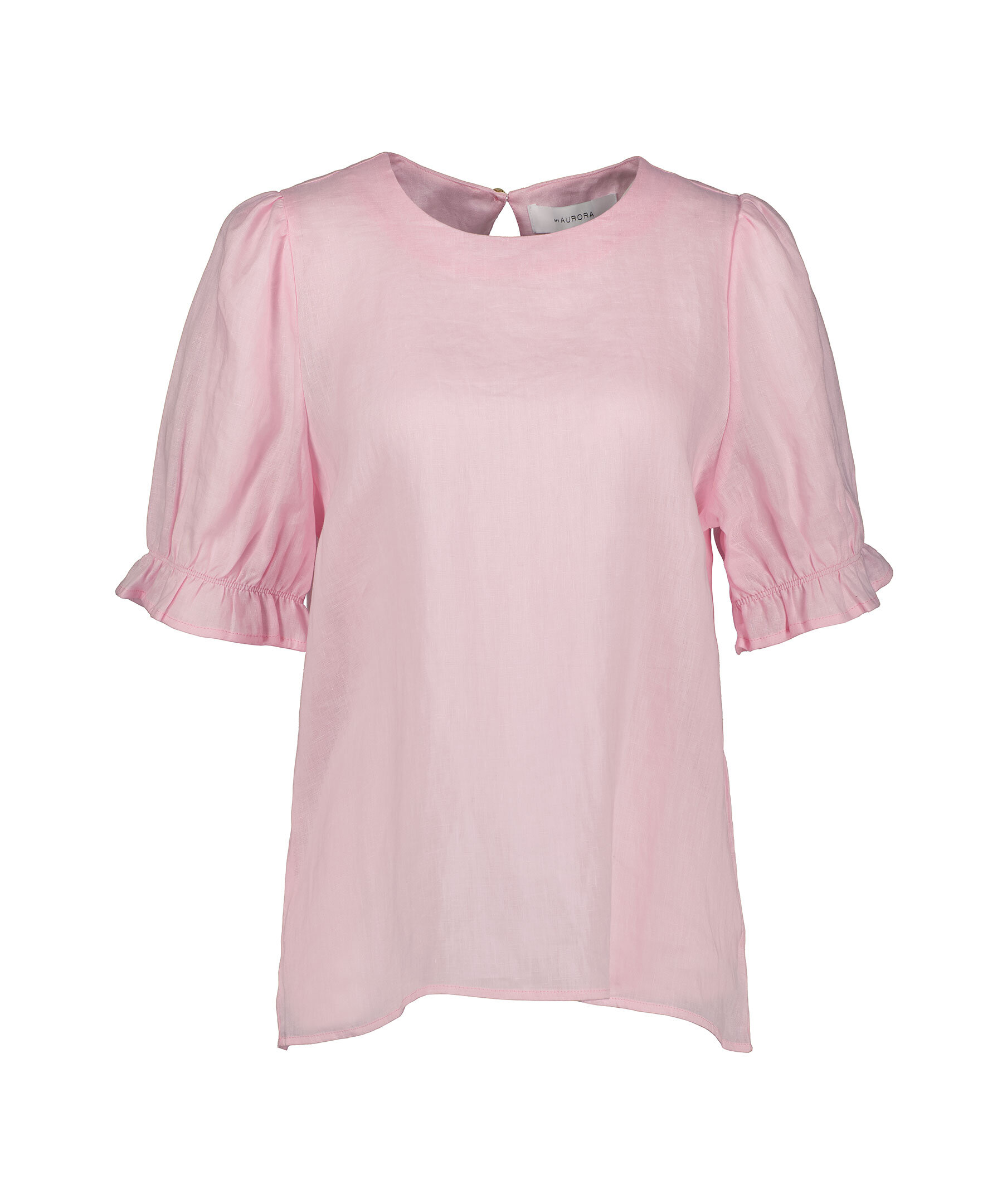 Ljusrosa kortärmad blus med puffärm och volang från My Aurora. Knäppning i ryggen. Tillverkad i 100% linne. Rundad halsringning.