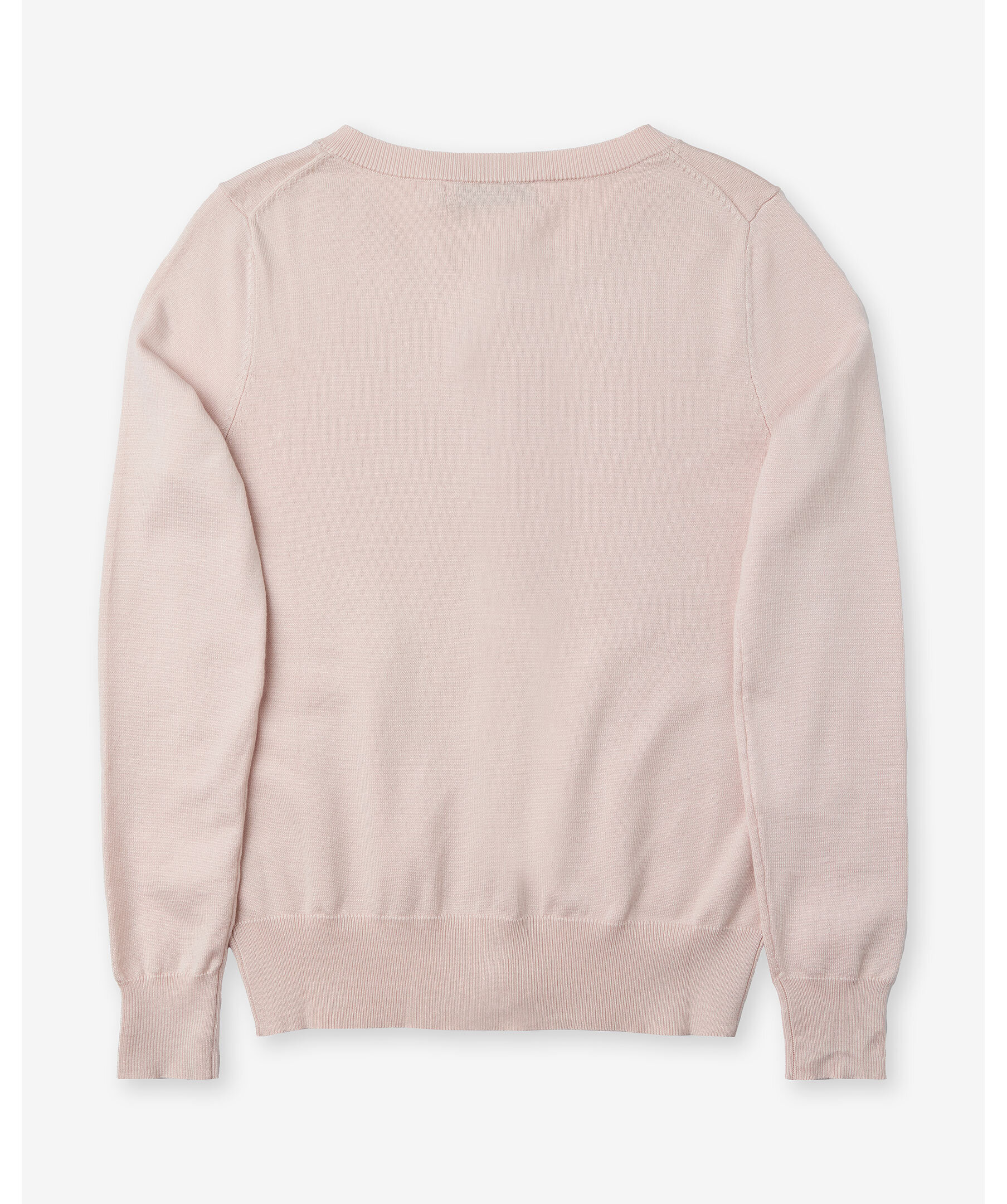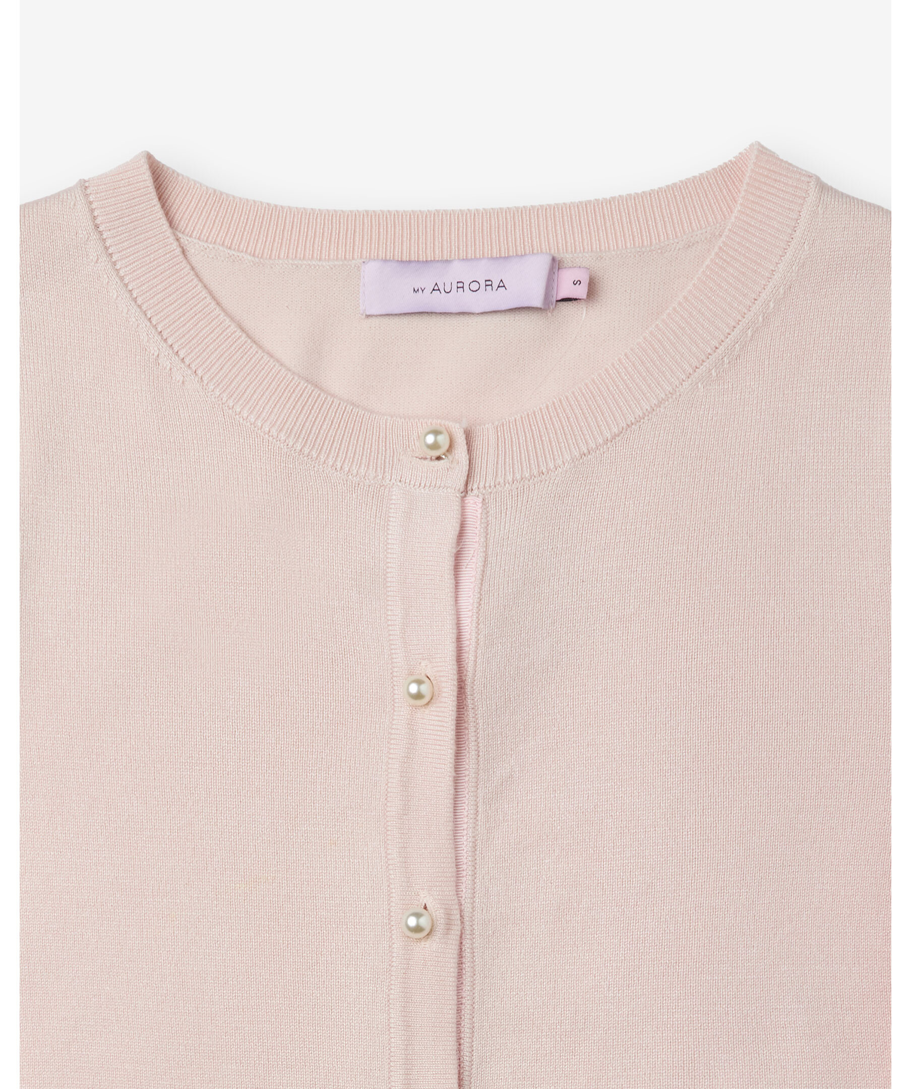 Finstickad cardigan i ljusrosa från My Aurora Pink. Ribbstickade muddar och stängs med eleganta pärlknappar. Gjord i en viskos och nylon blandning.