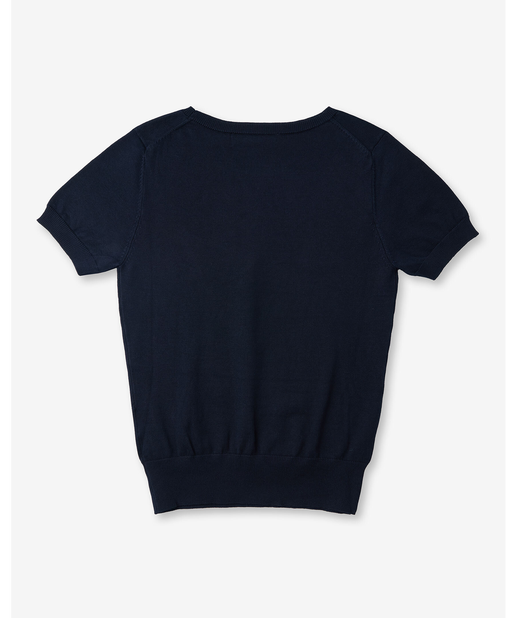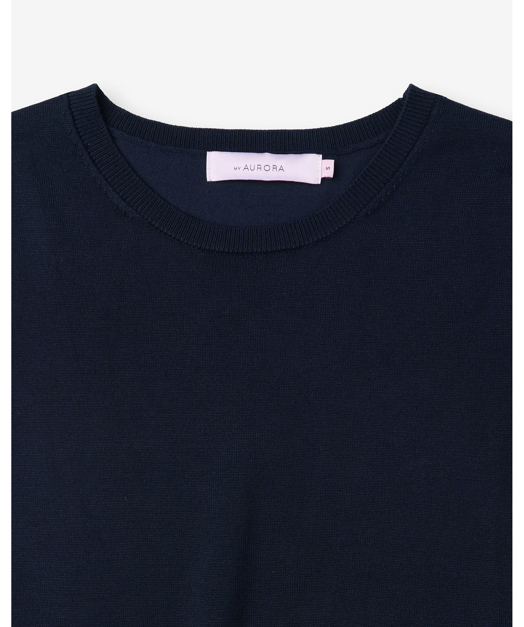 Tunn finstickad tröja i marinblått från My Aurora Pink. Ribbstickade muddar vid halsring, ärm och plaggslut. Tröjan är tillverkad i en blandning av viskos och nylon.