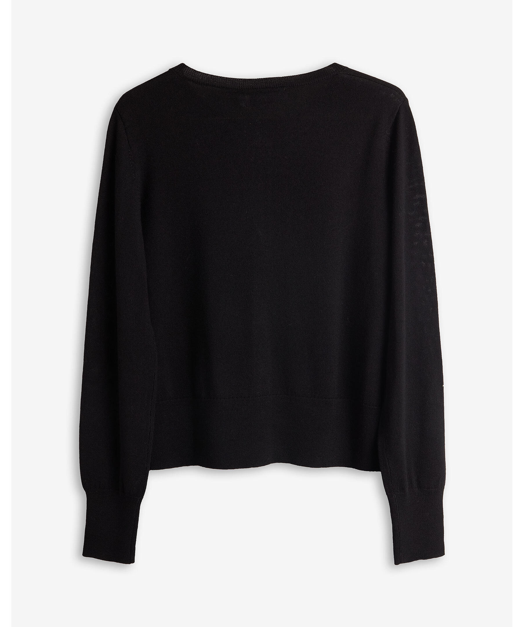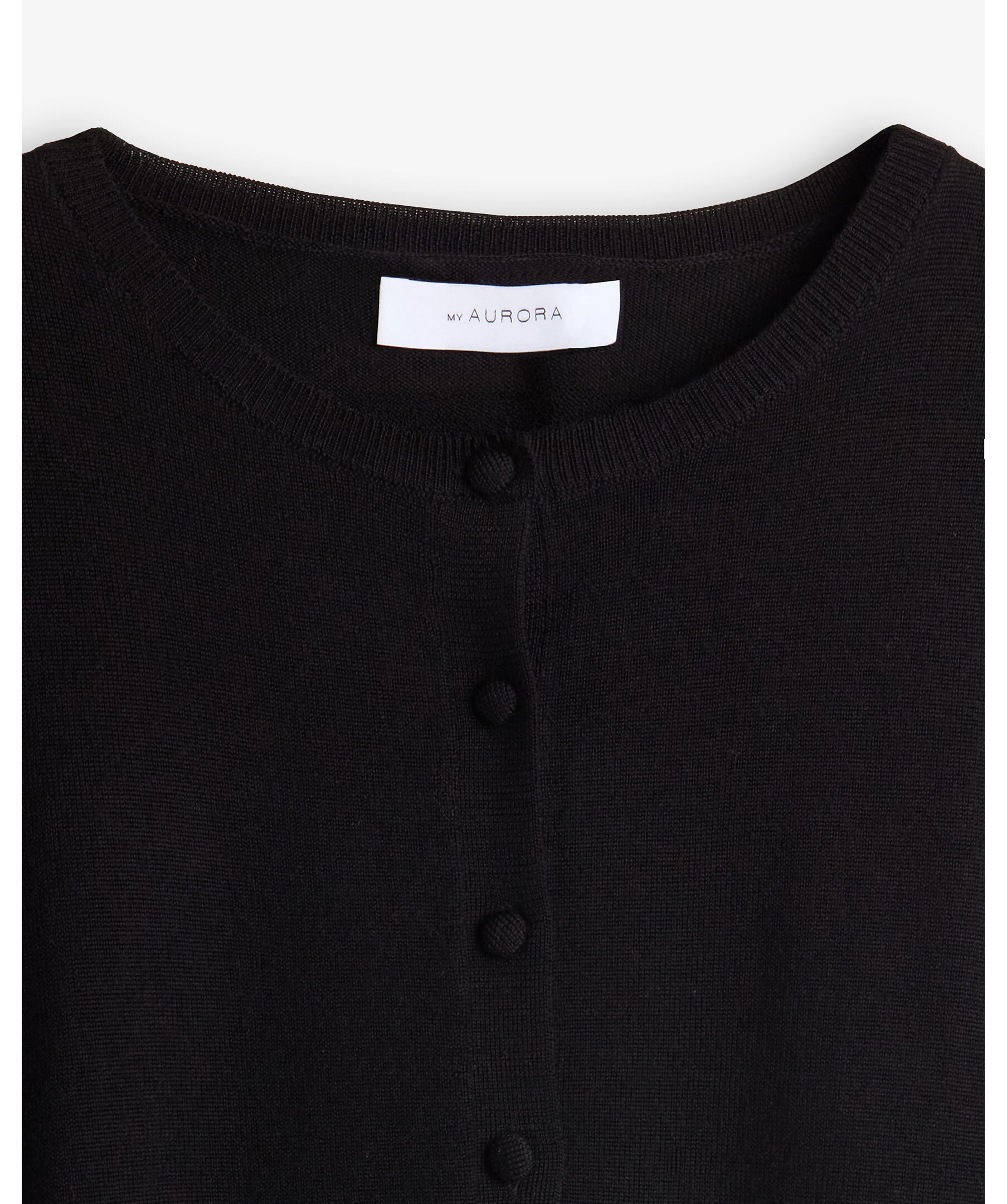 Finstickad cardigan i svart från My Aurora. Ribbstickade muddar och stängs med eleganta, klädda knappar. Tillverkad i 100% merinoull.