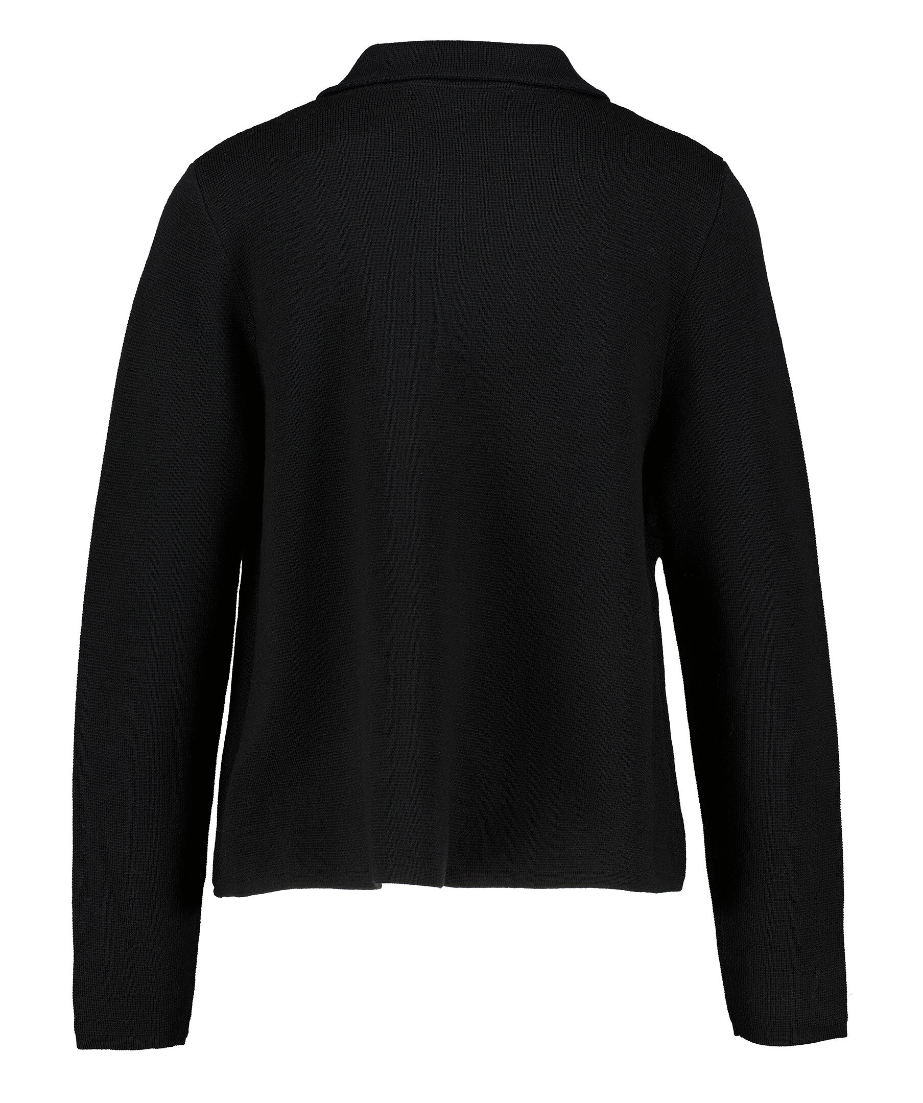 Svart stickad kofta från My Aurora. Stängs framtill med en klädd knapp. Spetsig krage. Tillverkad i 100% Merinoull. Tre knappar vid ärmslut.
