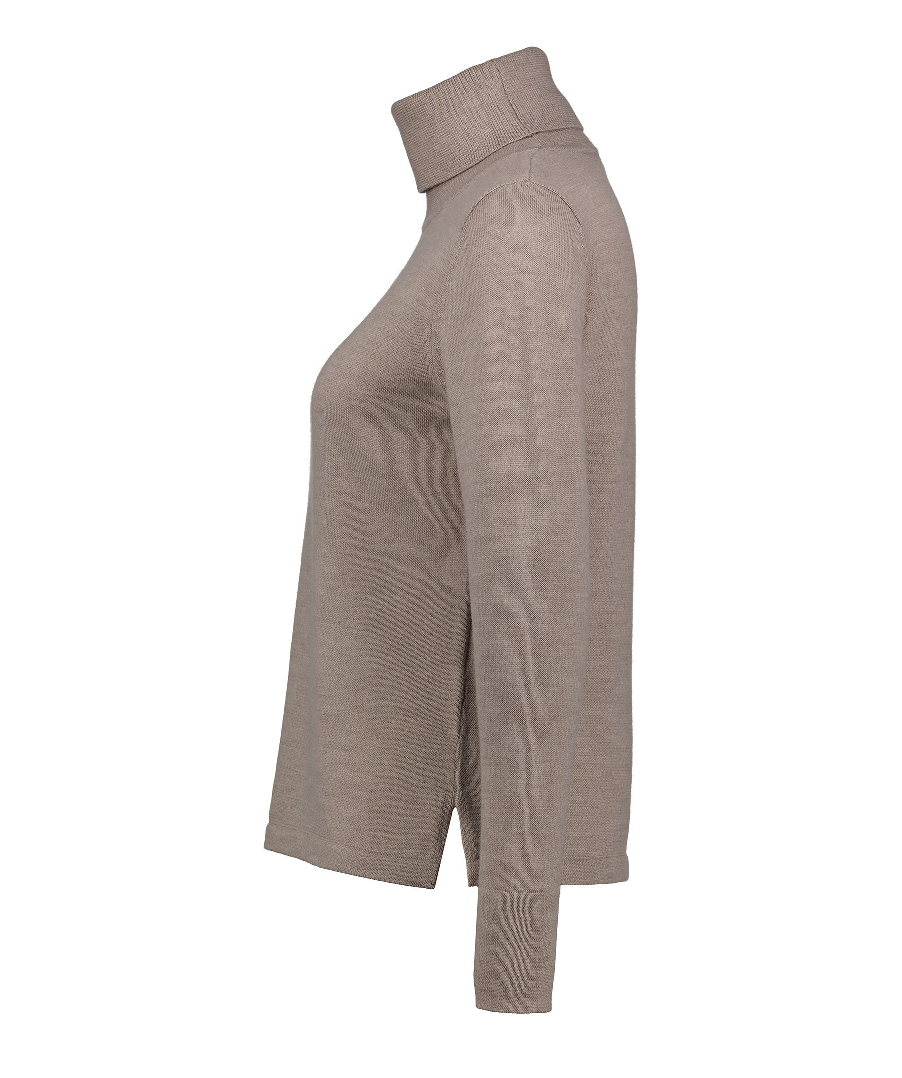 Taupefärgad, stickad polotröja från My Aurora. Korta slitsar i sidorna, ribbstickad polokrage samt muddar vid ärm- och plaggslut. Tillverkad i 100% merinoull