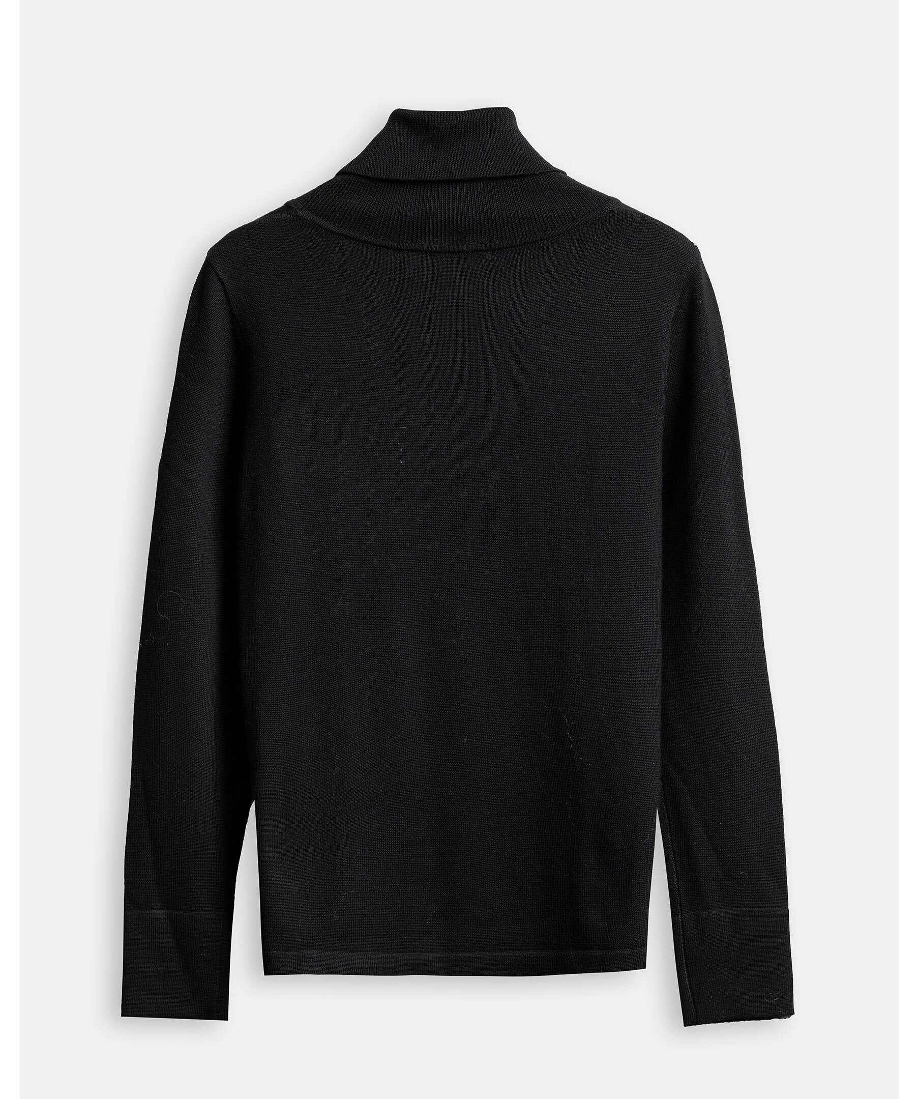 Svart finstickad polotröja från My Aurora. Tröjan har en hög krage som går att vika ned samt korta slitsar i sidorna och ribbstickade muddar. Tillverkad i 100% merinoull.