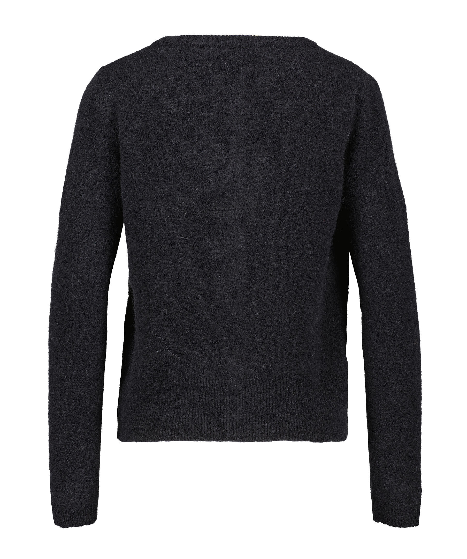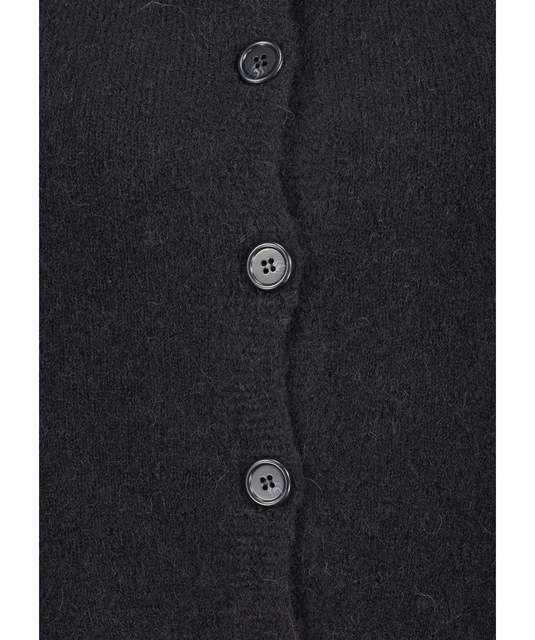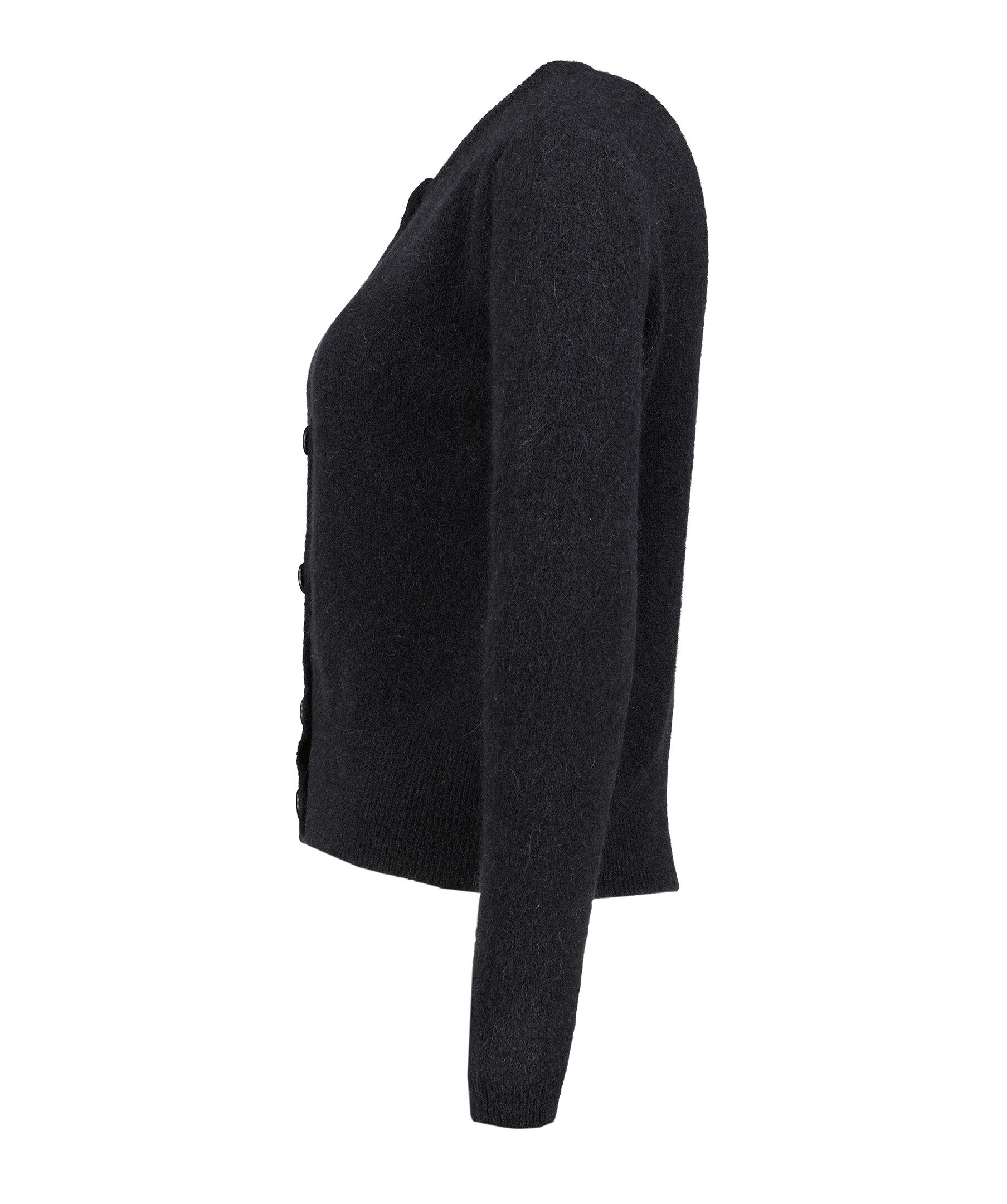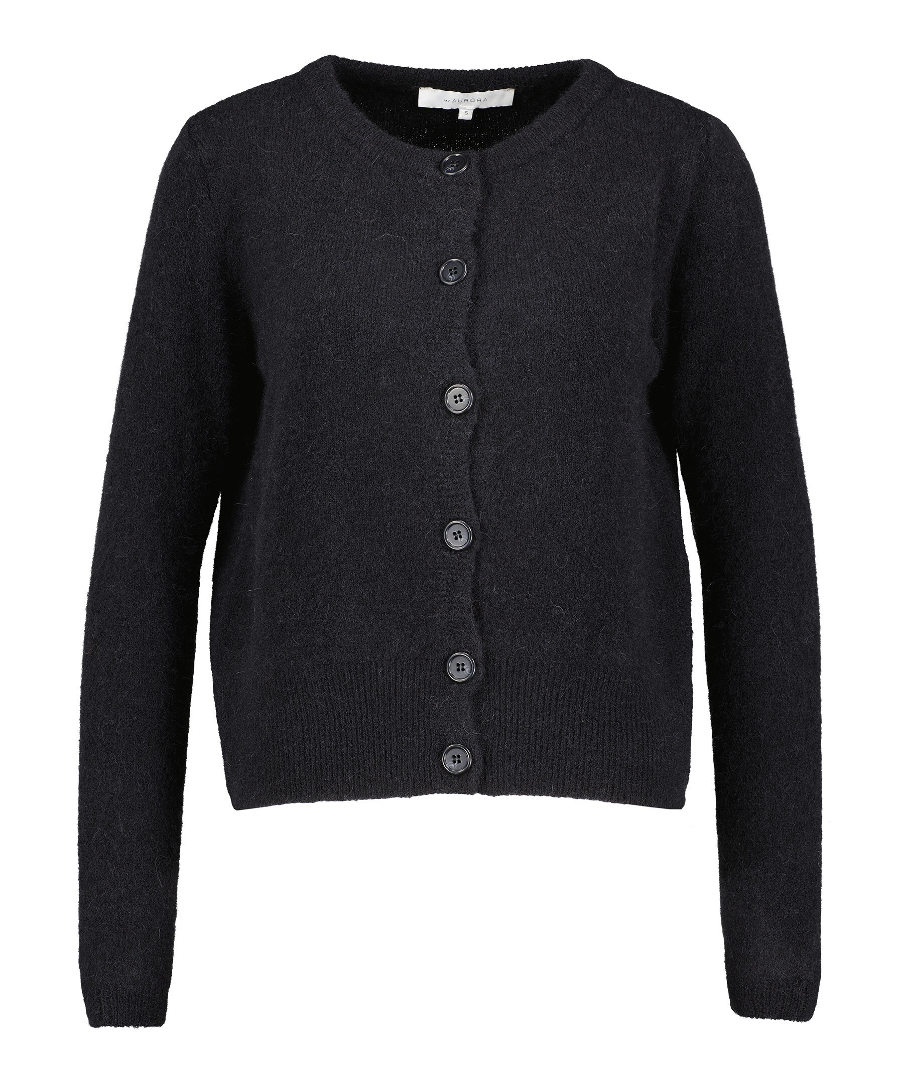 Svart kofta från My Aurora. Koftan stängs med svarta knappar och har en rundan halsringning. Tillverkad av en alpacka blandning.