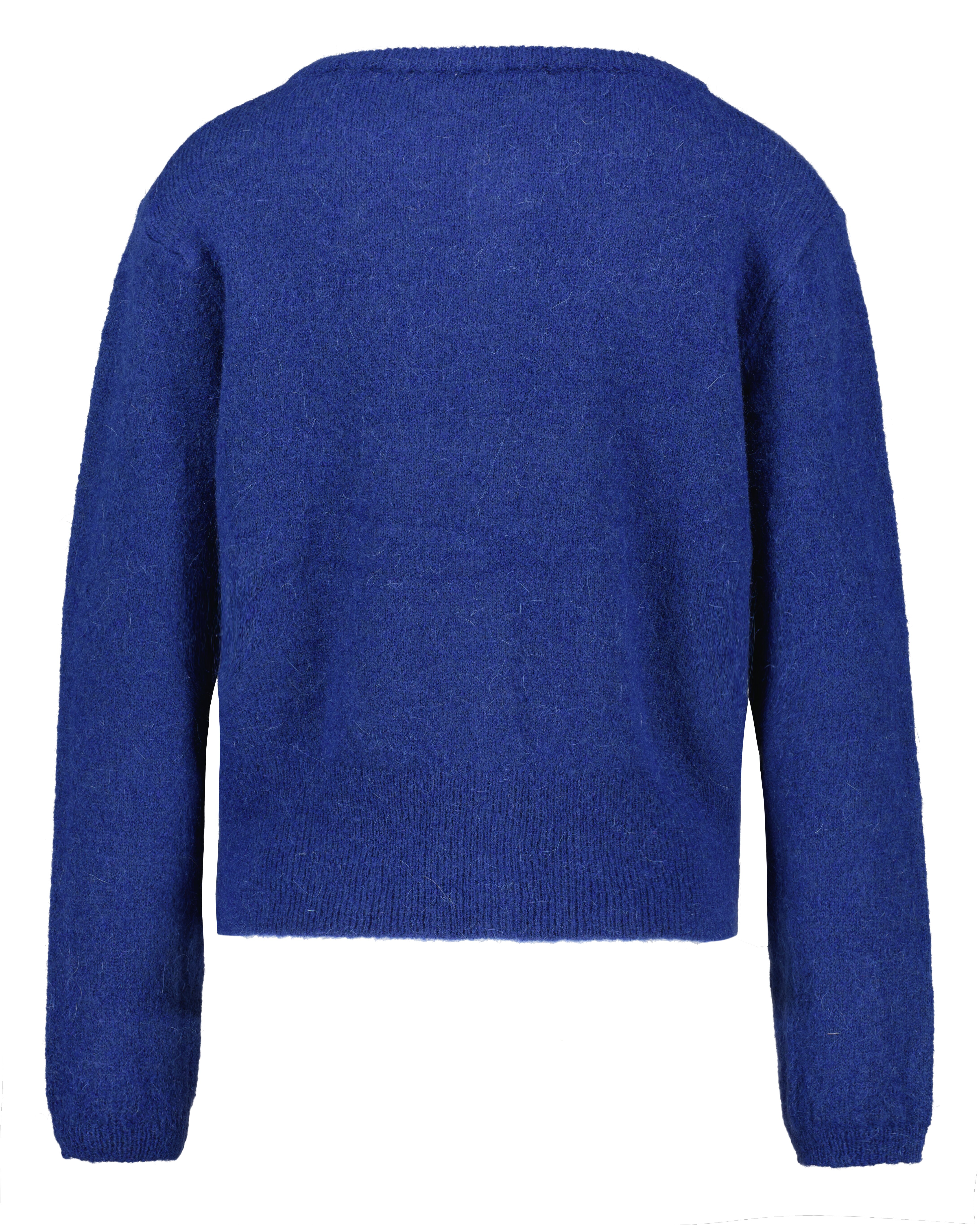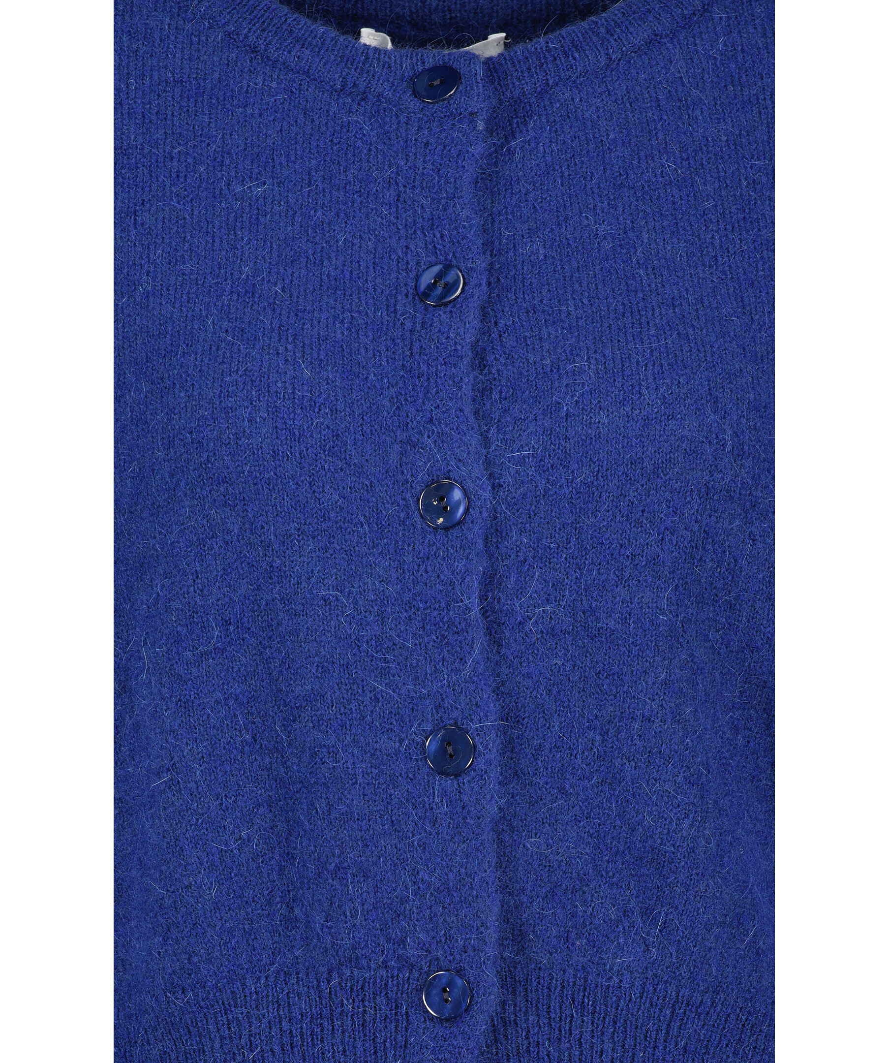 Mörkblå rätstickad kofta från My Aurora. Ribbstickade muddar, vid ärm- och plaggslut. Rundad halsringning. Tillverkad i mohair blandning. Stängs framtill med knappar.