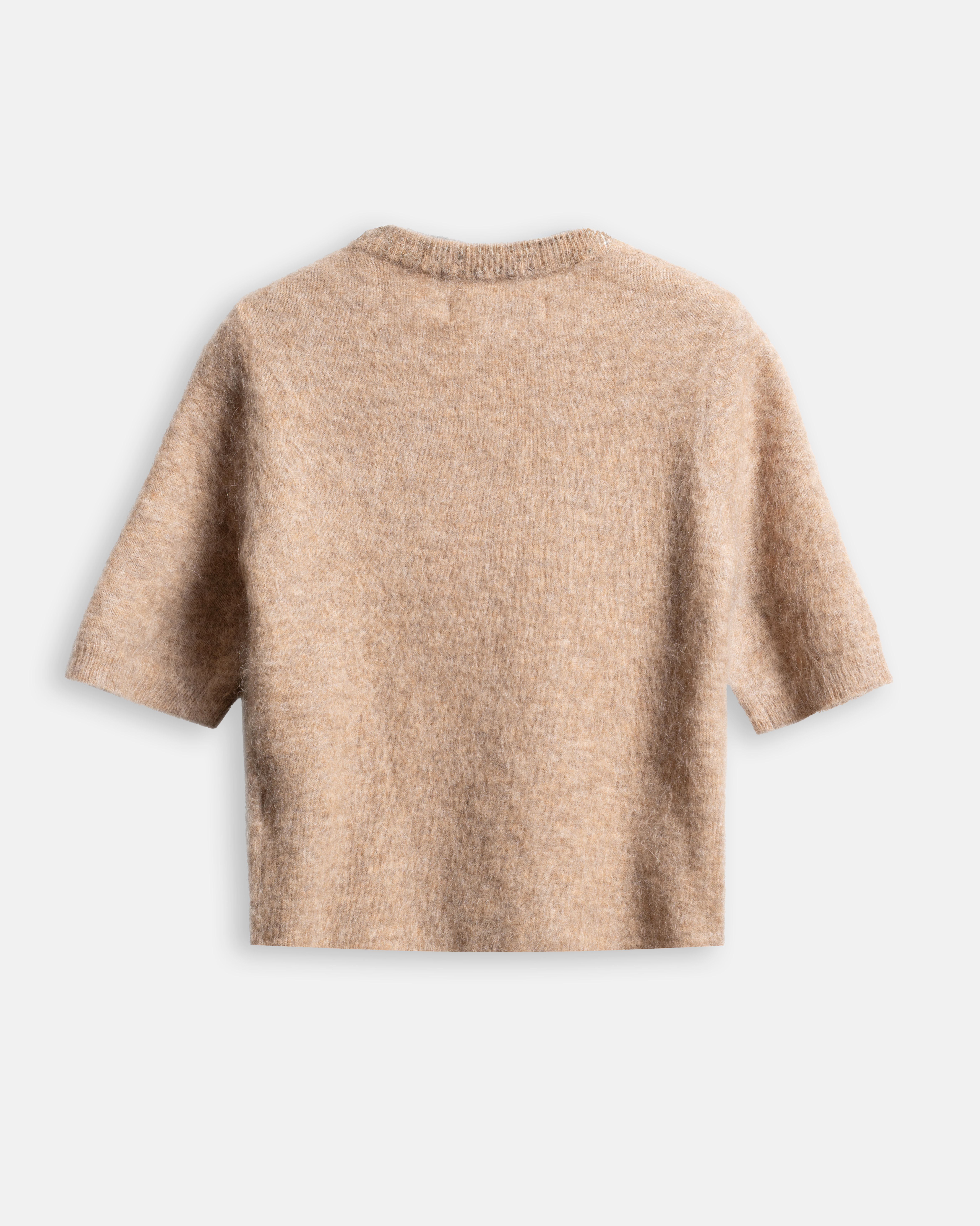 Stickad kortärmad kofta från My Aurora i en ull- och mohairblandning. Koftan har dekorativa strassknappar framtill.