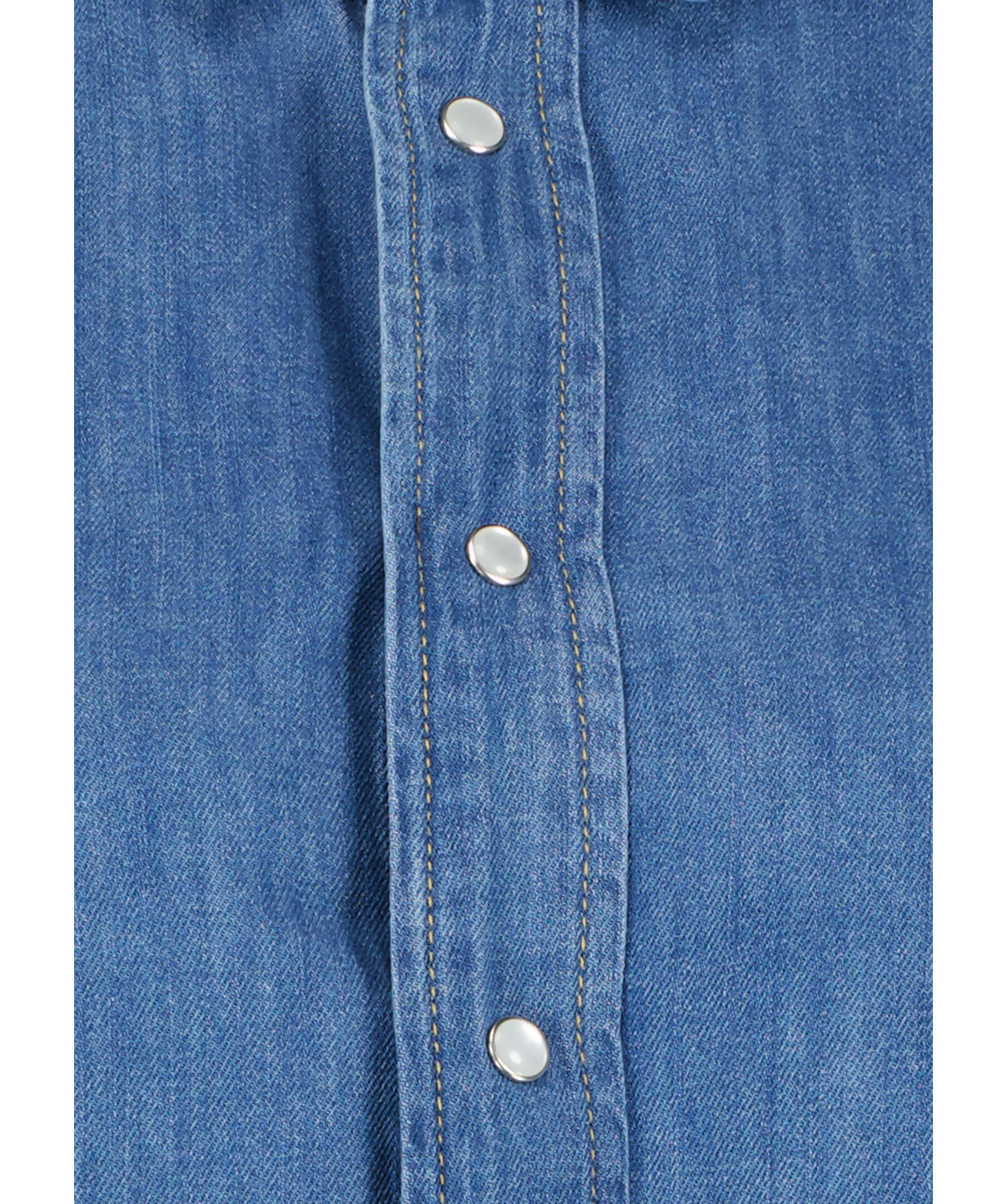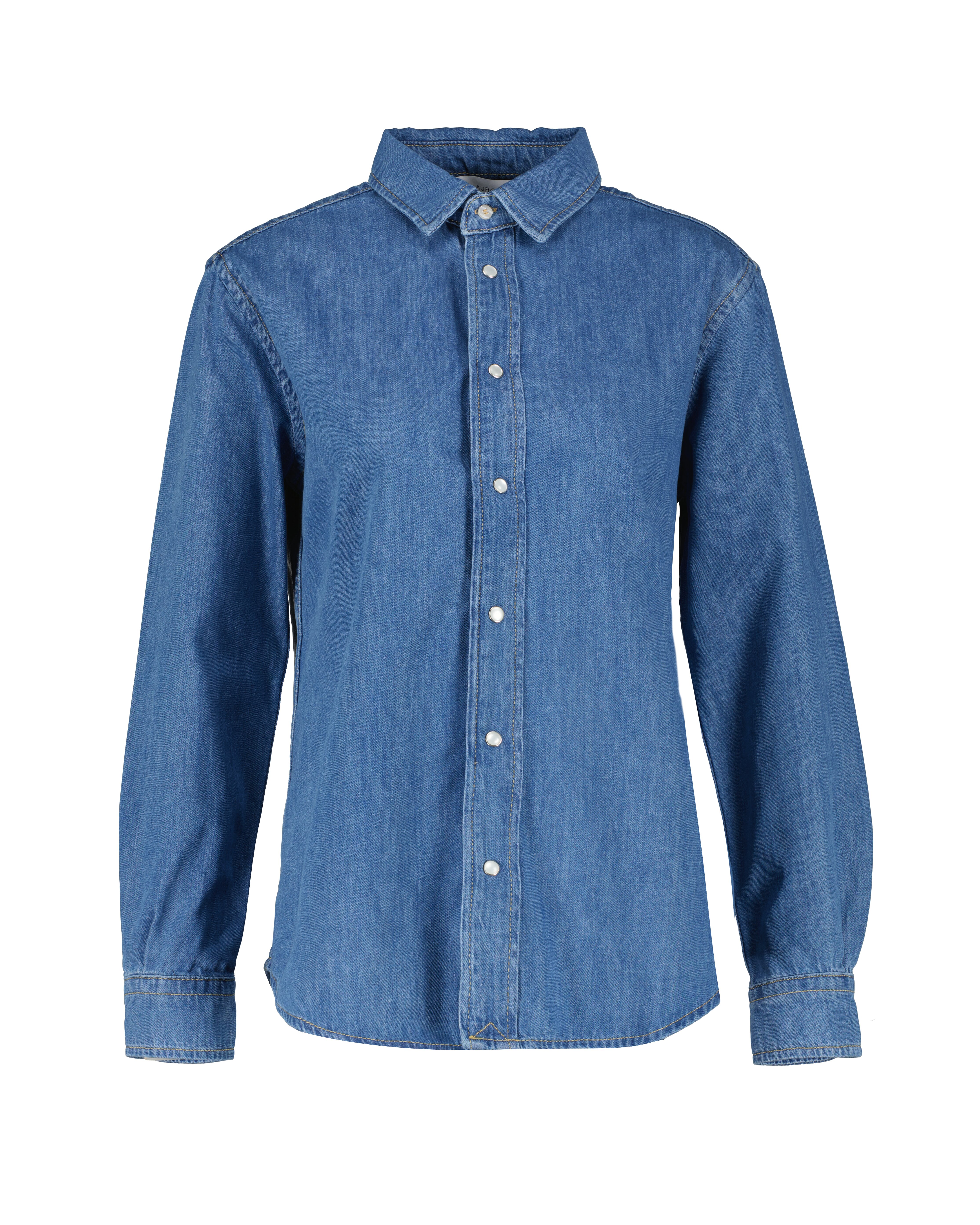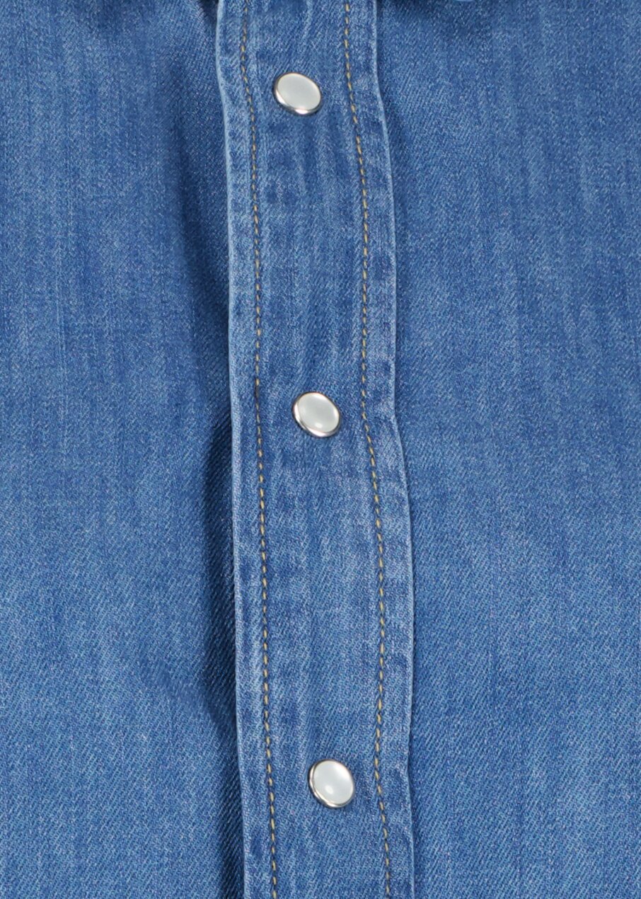 Blå jeansskjorta från My Aurora. Jeansskjortan har pärlemoknappar och stängs med tryckknappar fram. Rundad avslut. Tillverkad 100% bomull.