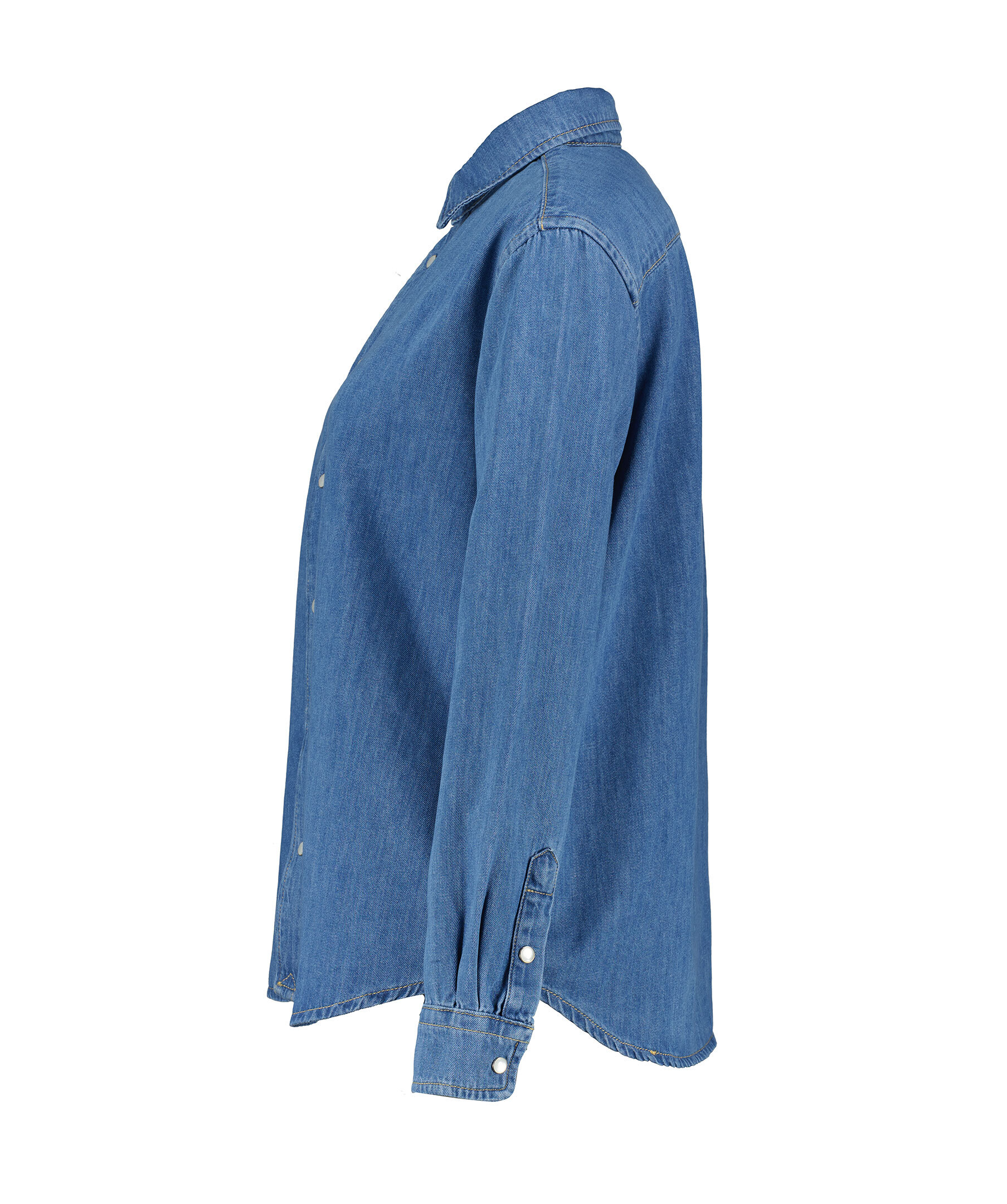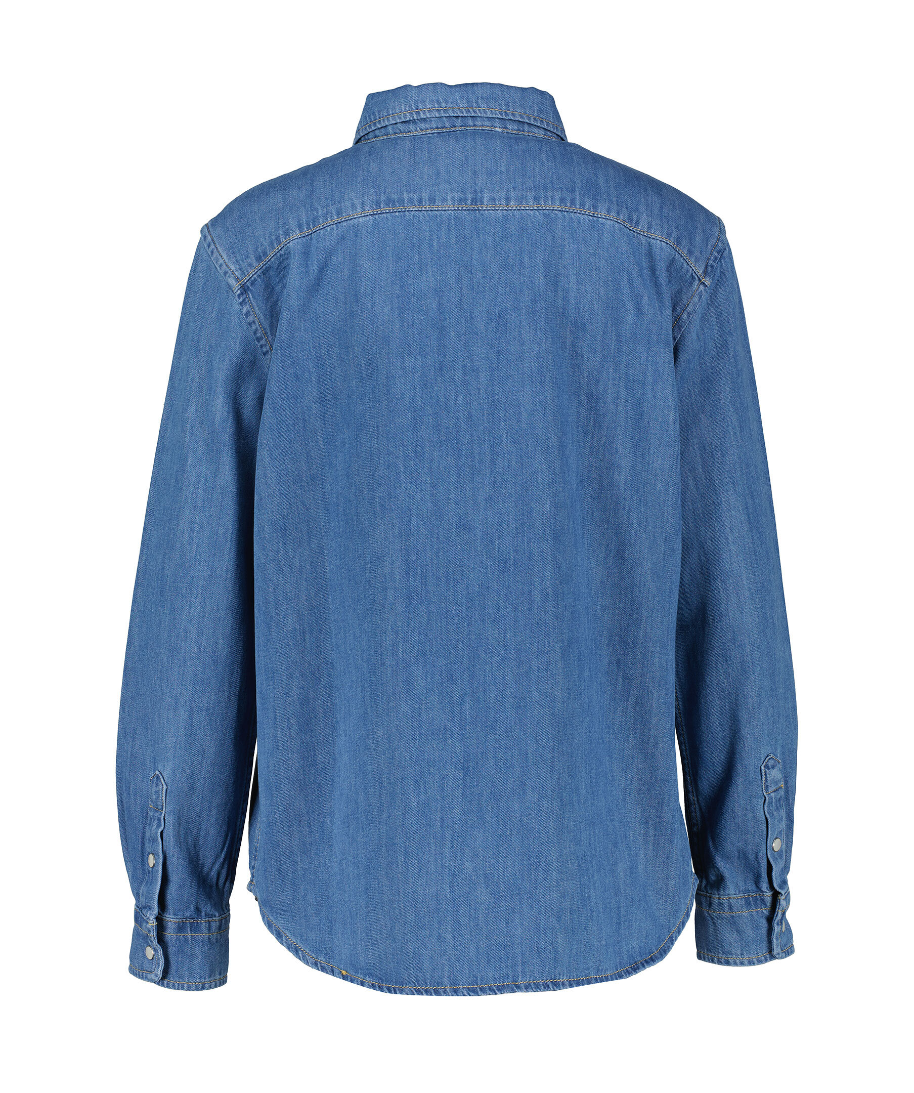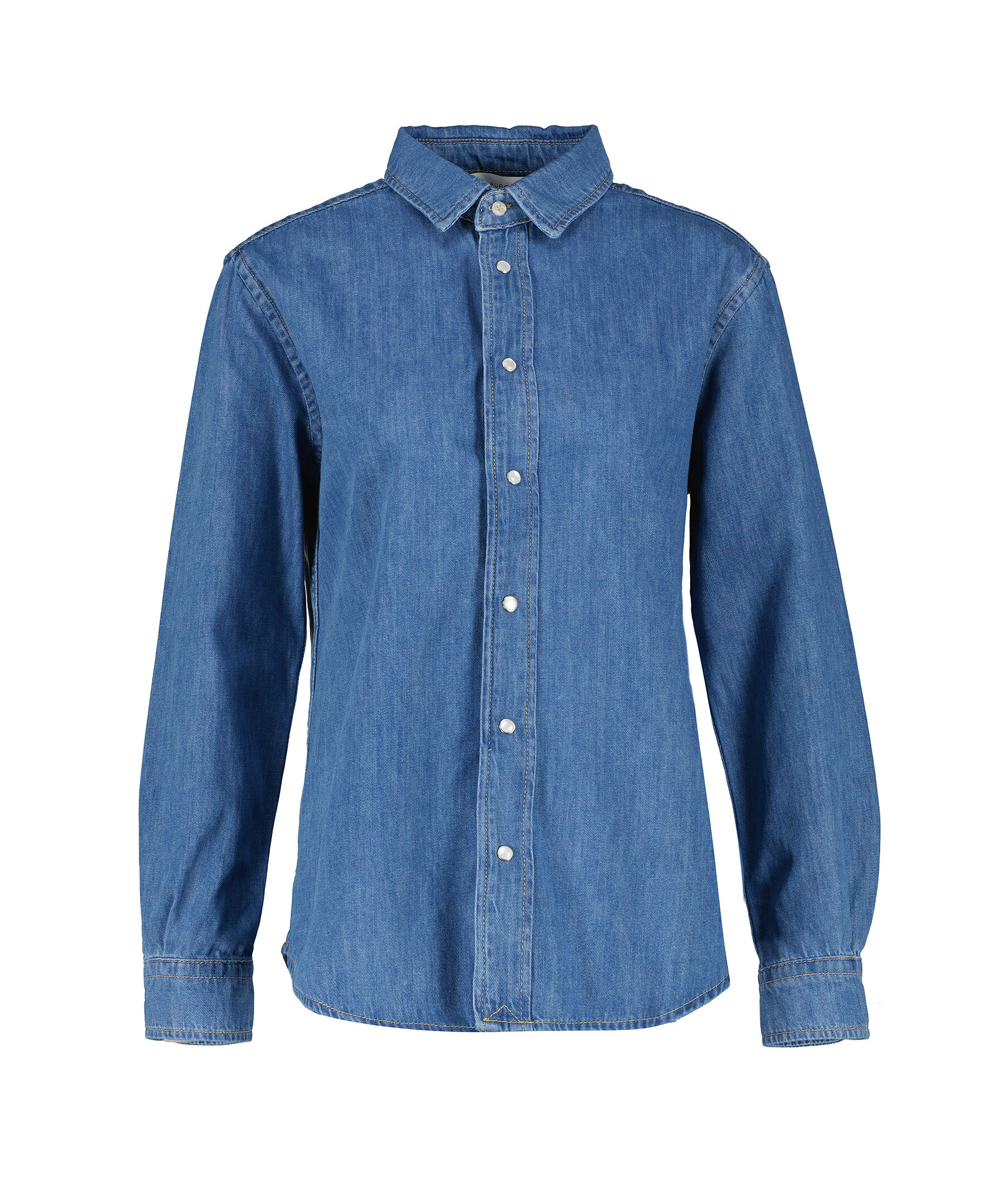 Blå jeansskjorta från My Aurora. Jeansskjortan har pärlemoknappar och stängs med tryckknappar fram. Rundad avslut. Tillverkad 100% bomull.