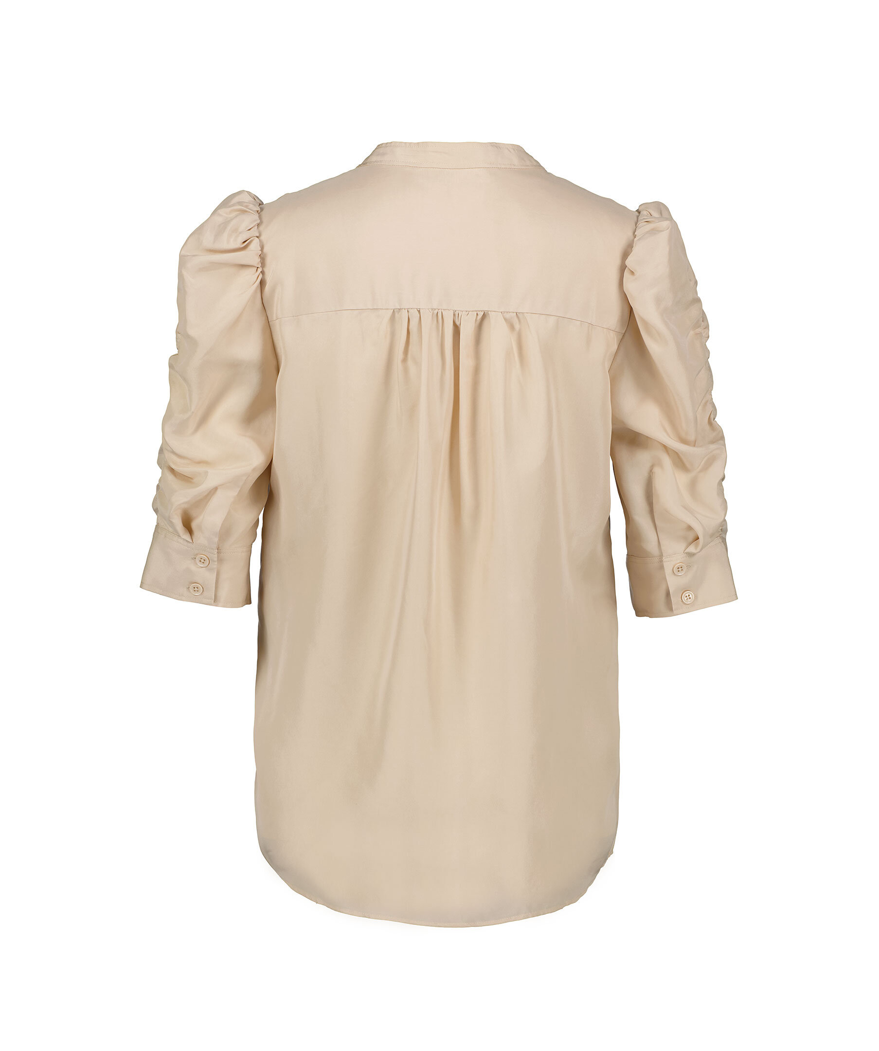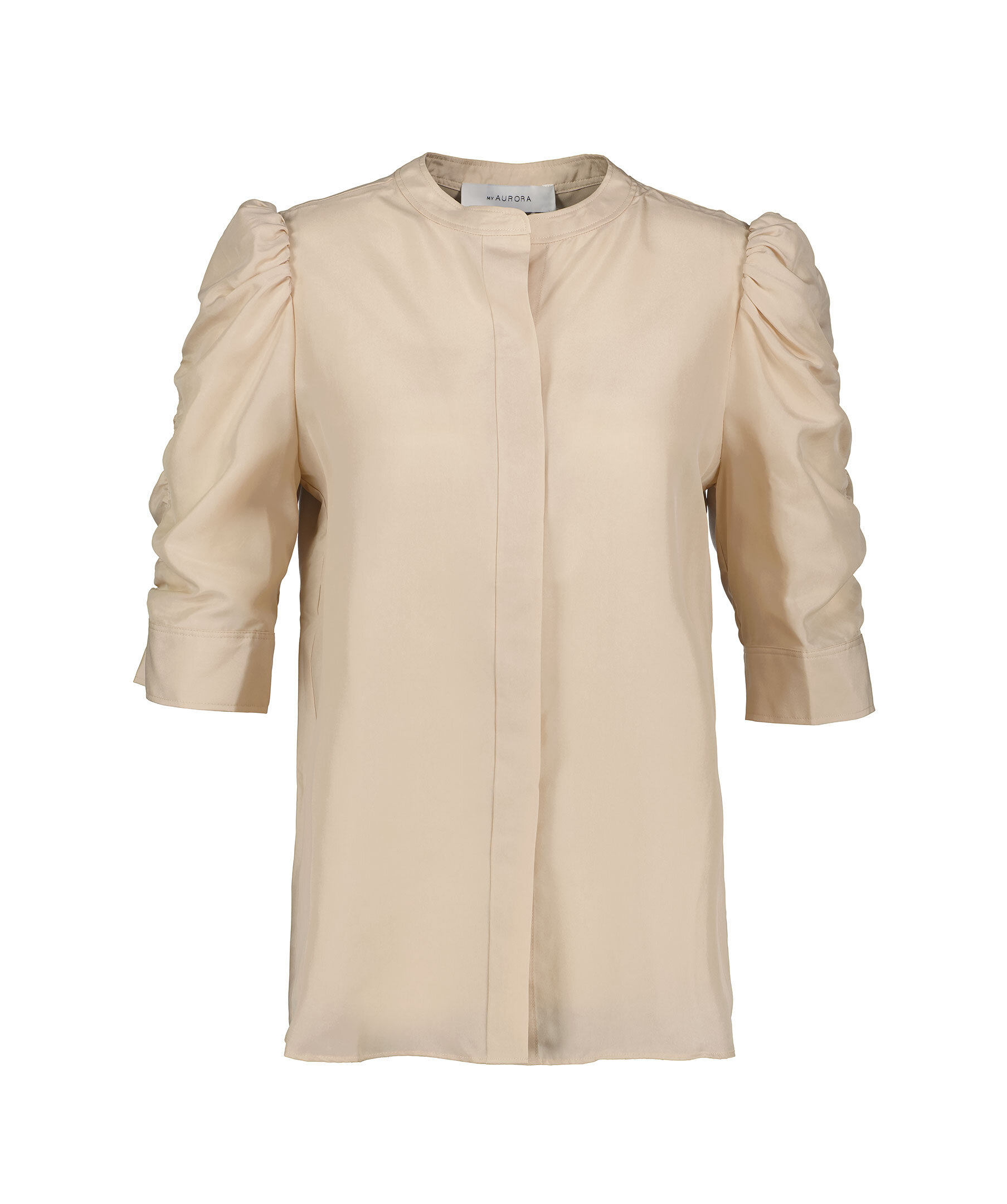 Beige blus från My Aurora. Puffärmar med volang-söm. Ärmarna slutar strax ovan armbågen. Ärmslut med manschetter. Blusen stängs framtill dolda knappar. Tillverkad i 100% silke.