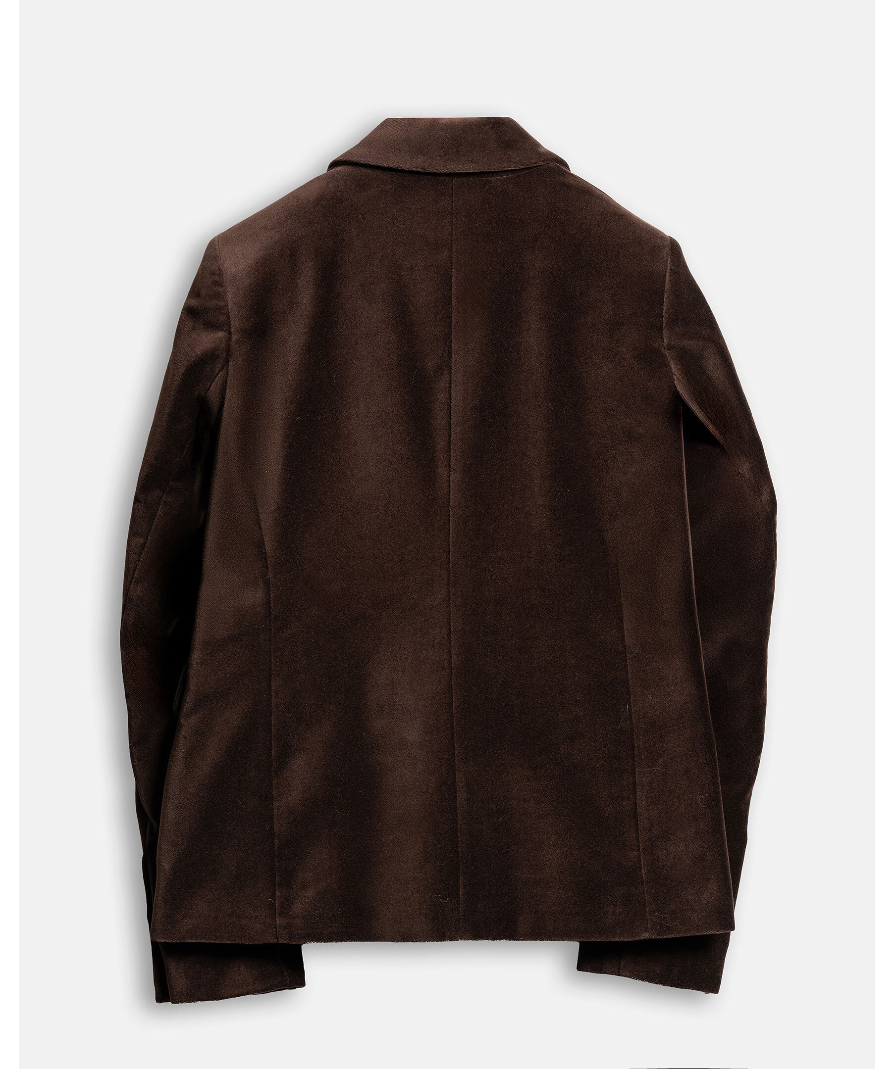 Brun dubbelknäppt blazer i sammet från My Aurora. Kavajen har utanpåliggande fickor och dekorativa guldfärgade knappar.