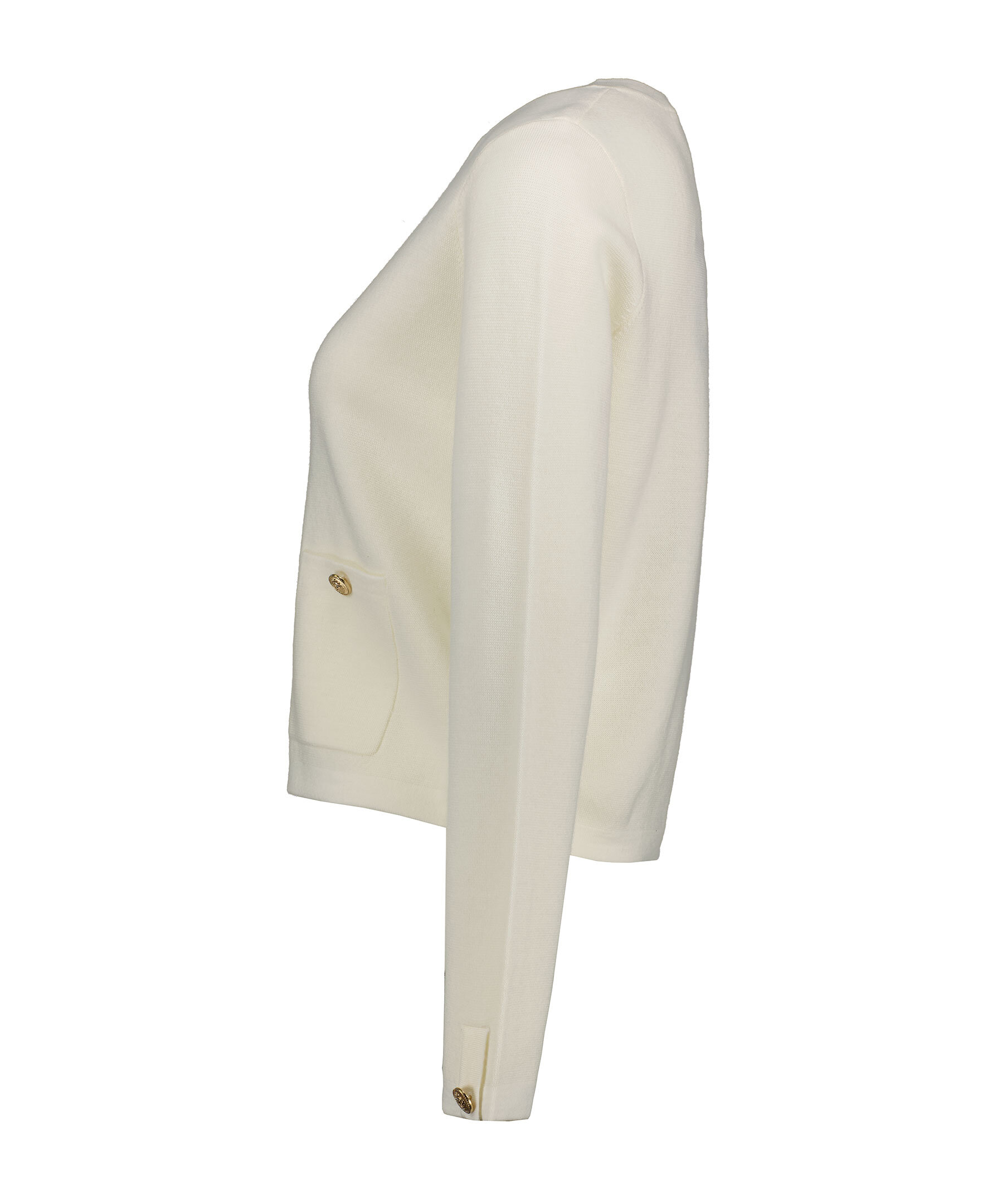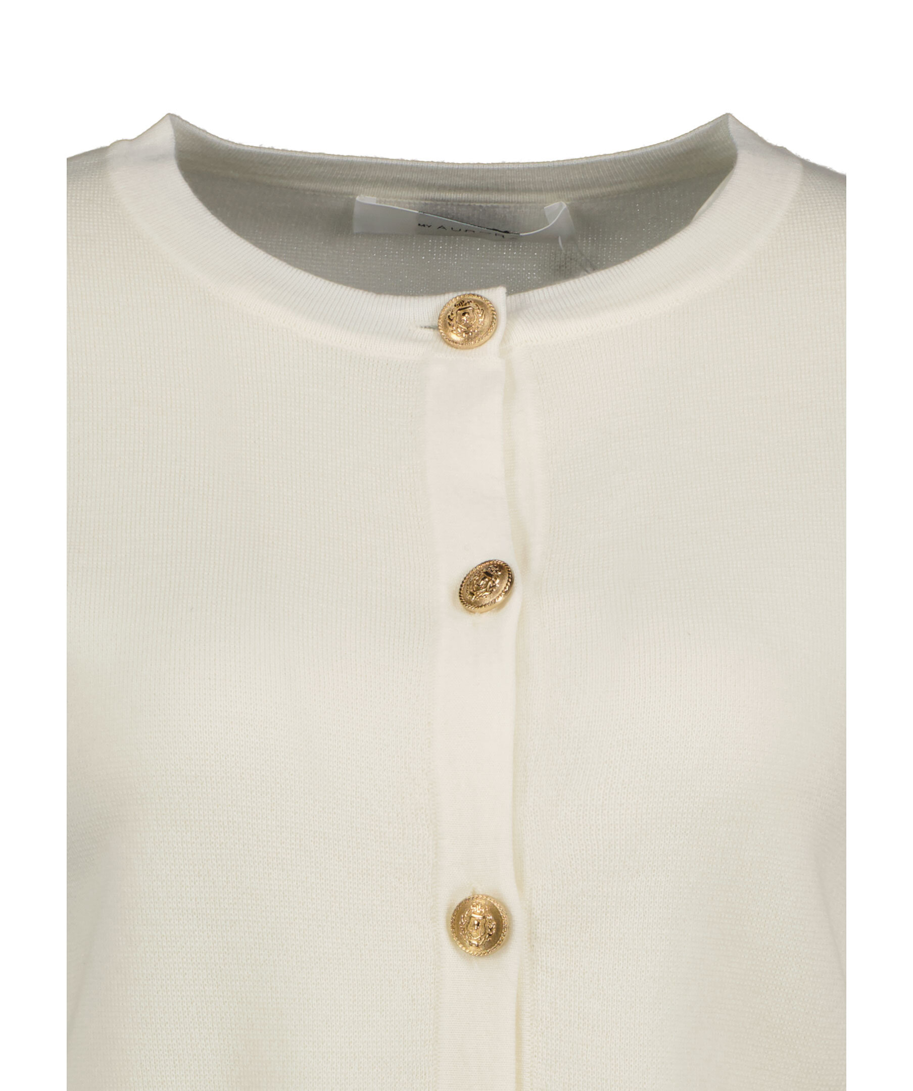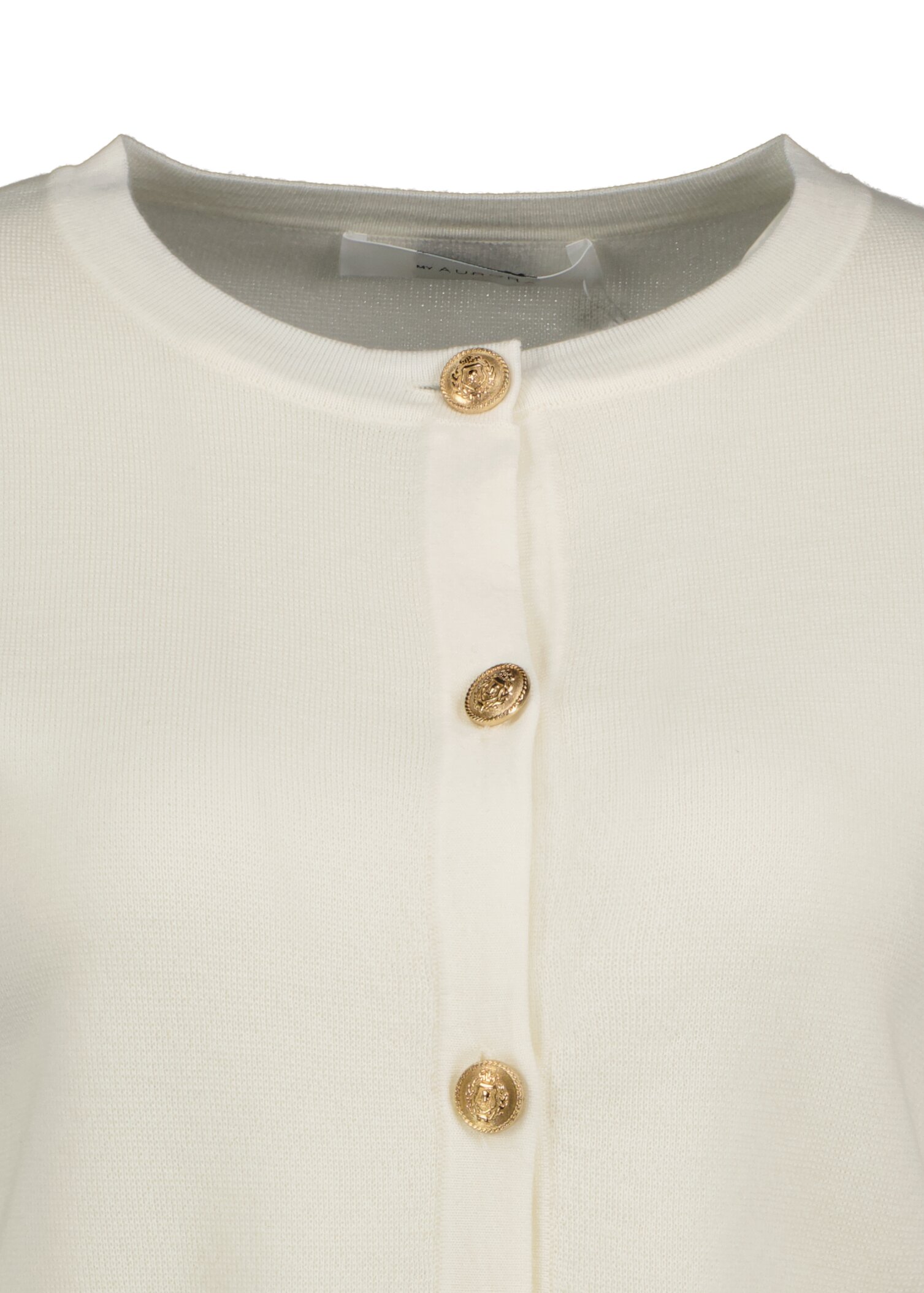 Krämvit, finstickad kofta från My Aurora. Koftan stängs med dekorativa, guldfärgade knappar och har likadana knappar vid fickorna och ärmslut. Tillverkad i merinoull.
