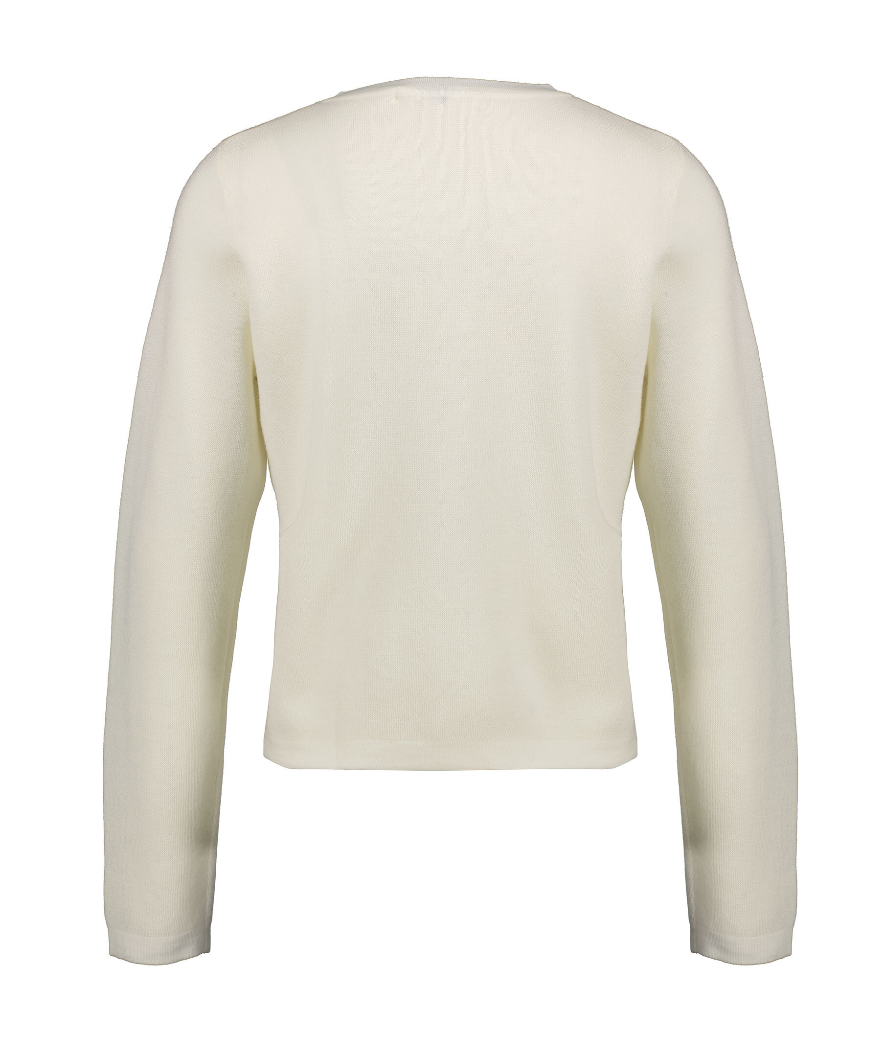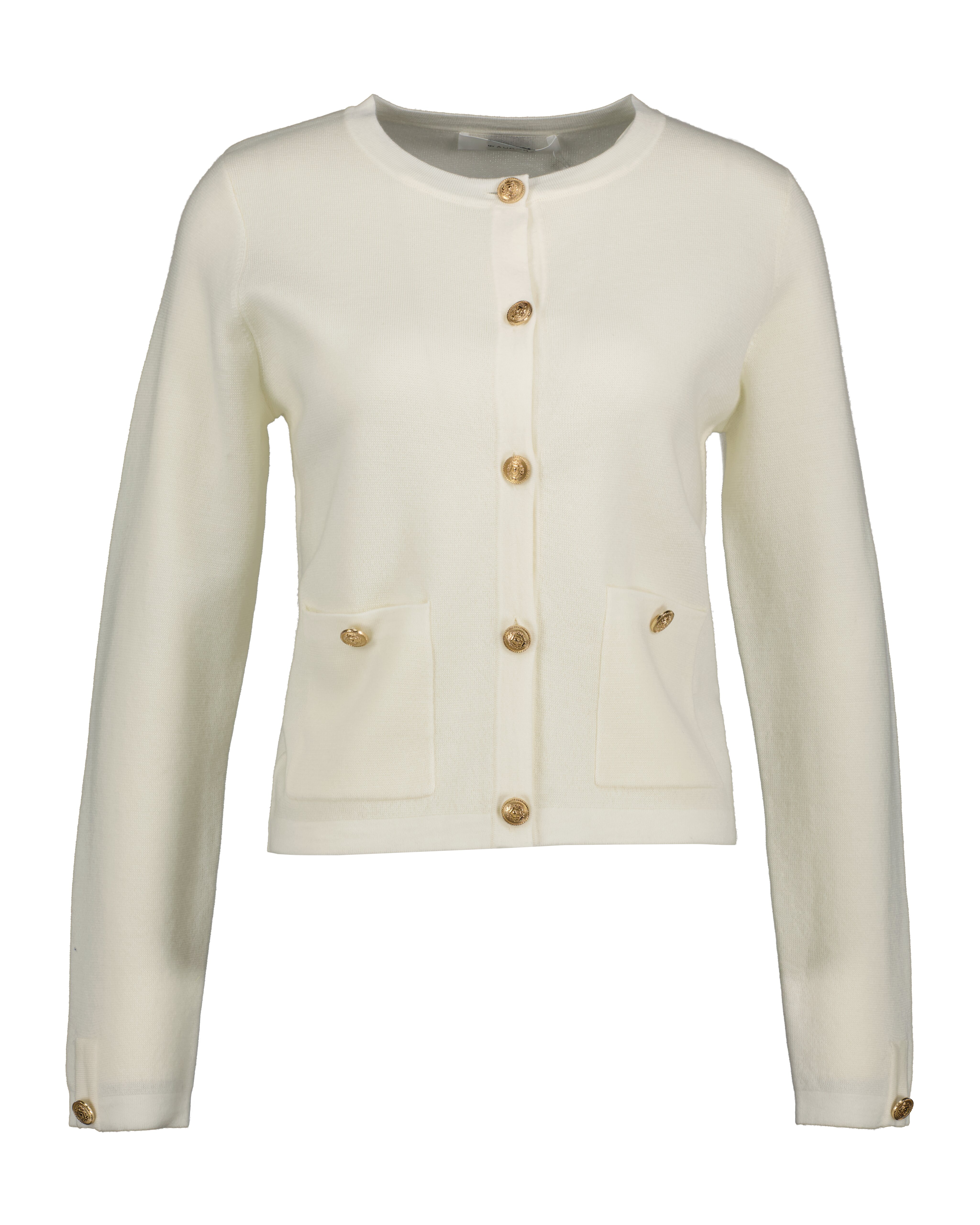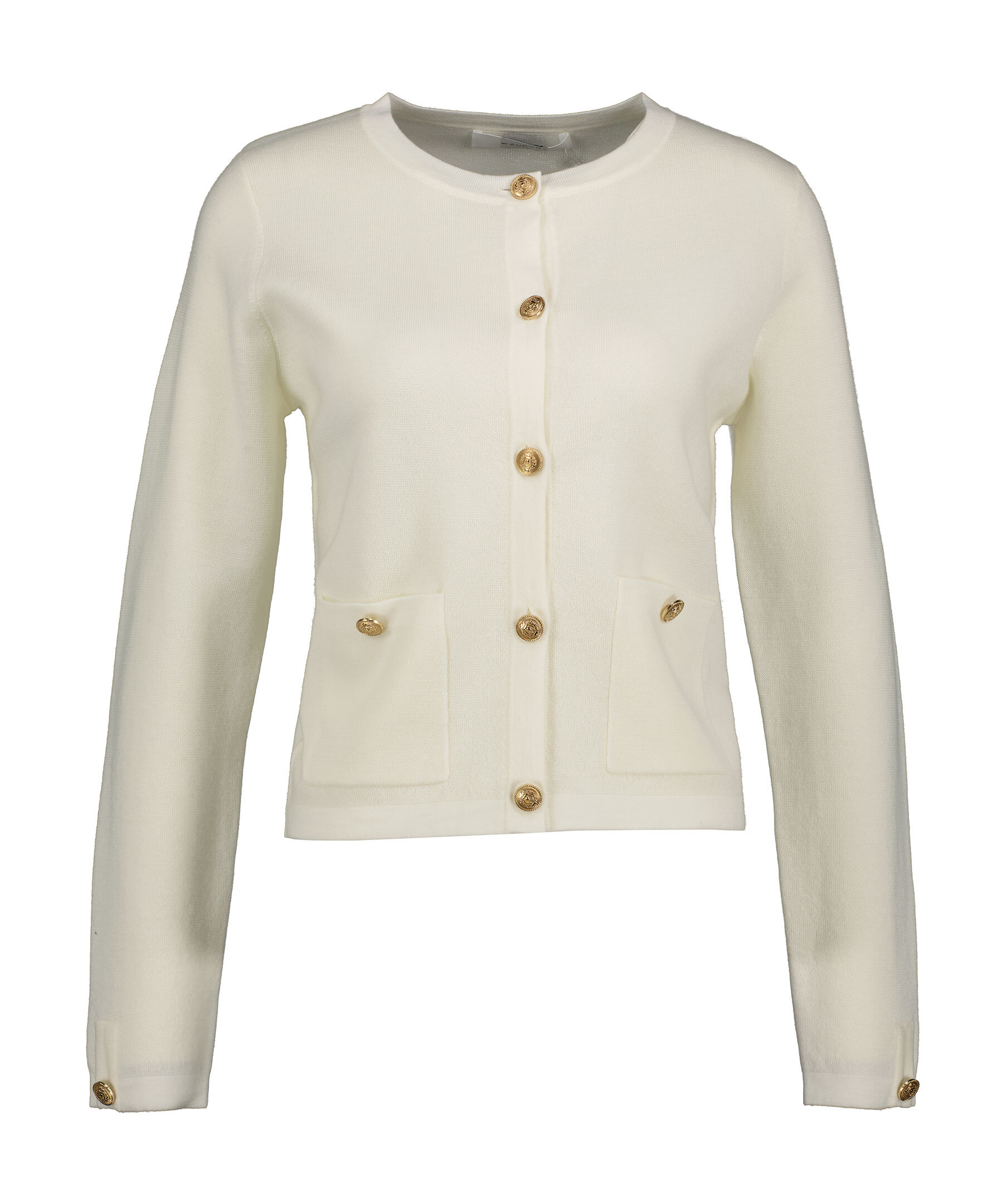 Krämvit, finstickad kofta från My Aurora. Koftan stängs med dekorativa, guldfärgade knappar och har likadana knappar vid fickorna och ärmslut. Tillverkad i merinoull.