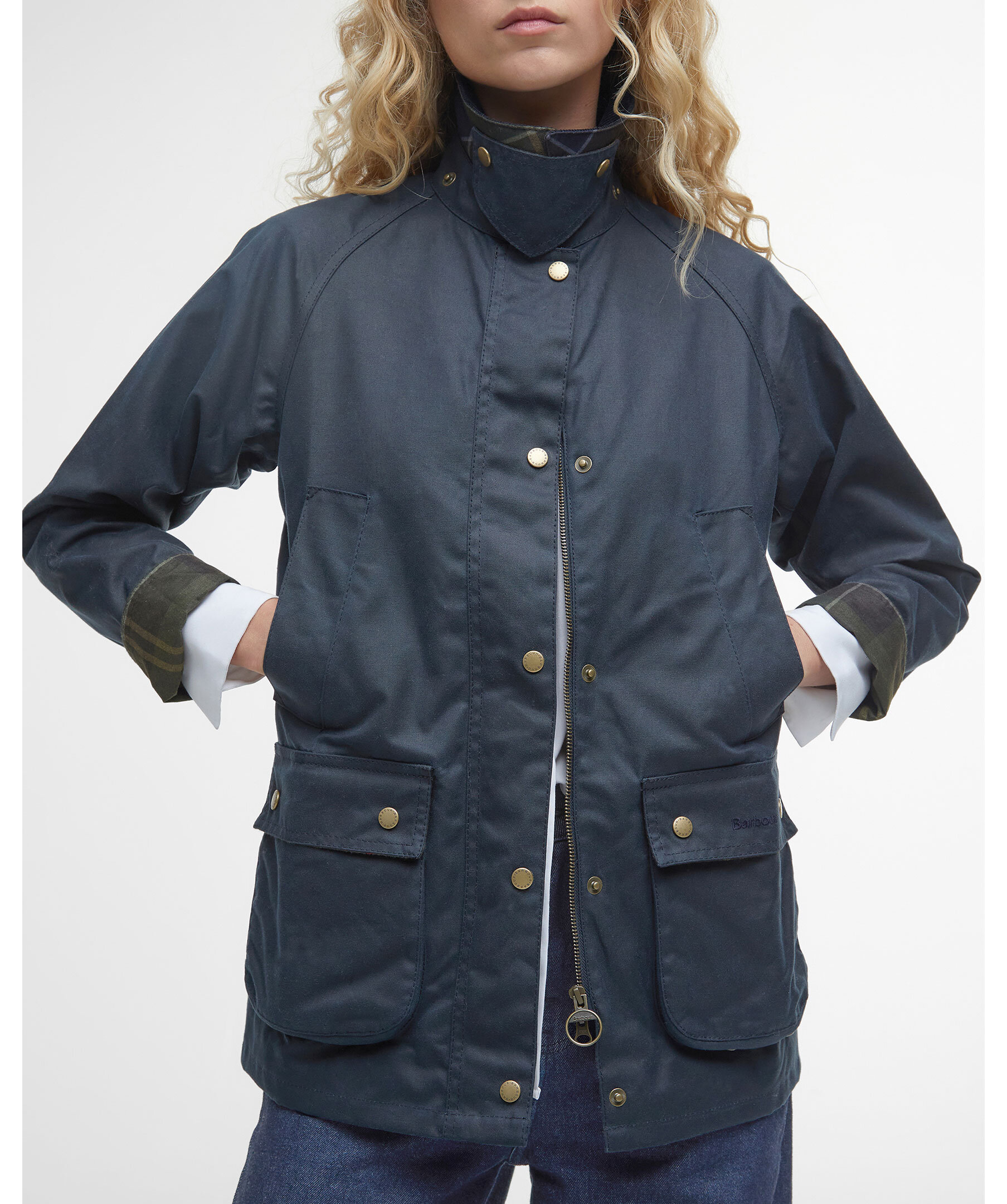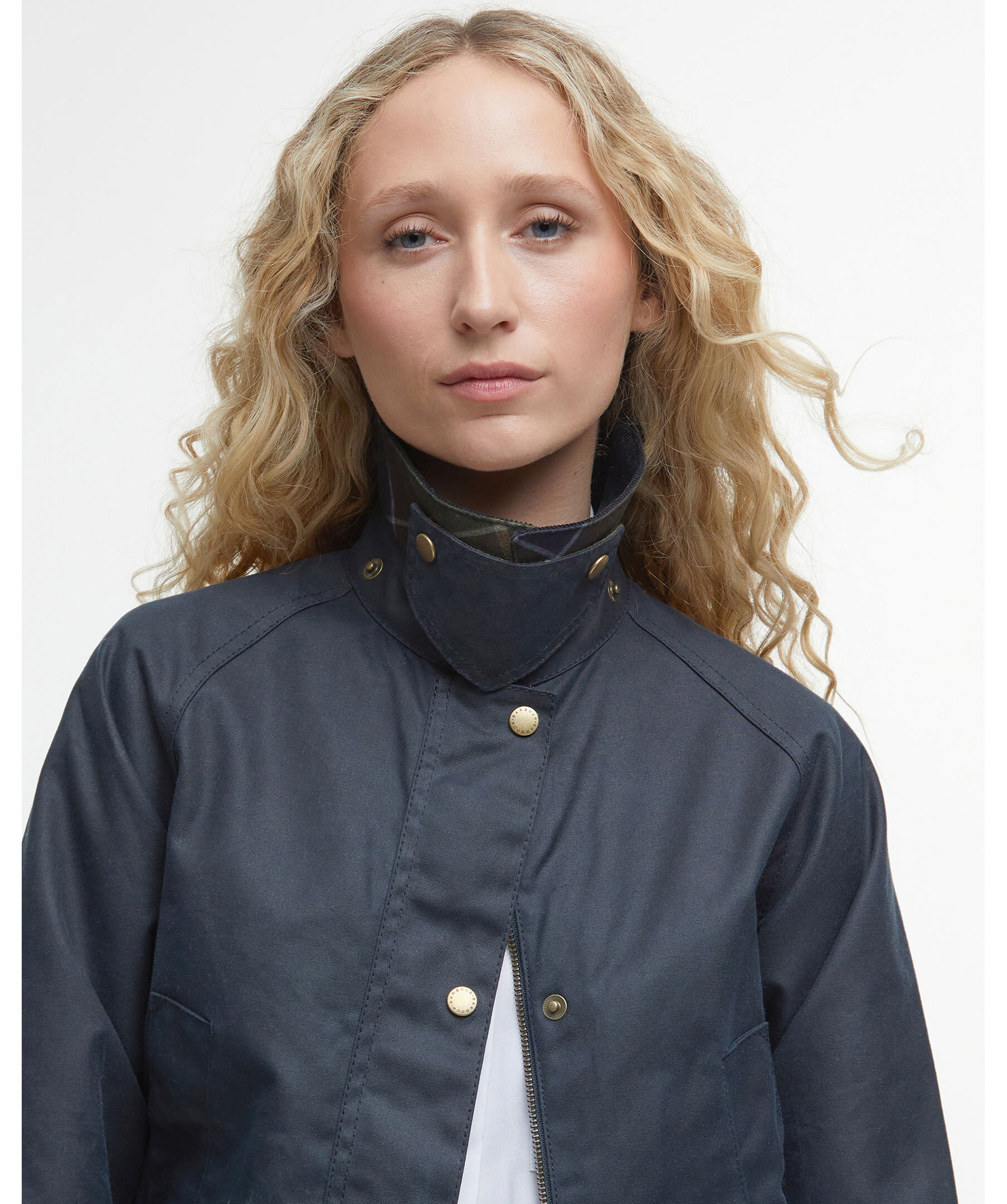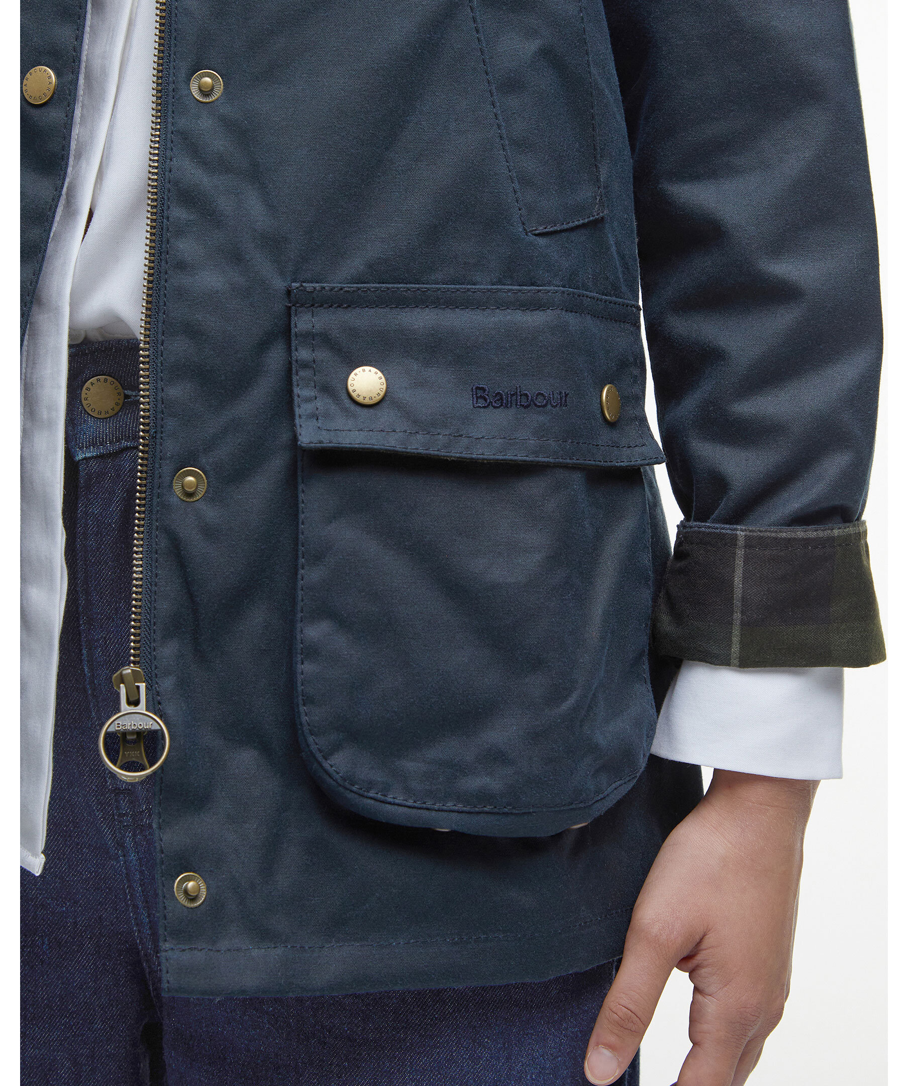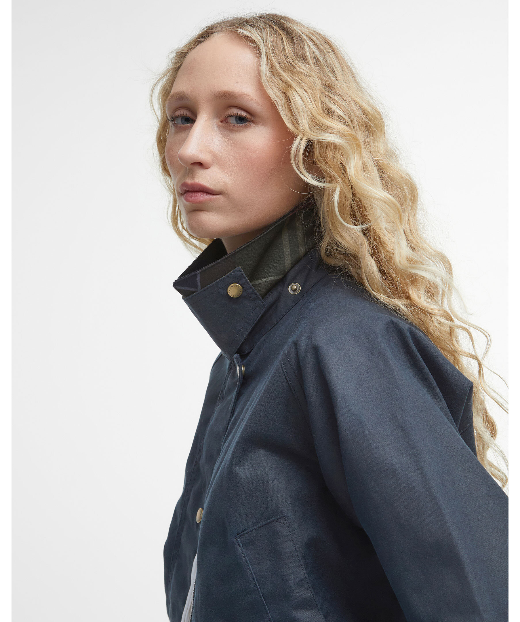 En avslappnad och bekväm jacka tillverkad med ett vaxat yttertyg i bomull och Barbours ikoniska tartan-foder. Karaktäristiska detaljer inkluderar en krage i manchester med halsrem, handvärmarfickor samt nedre påsydda fickor med ton-i-ton Barbour-broderi.
