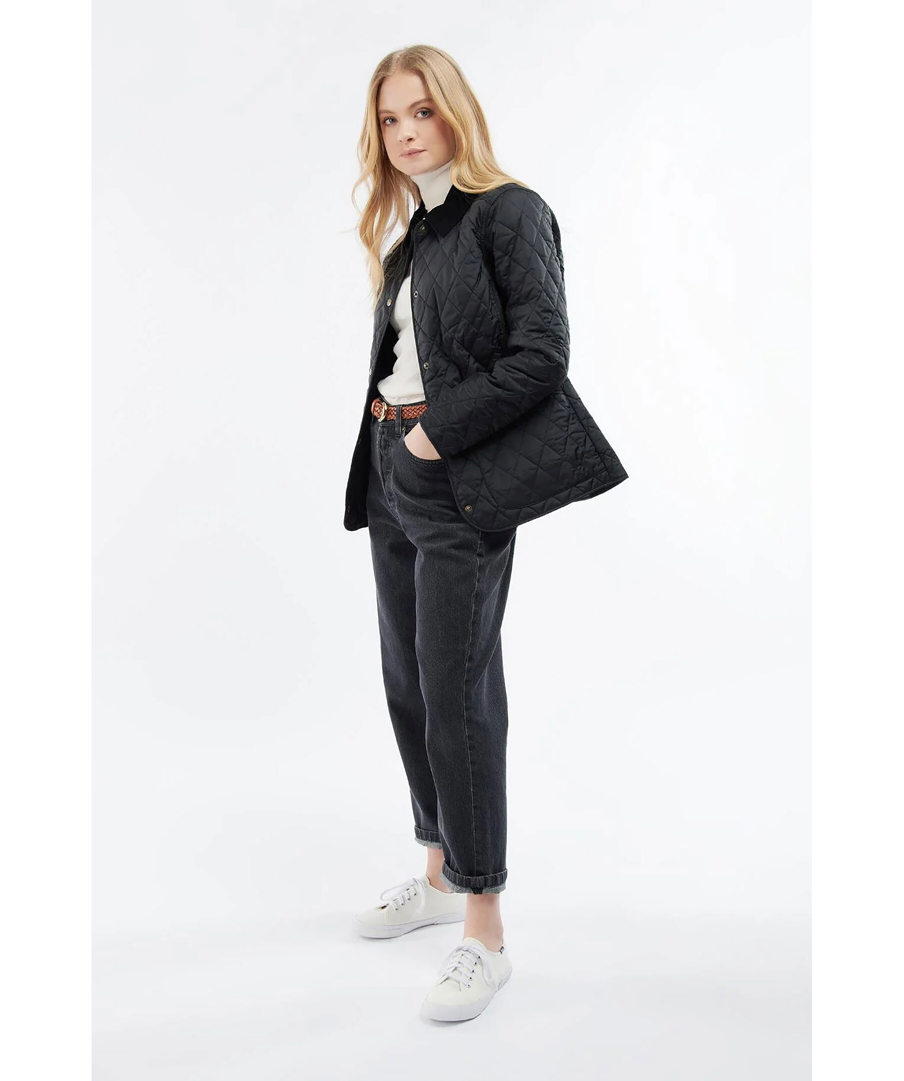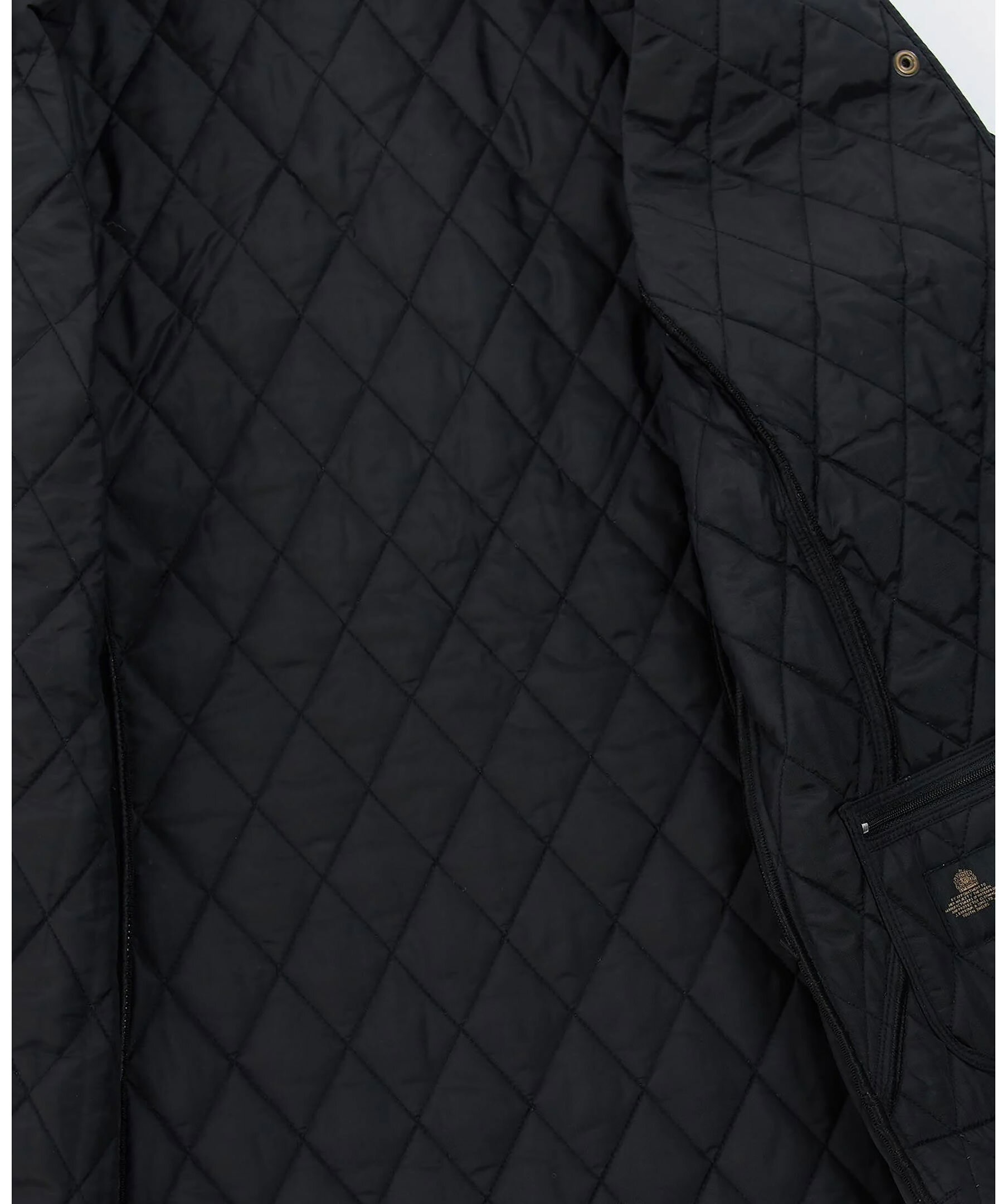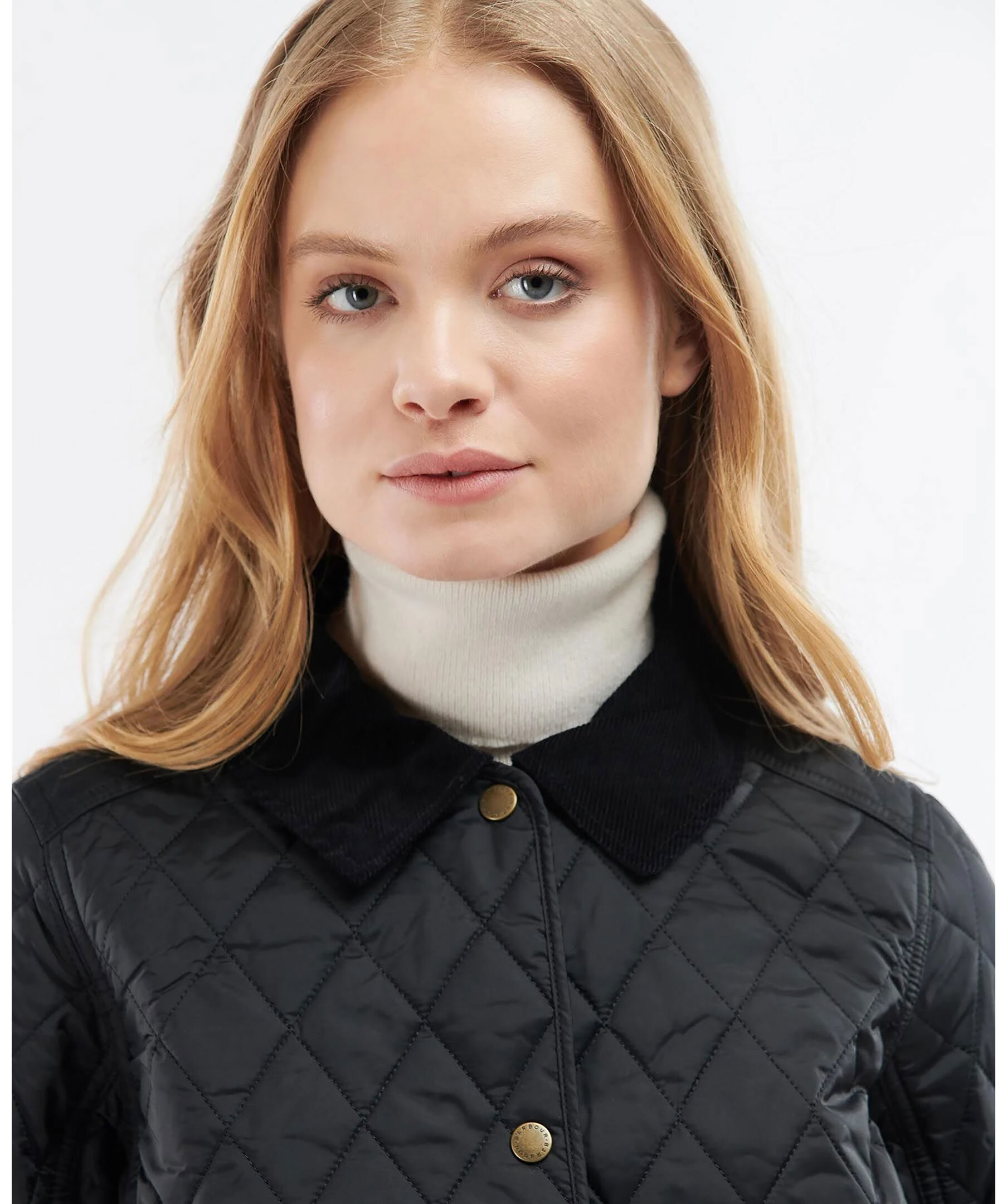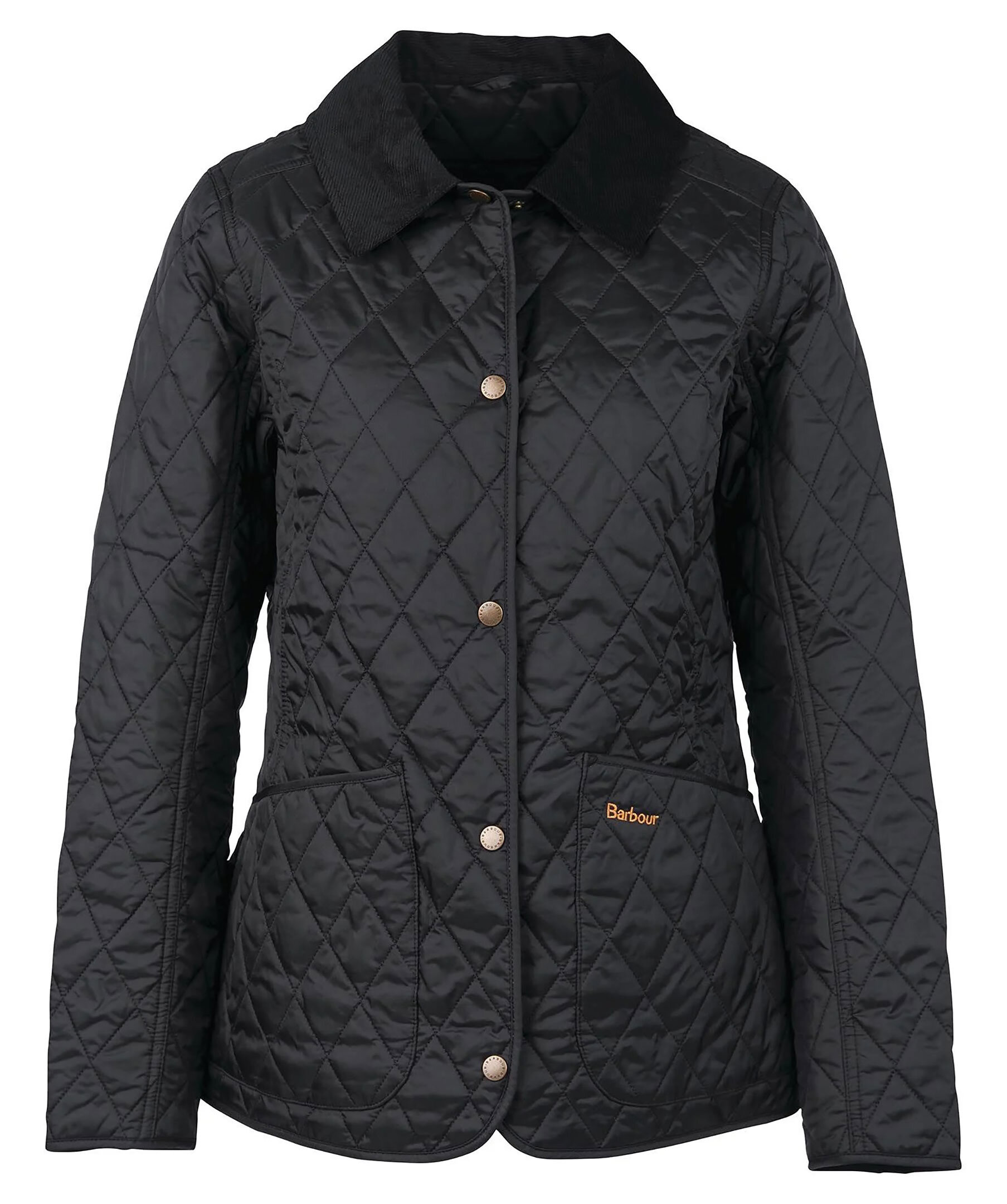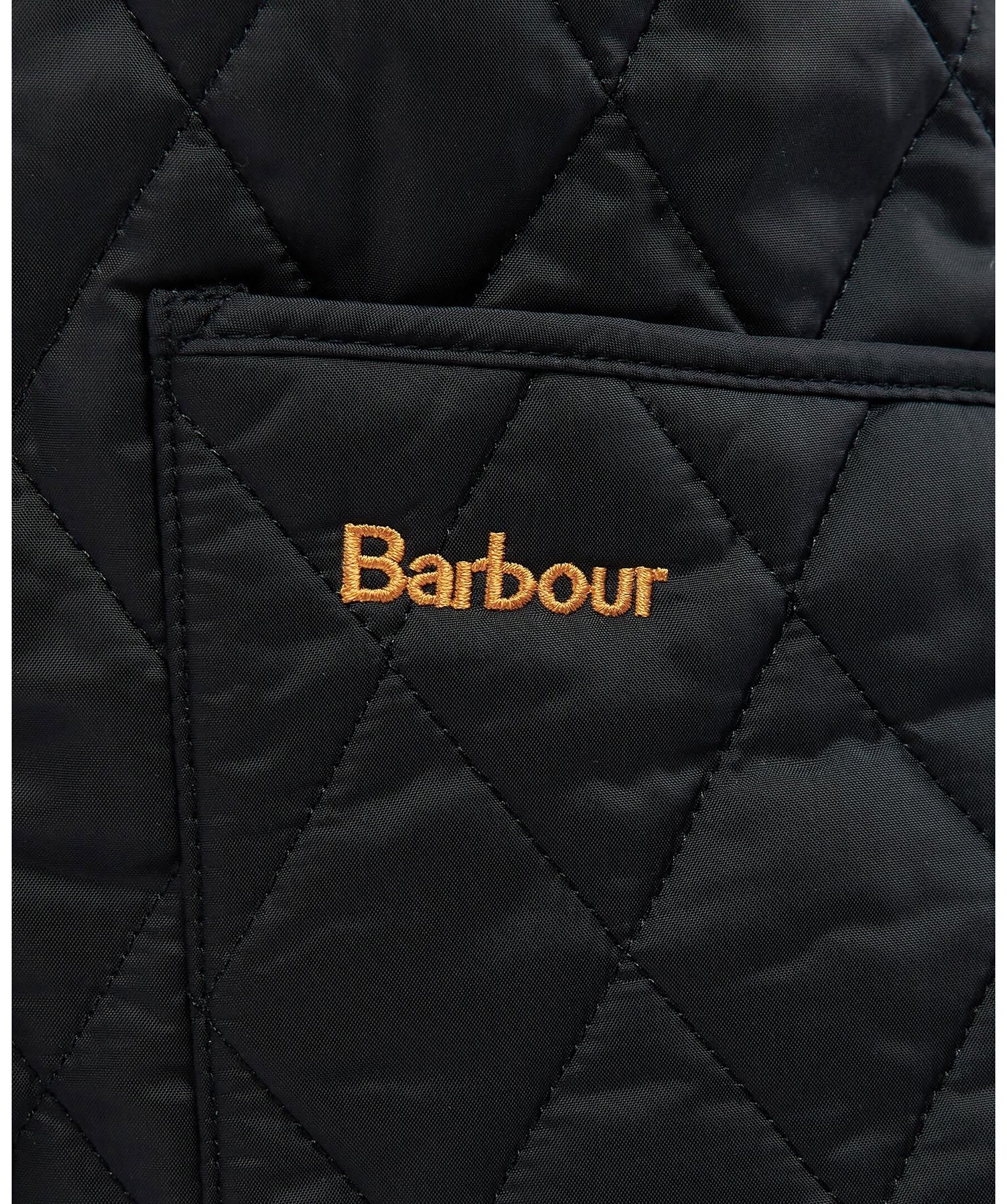 Svart, kviltad jacka med en vackert feminin siluett från Barbour. Spetsig krage med svart manchestertyg på utsidan och diamantkviltat tyg. Stängs med mässingfärgade tryckknappar fram med logotyp, har två öppna framfickor och en liten, broderad logotyp på den vänstra fickan. Rygglängd 67,6-73,6cm.