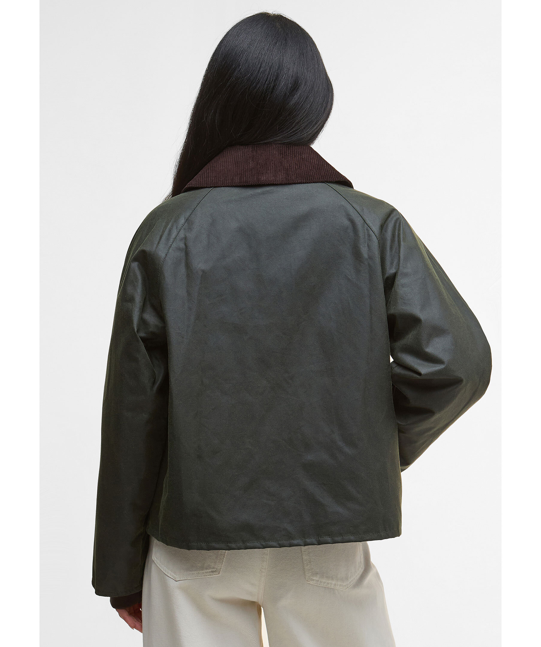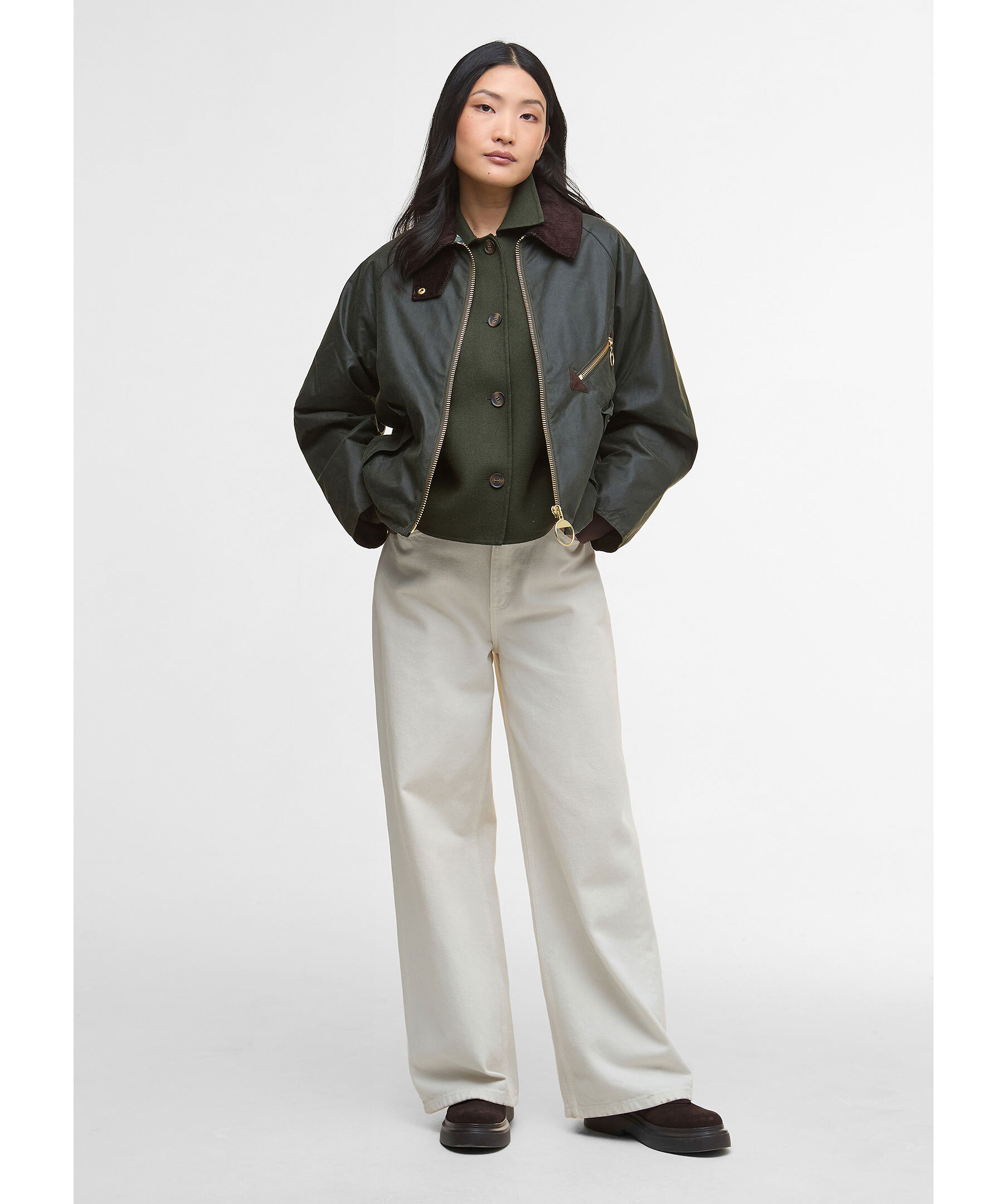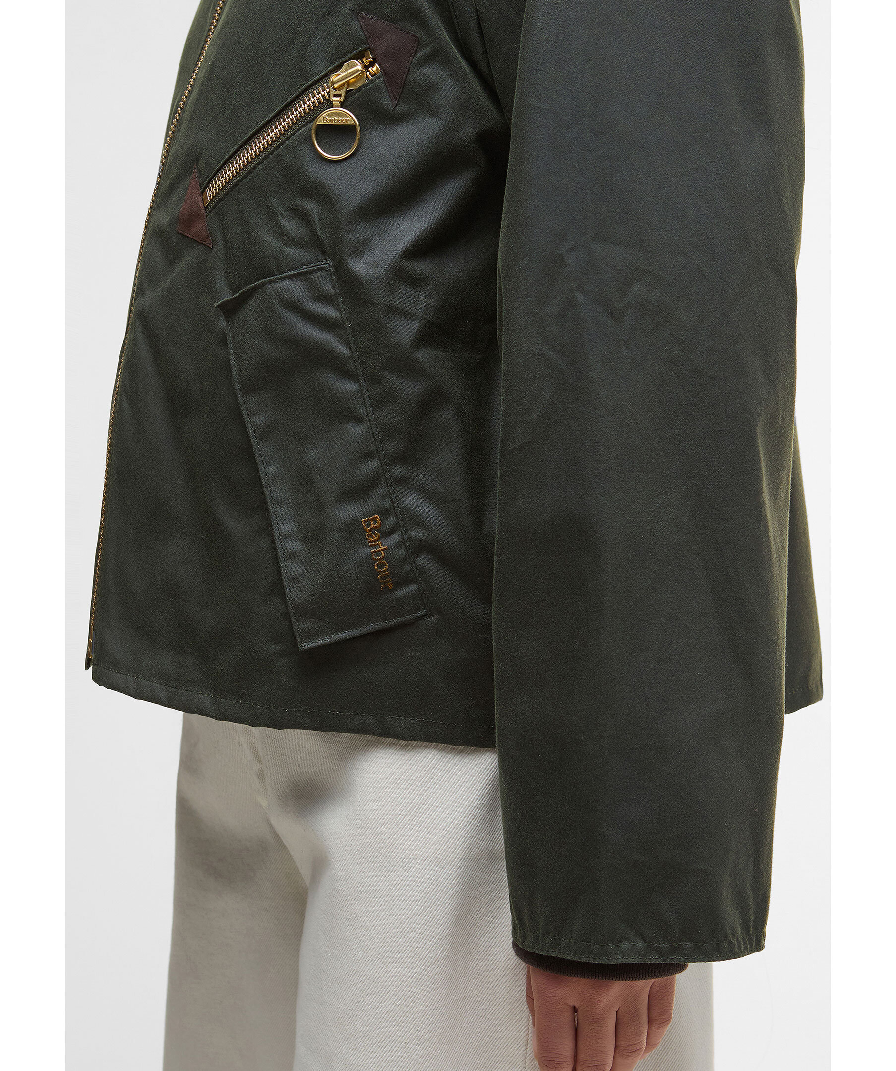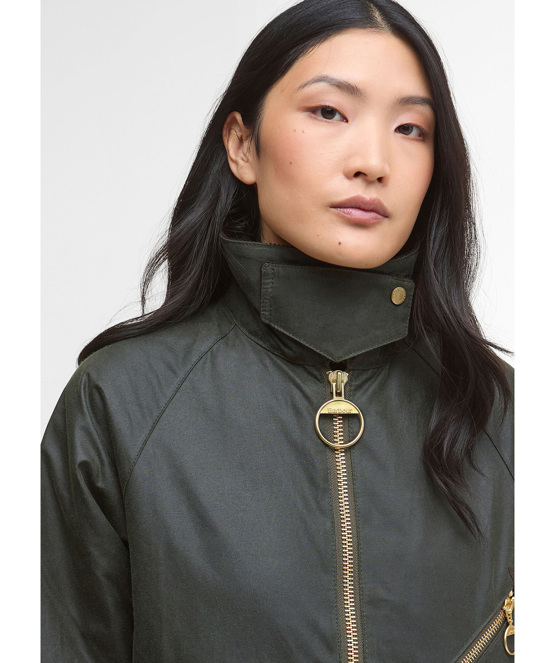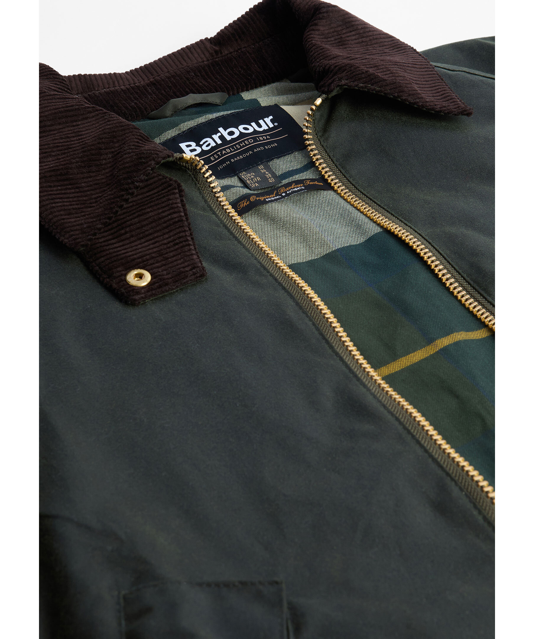 Olivgrön vaxad jacka från Barbour. Jackan stängs med dragkedja och har manchesterkrage, muddar vid ärmslut, två sidfickor samt en snedställd ficka med dragkedja. Kragen går att vika upp och västa för att skydda mot kallare vindar. Tillverkad i vaxad bomull.