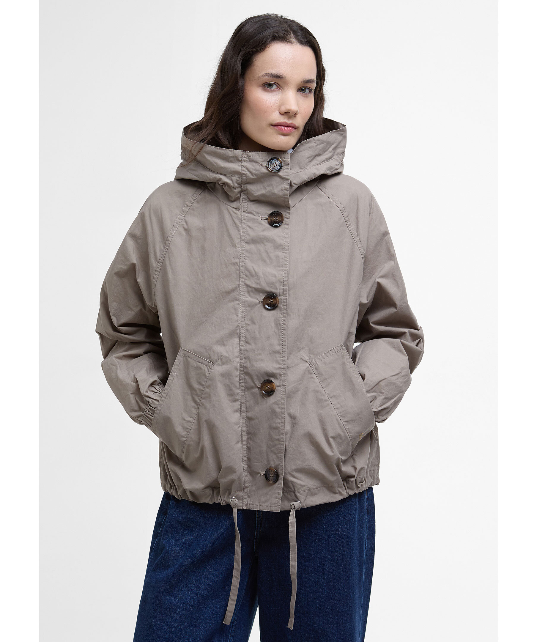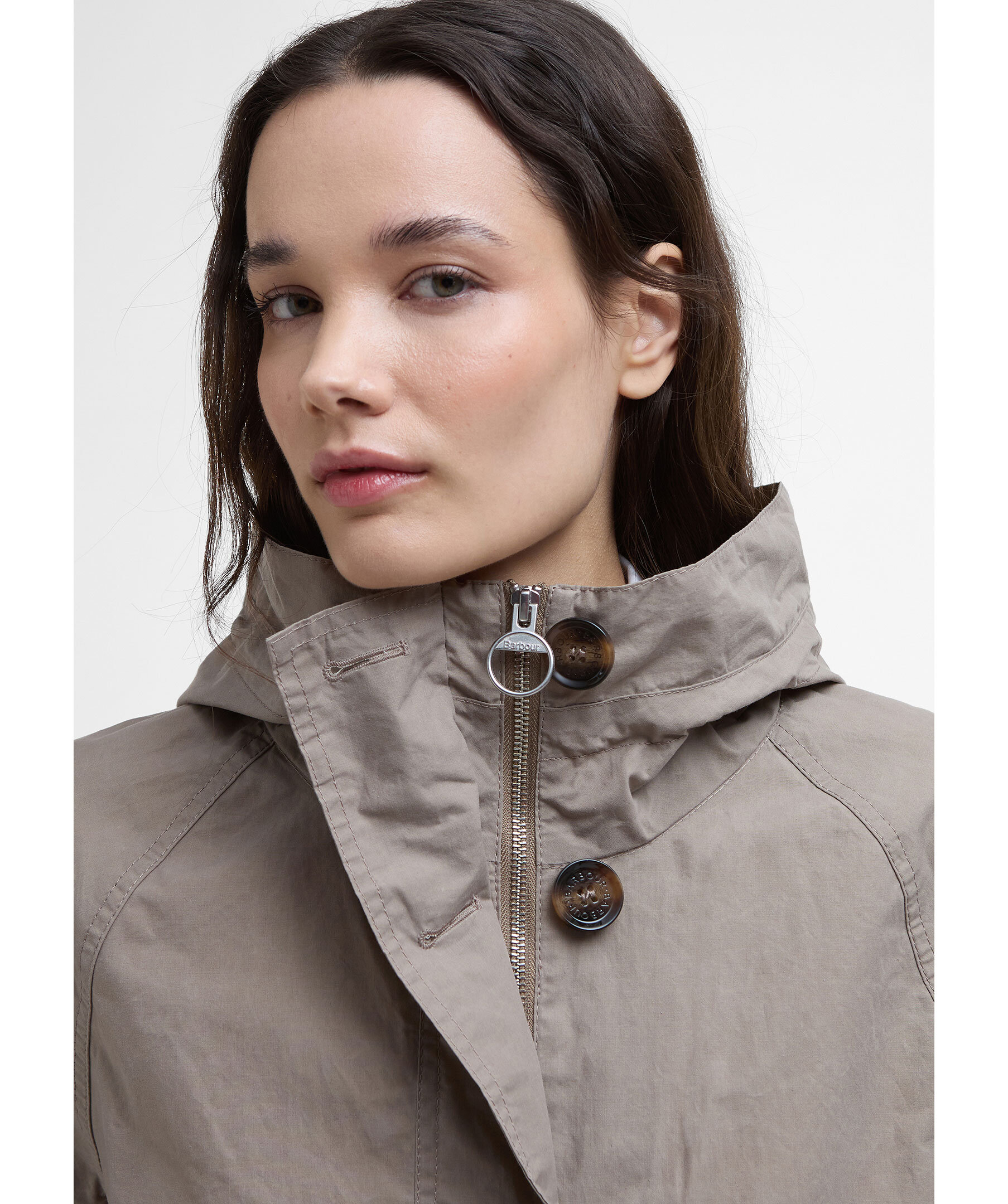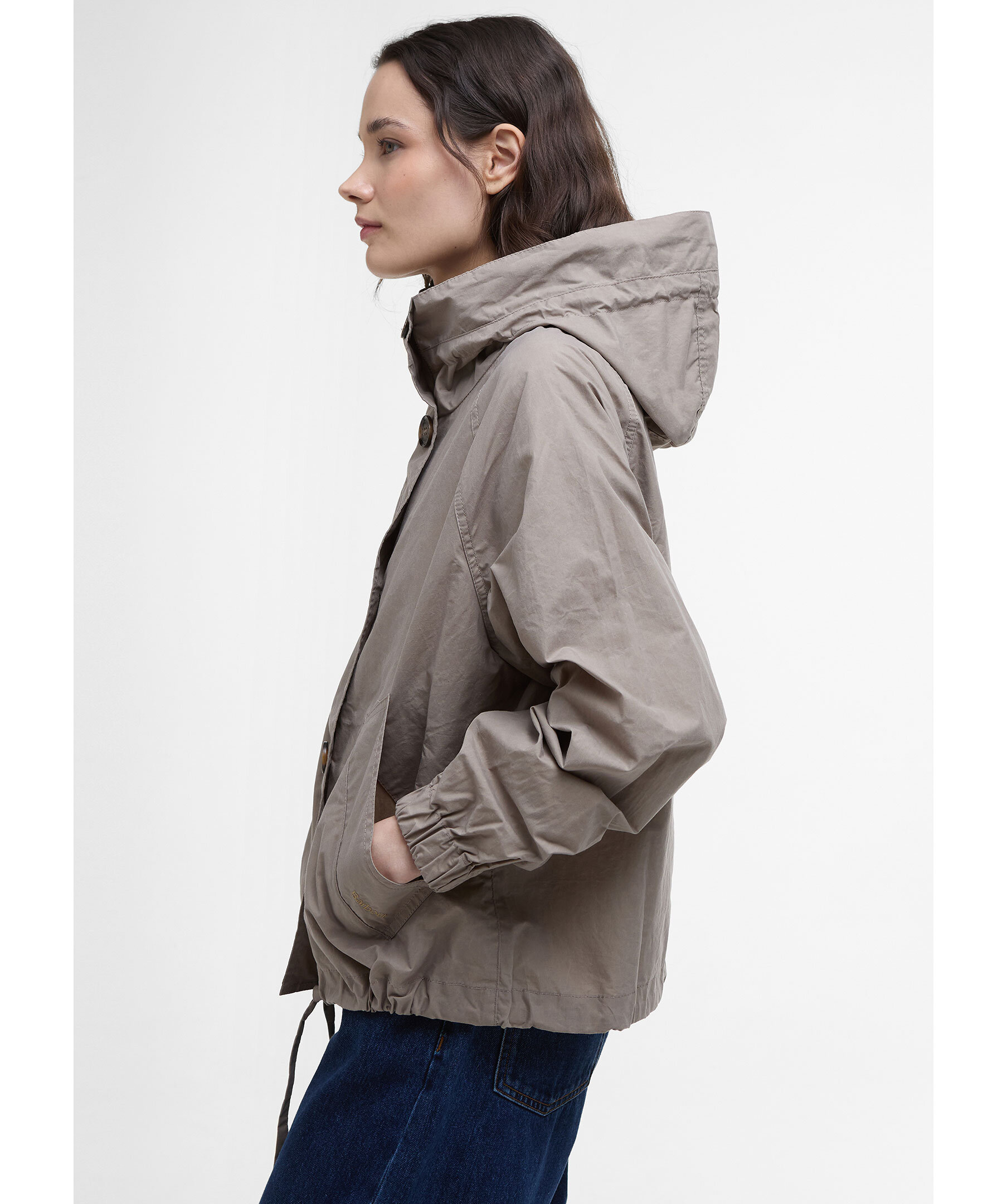 Brun vattenavvisande jacka från Barbour. Jackan har en stor huva med hög krage. Stängs med dragkedja och knappar fram. Justerbar i midjan och har mudd vid ärmsluten. Två sidofickor och två innerfickor. Tillverkad av bomull.