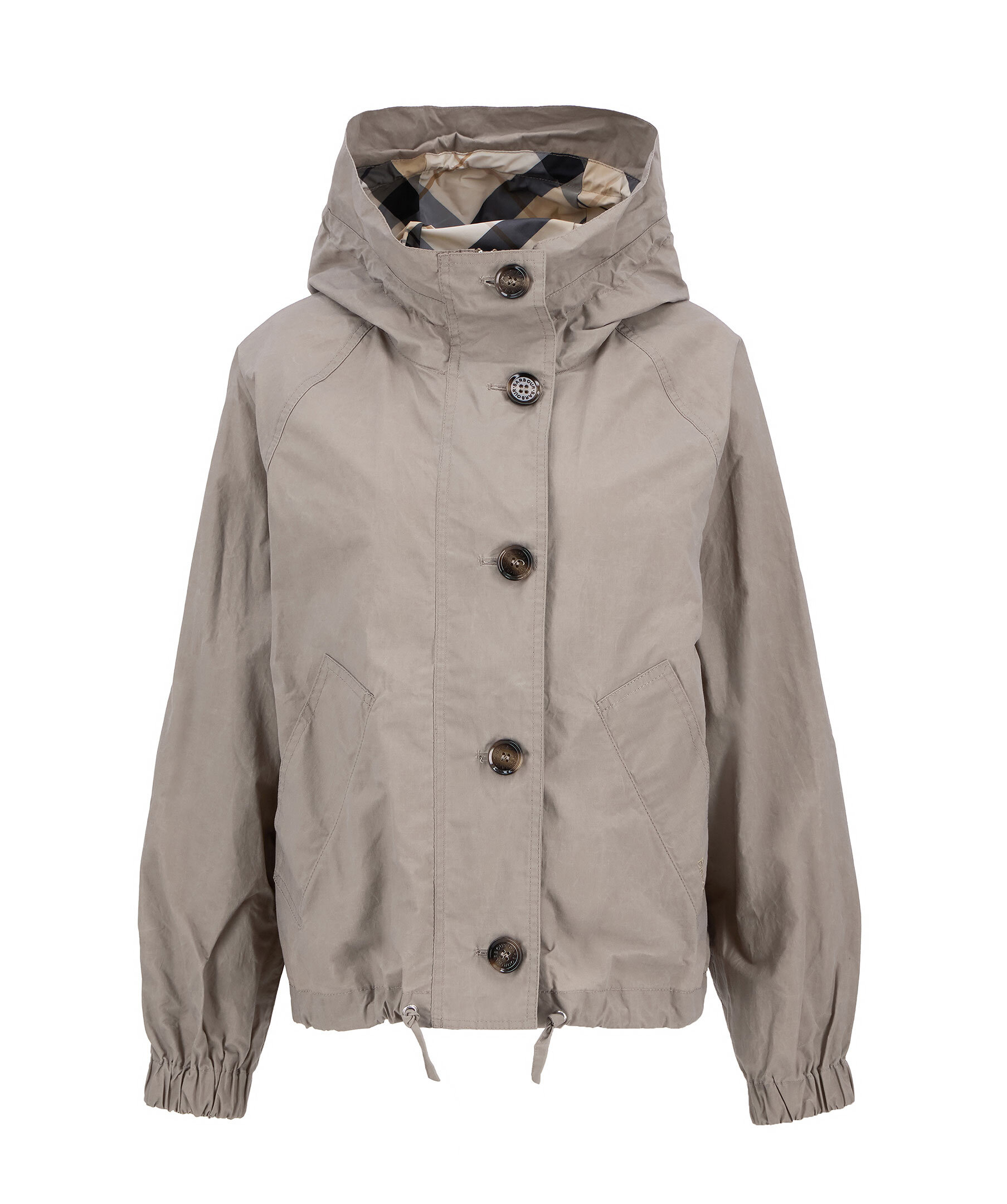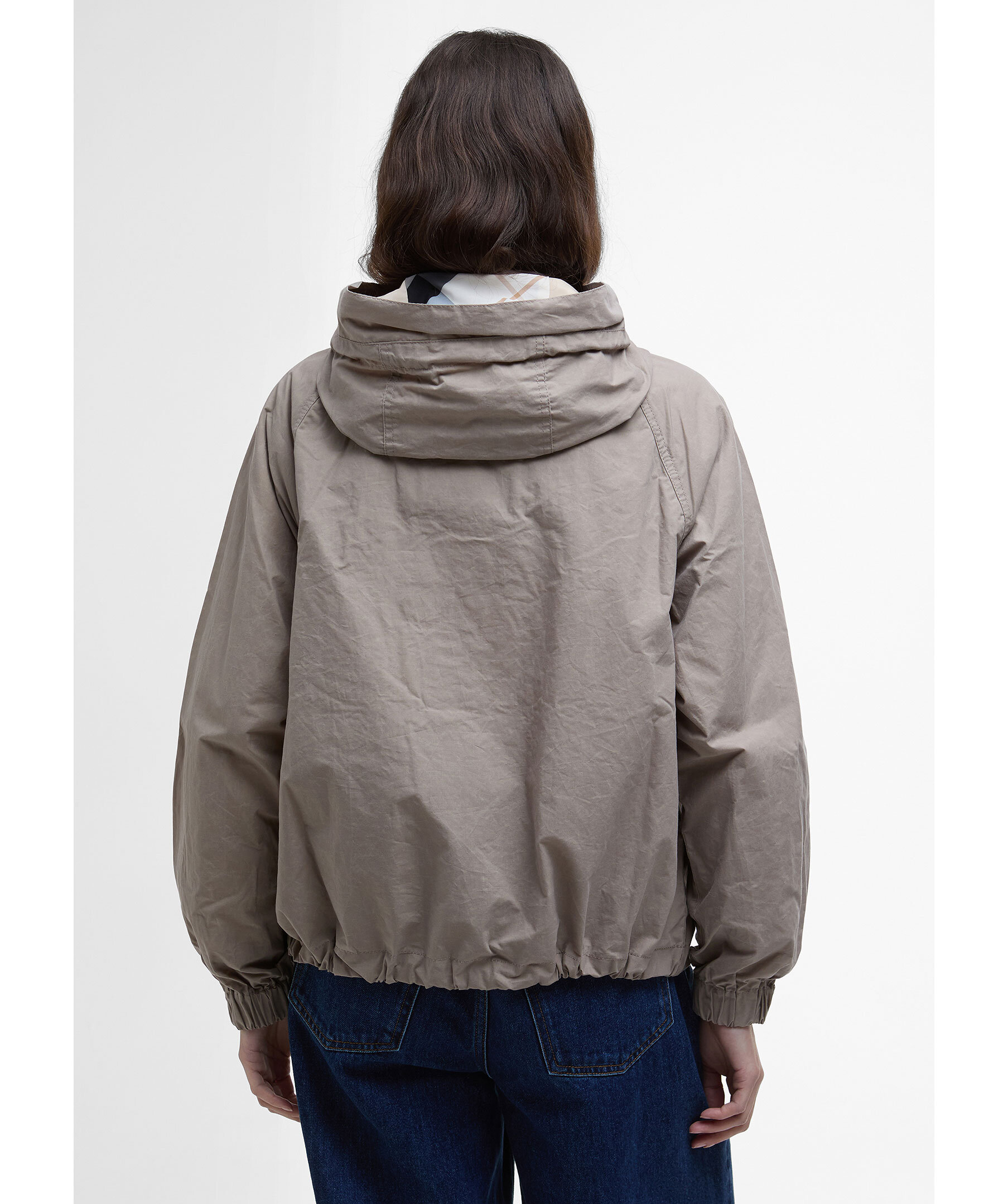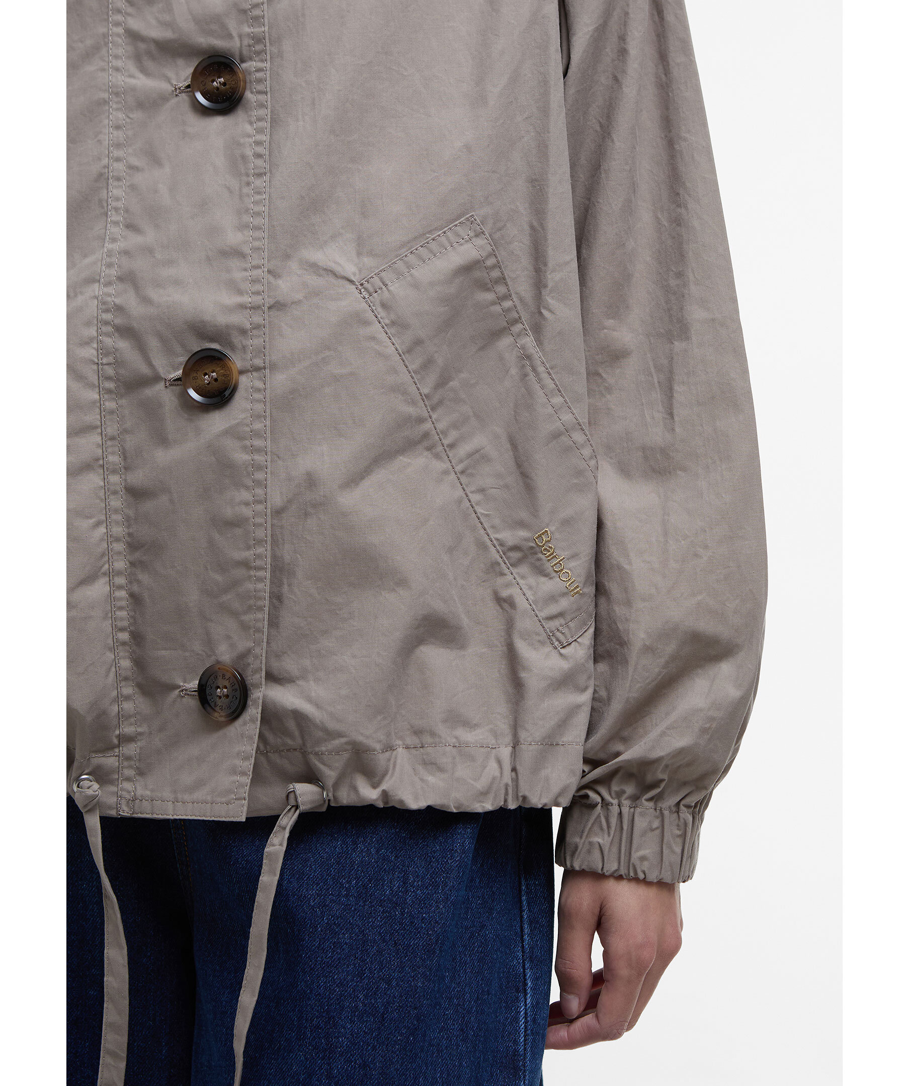 Brun vattenavvisande jacka från Barbour. Jackan har en stor huva med hög krage. Stängs med dragkedja och knappar fram. Justerbar i midjan och har mudd vid ärmsluten. Två sidofickor och två innerfickor. Tillverkad av bomull.
