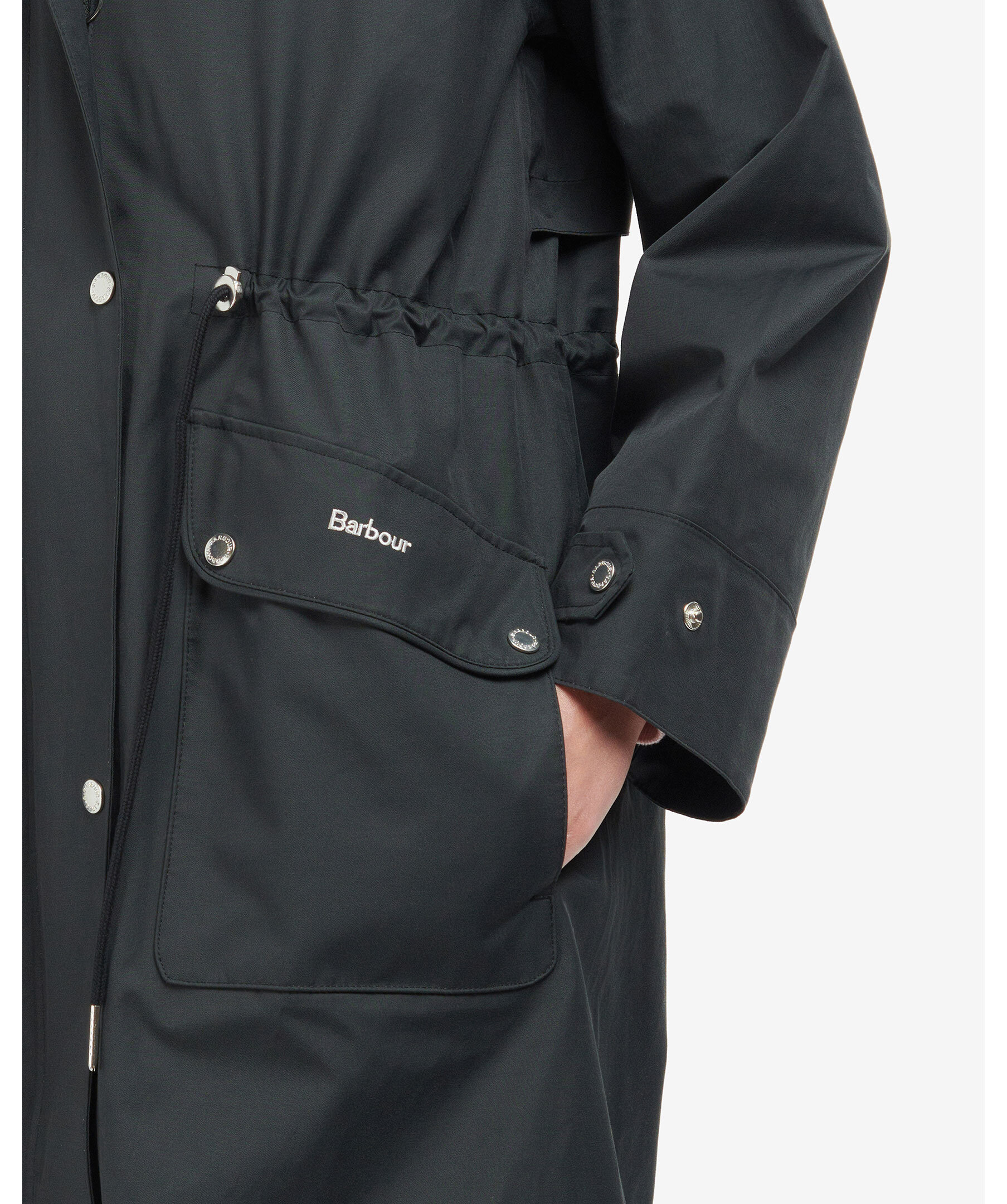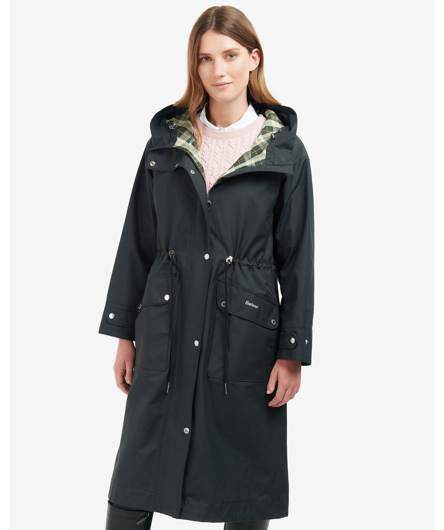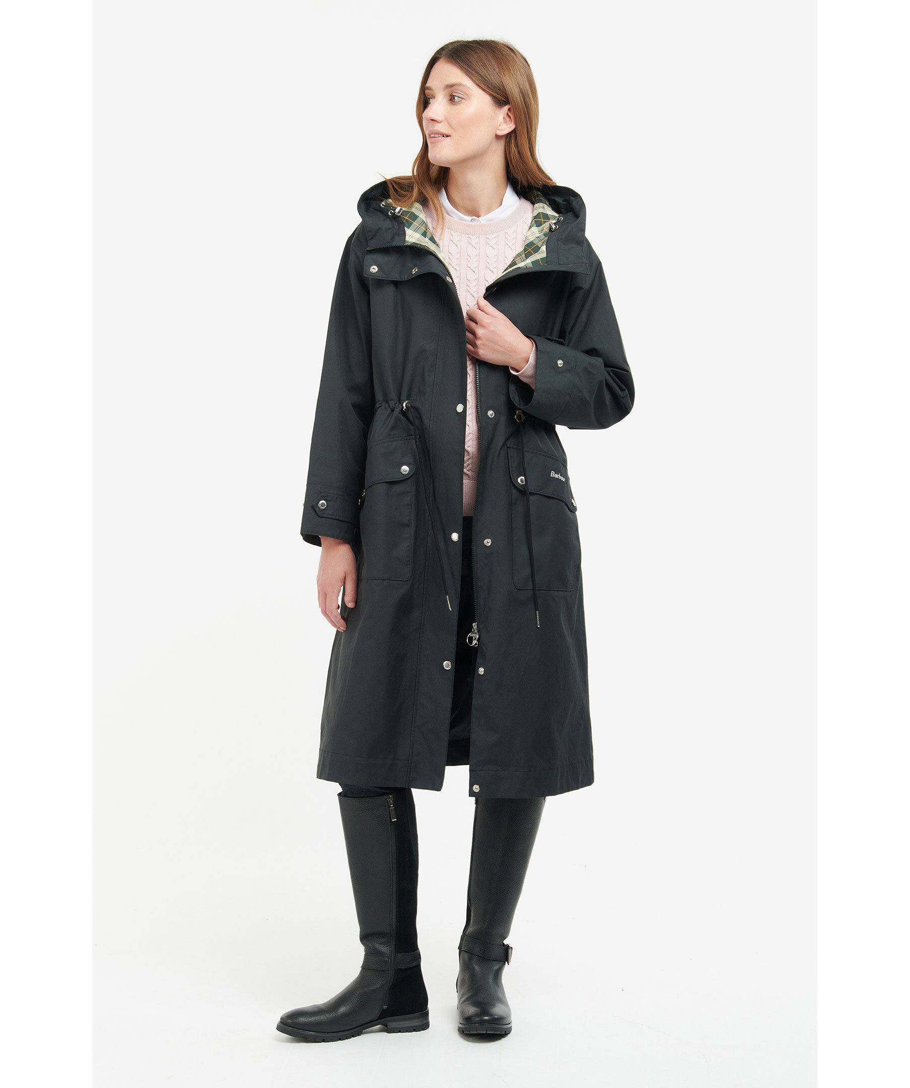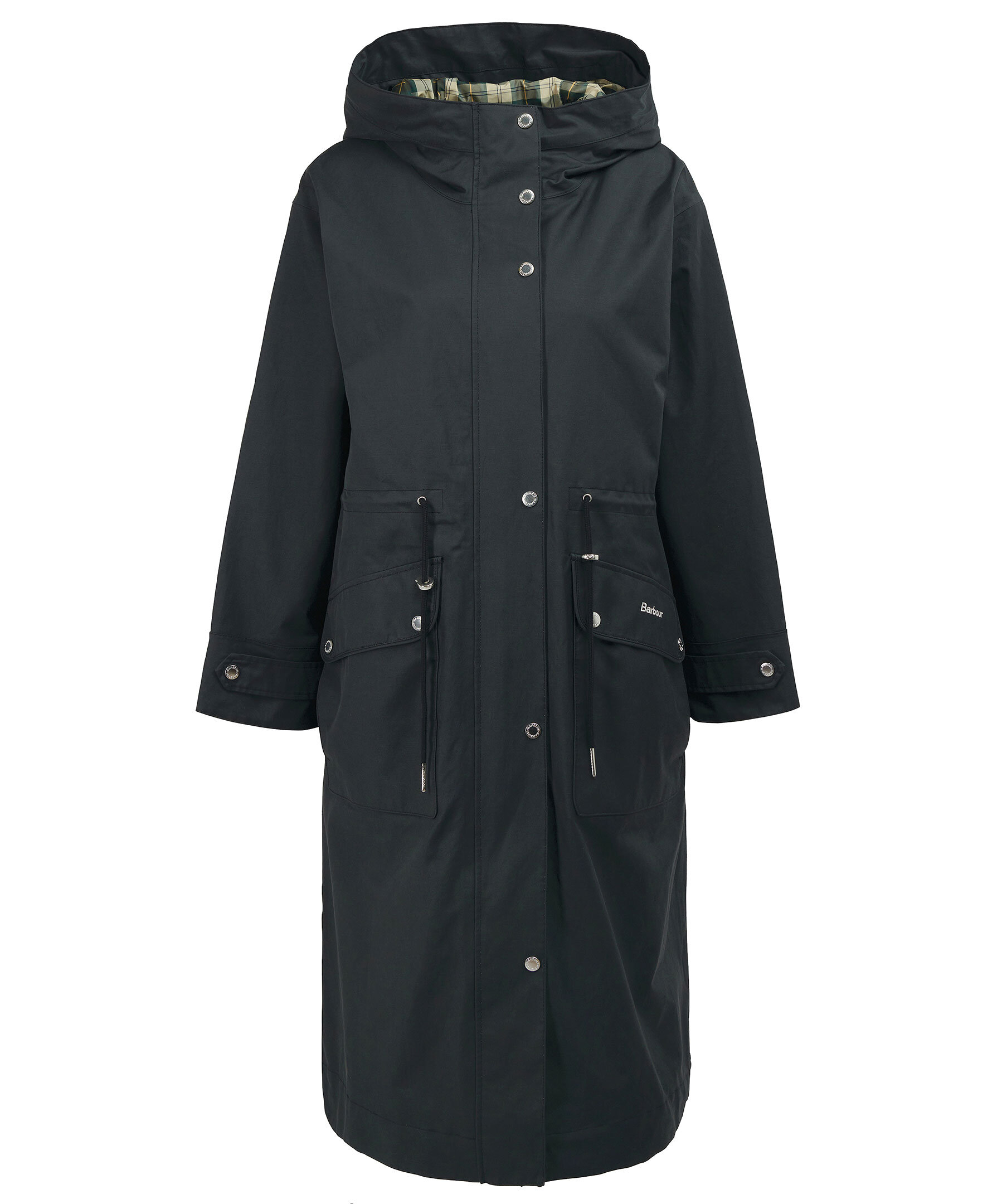 Svart, lång parkas från Barbour. Luva med hög krage och dragsko och en fin siluett som kan justeras med dragsko i midjan. Vattentät exteriör, tartanfoder, stängs med dold dragkedja och tryckknappar fram samt har tryckknappar som justerar ärm vidden i ärmsluten. Framfickor med ficklock och tryckknappar och en liten, broderad logotyp på vänster framficka.