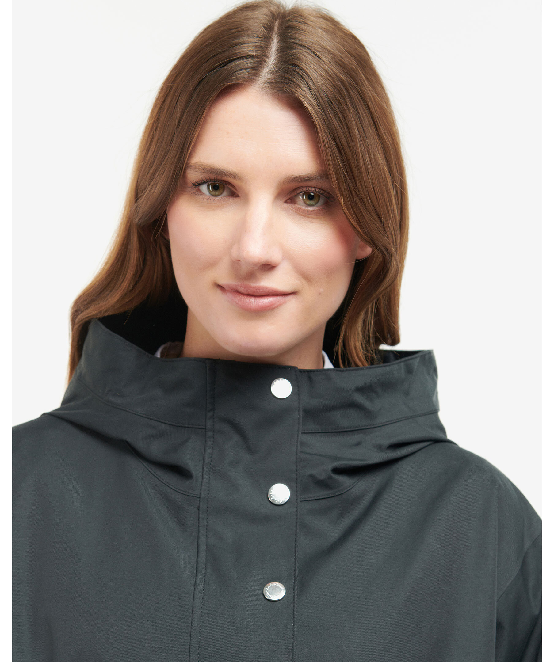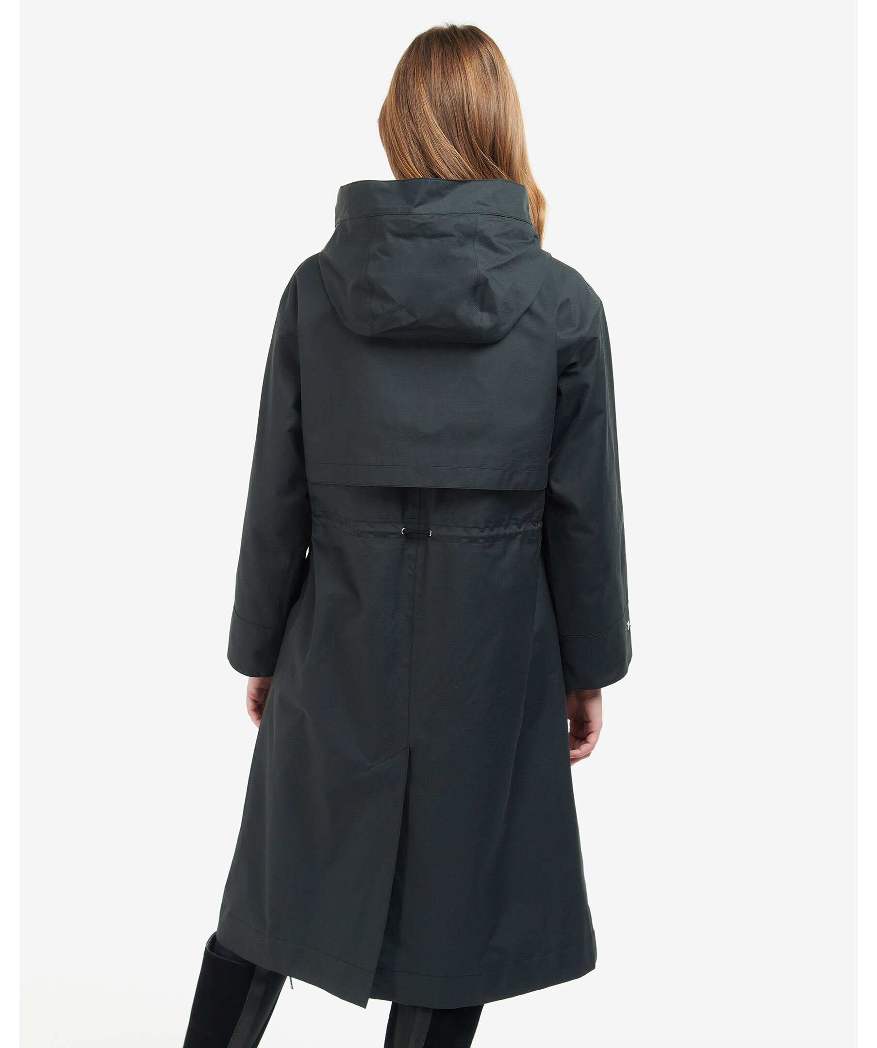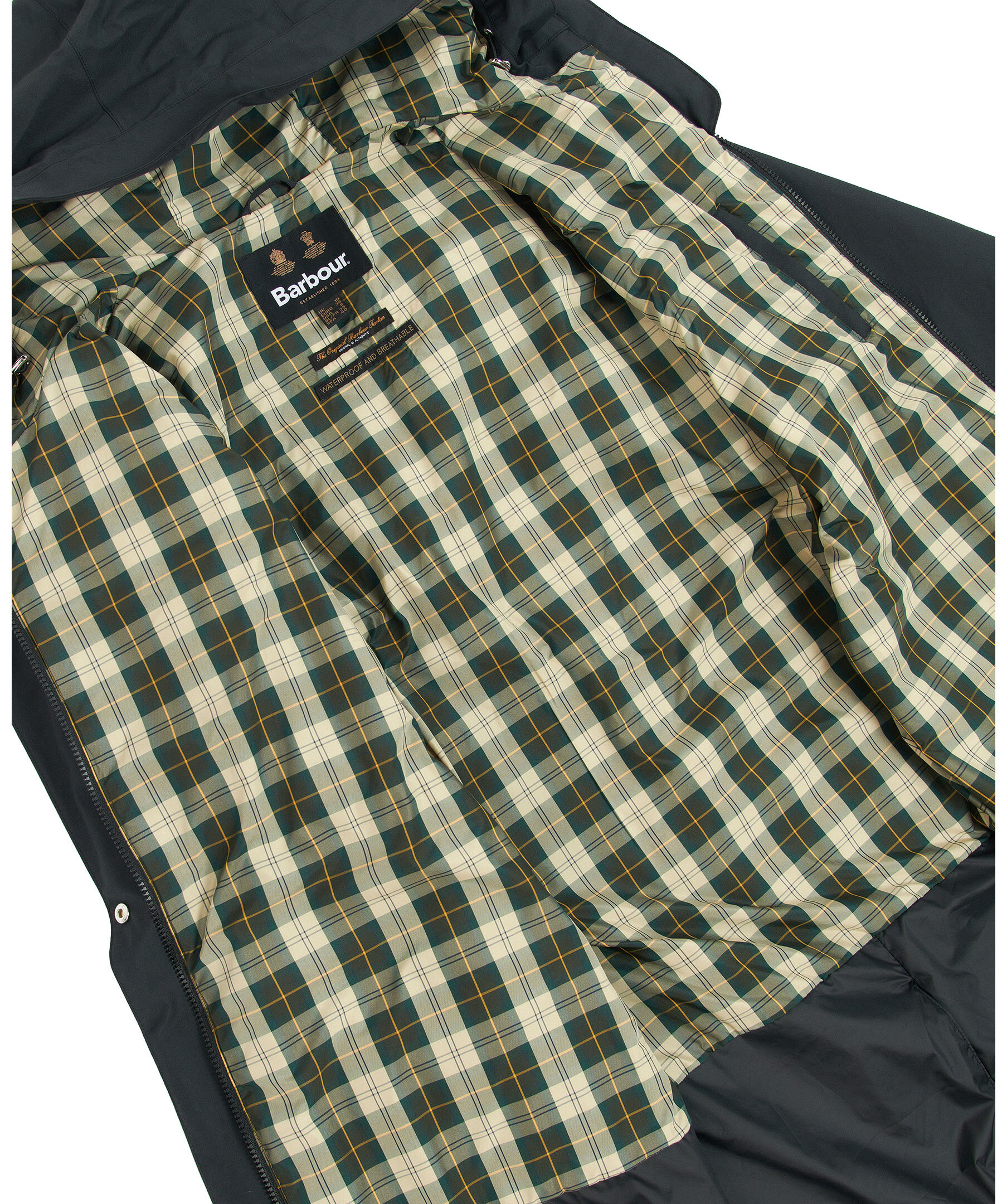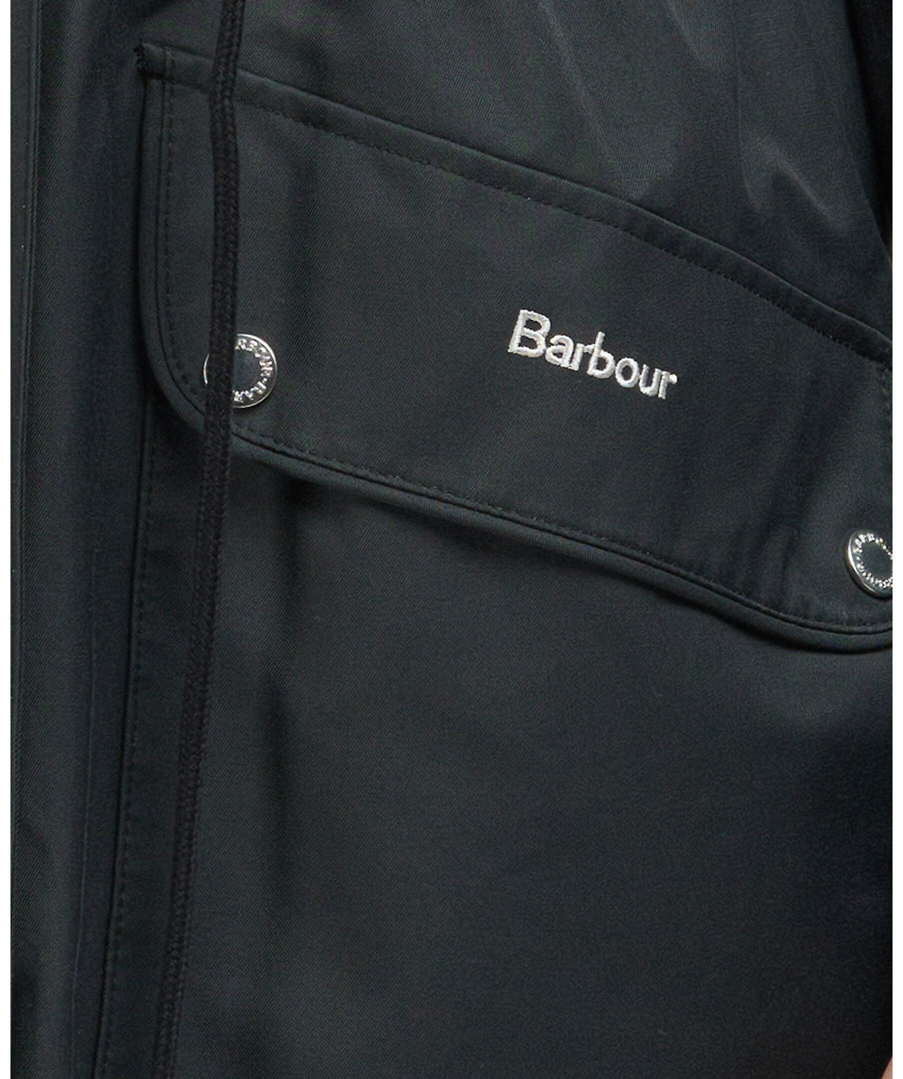 Svart, lång parkas från Barbour. Luva med hög krage och dragsko och en fin siluett som kan justeras med dragsko i midjan. Vattentät exteriör, tartanfoder, stängs med dold dragkedja och tryckknappar fram samt har tryckknappar som justerar ärm vidden i ärmsluten. Framfickor med ficklock och tryckknappar och en liten, broderad logotyp på vänster framficka.