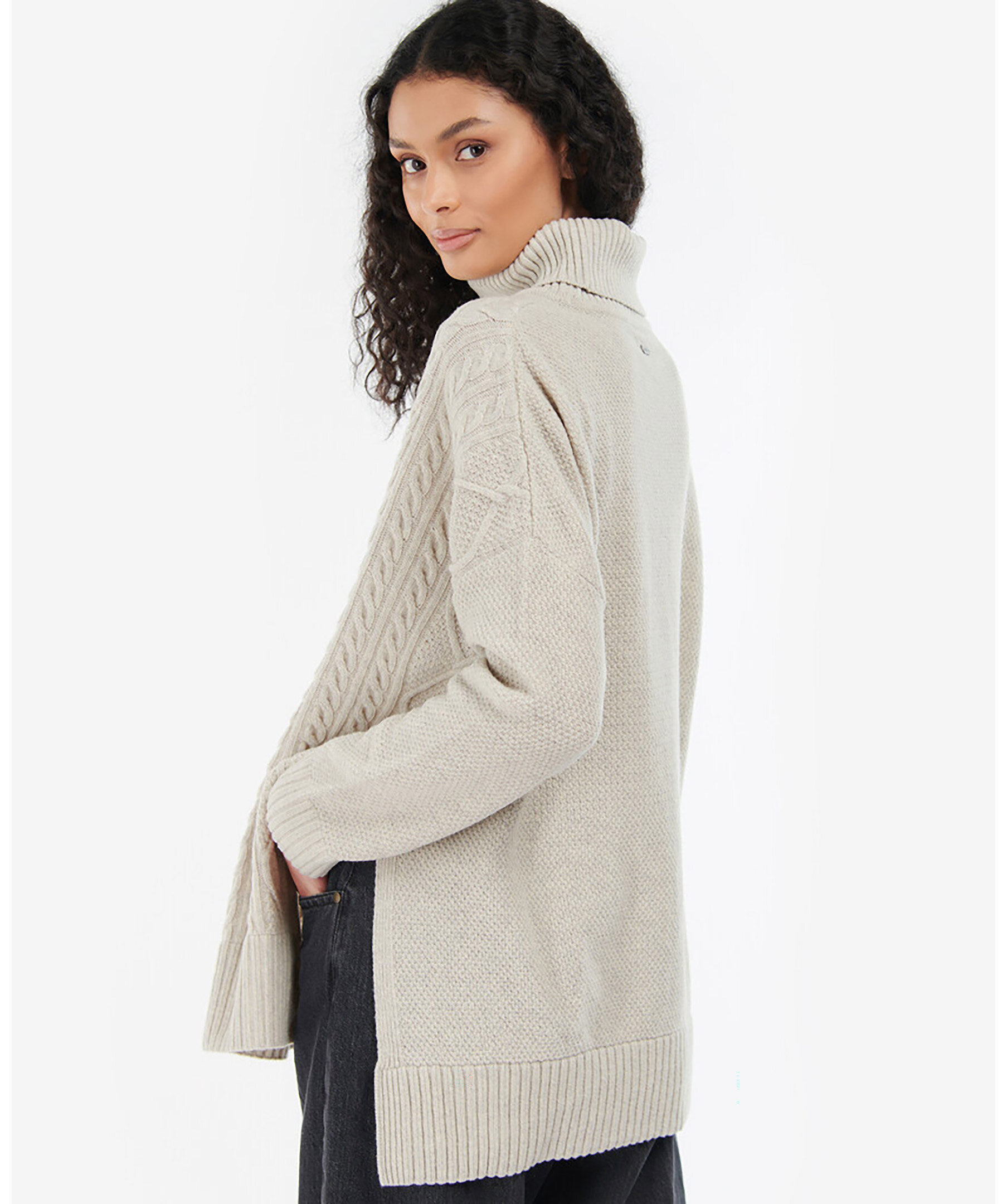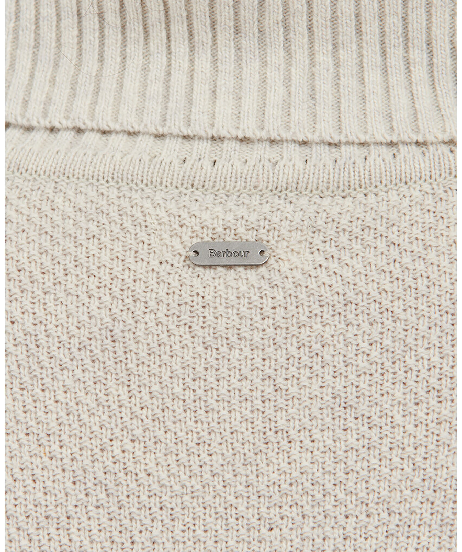 Grå kabelstickad polotröja från Barbour. Ribbstickad mudd vid kragen och ärmslut. Ribbstickad ärm-, plaggslut och krage. Tillverkad i ullblandning.