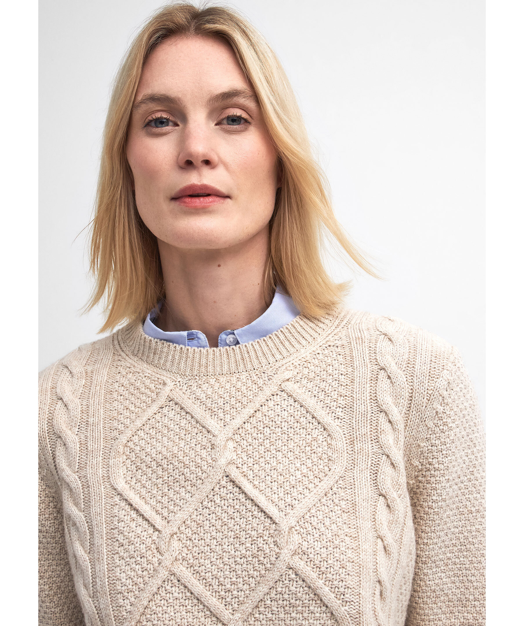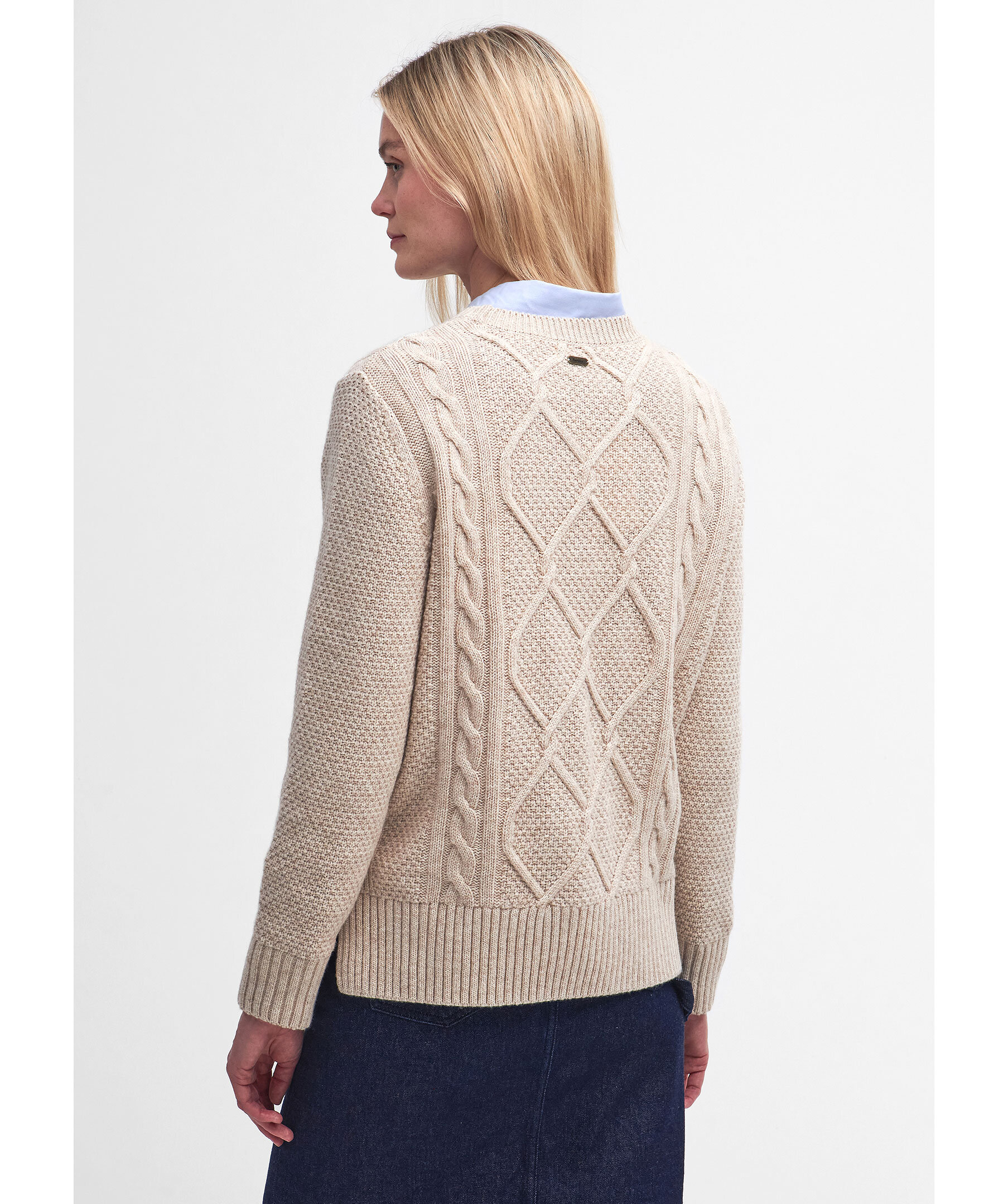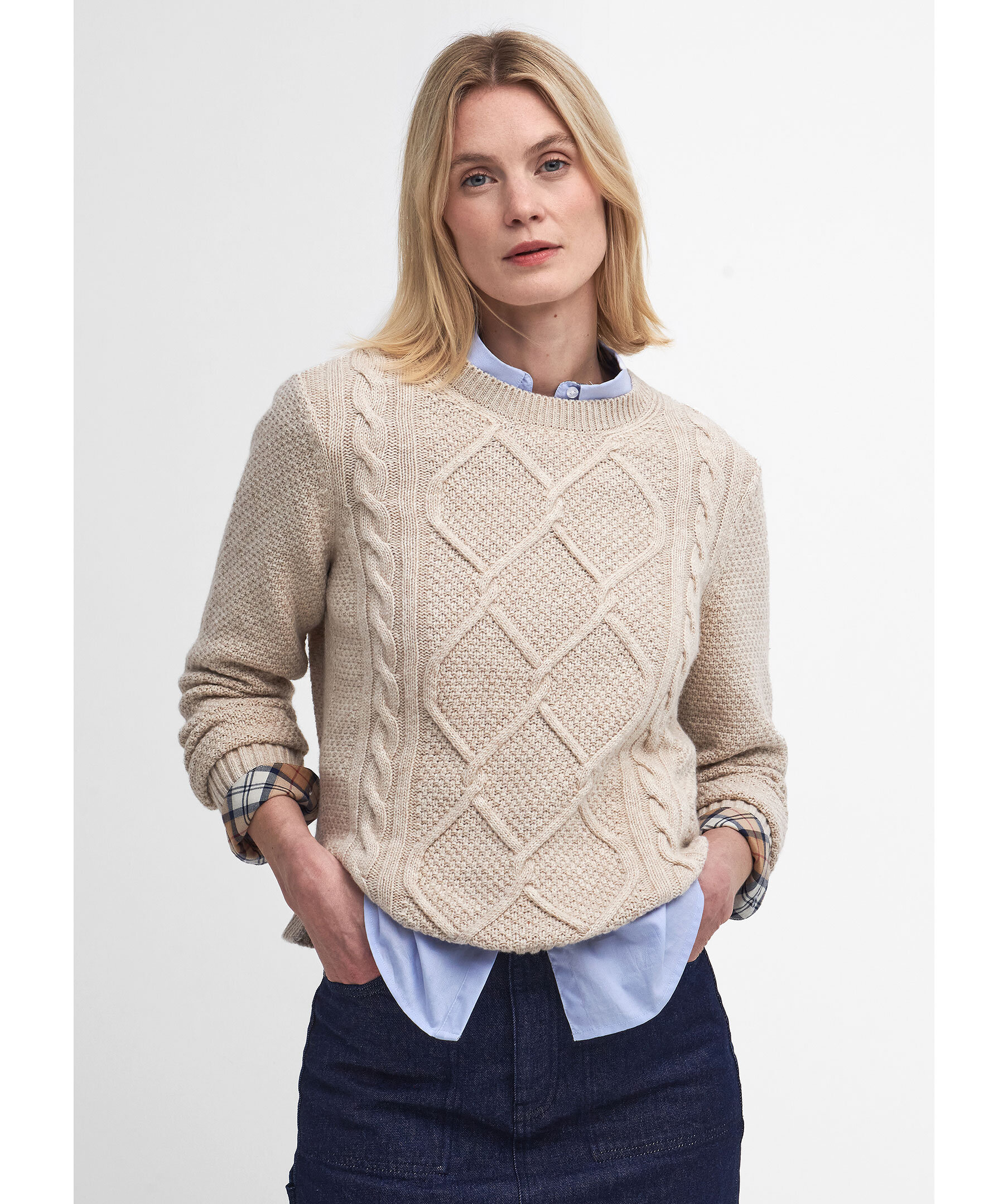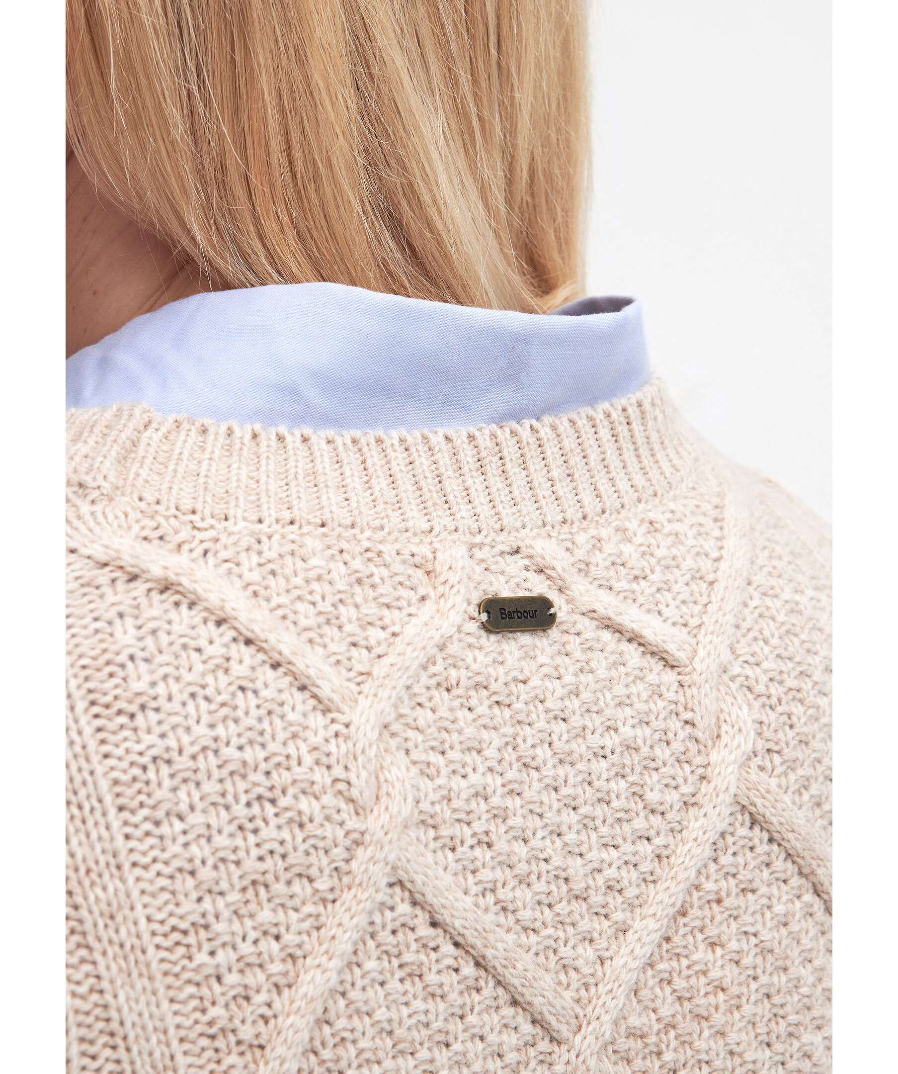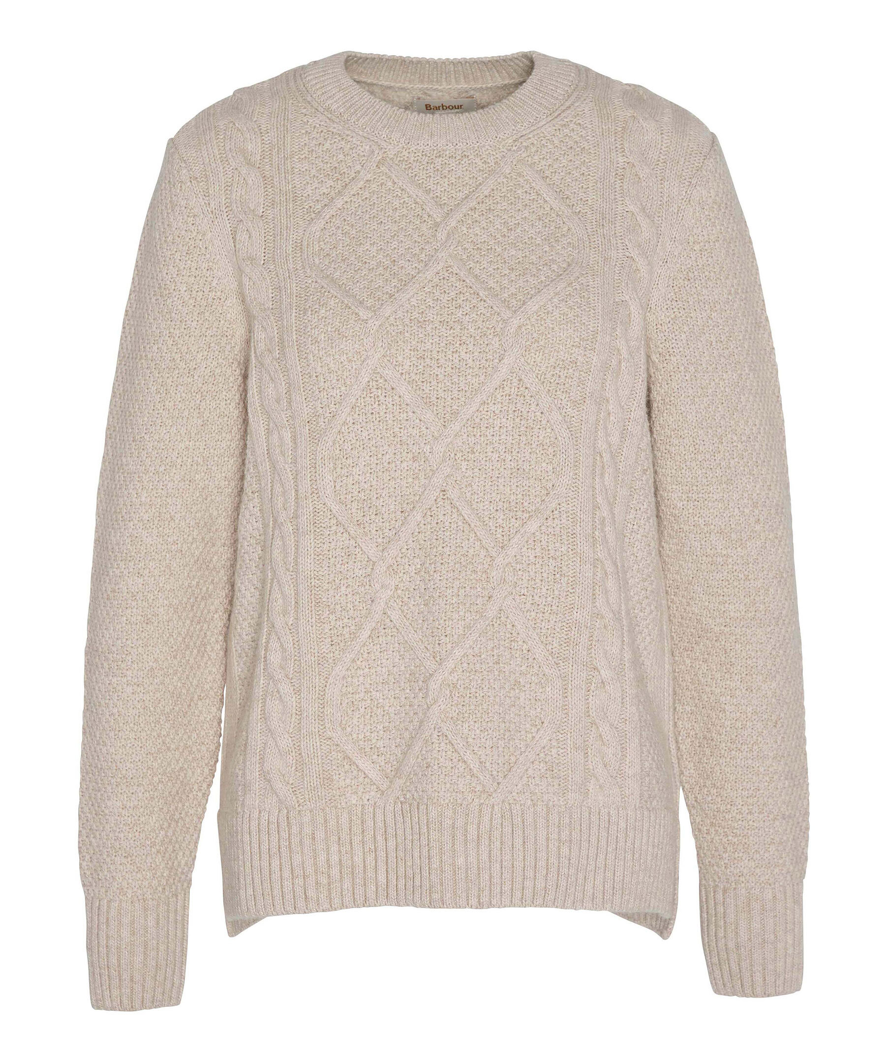 Ljusbeige, stickad tröja från Barbour. Tröjan har ribbstickade detaljer såsom halsringning och muddar vid ärm- och plaggslut. Tillverkad i en ullblandning.