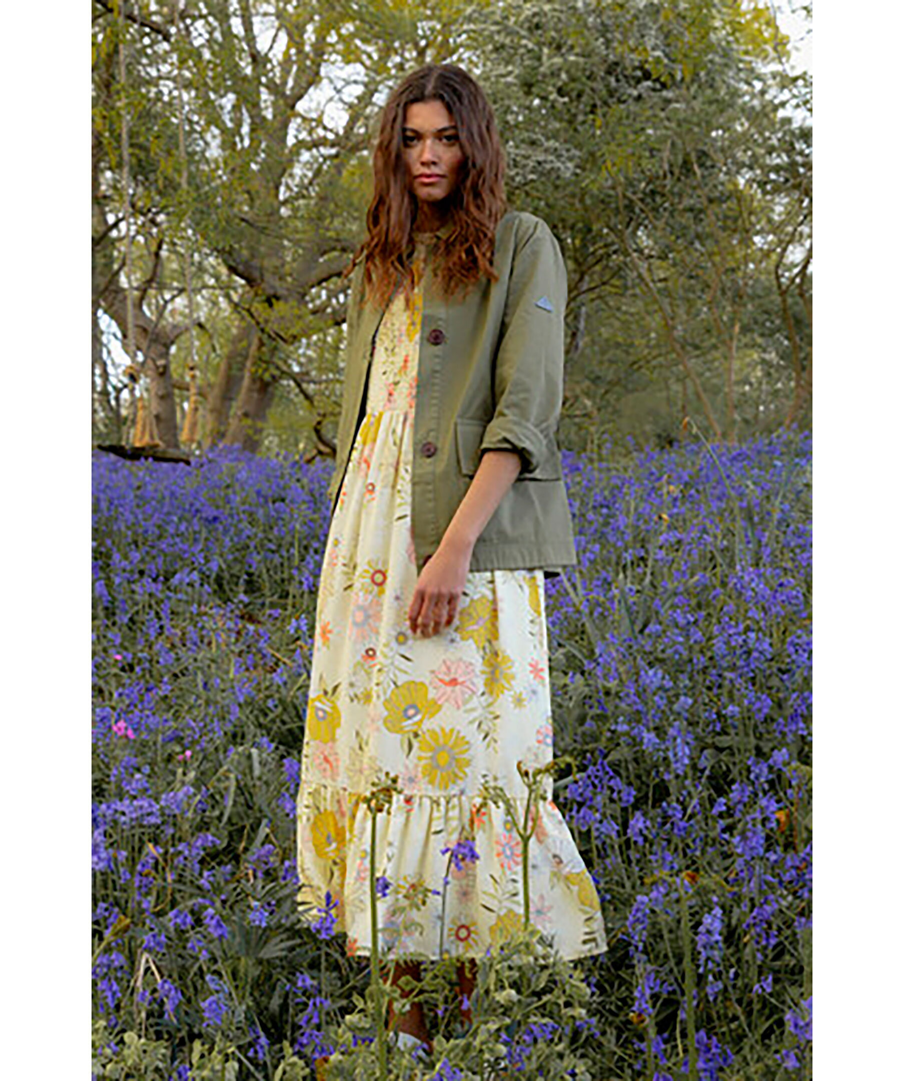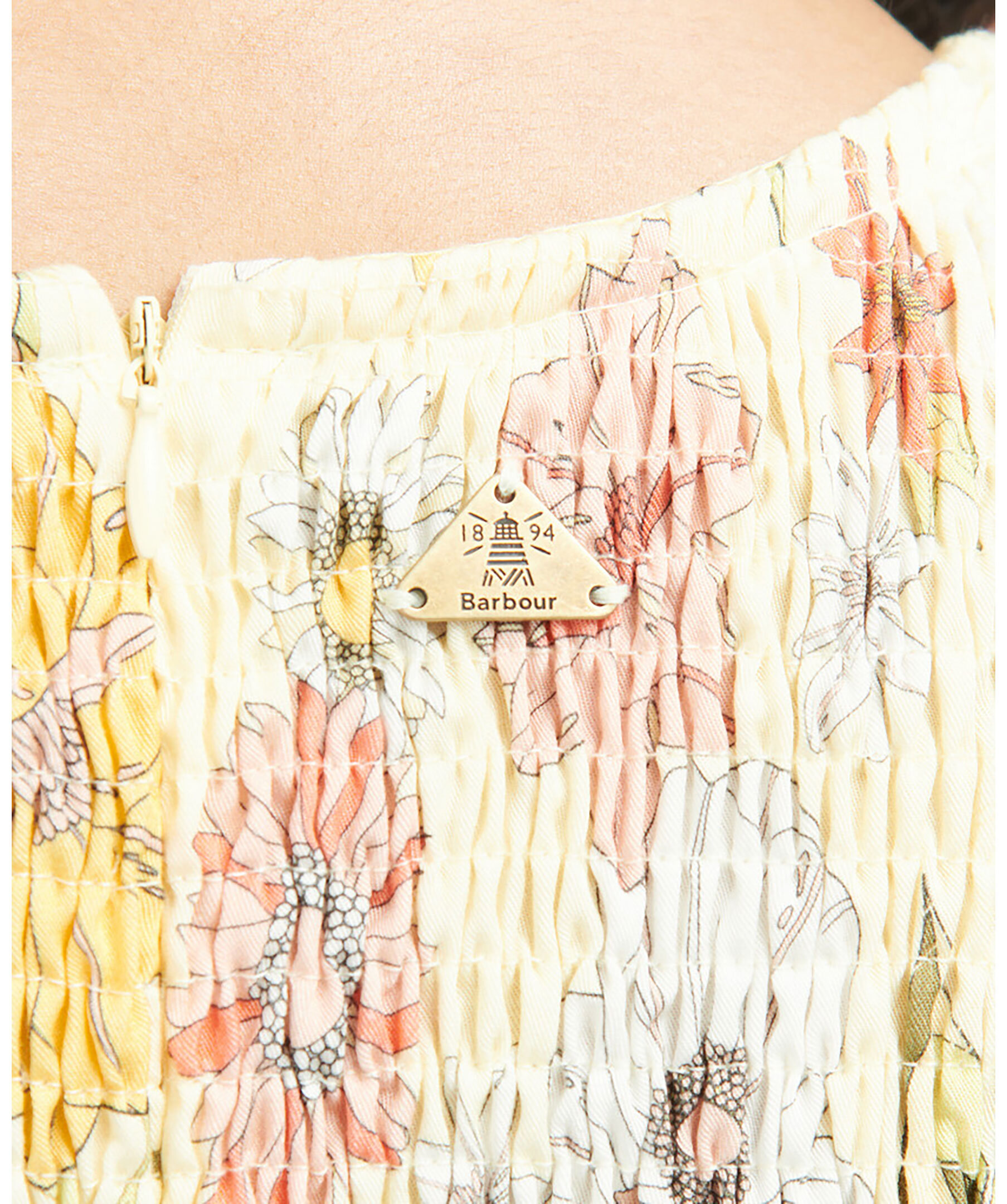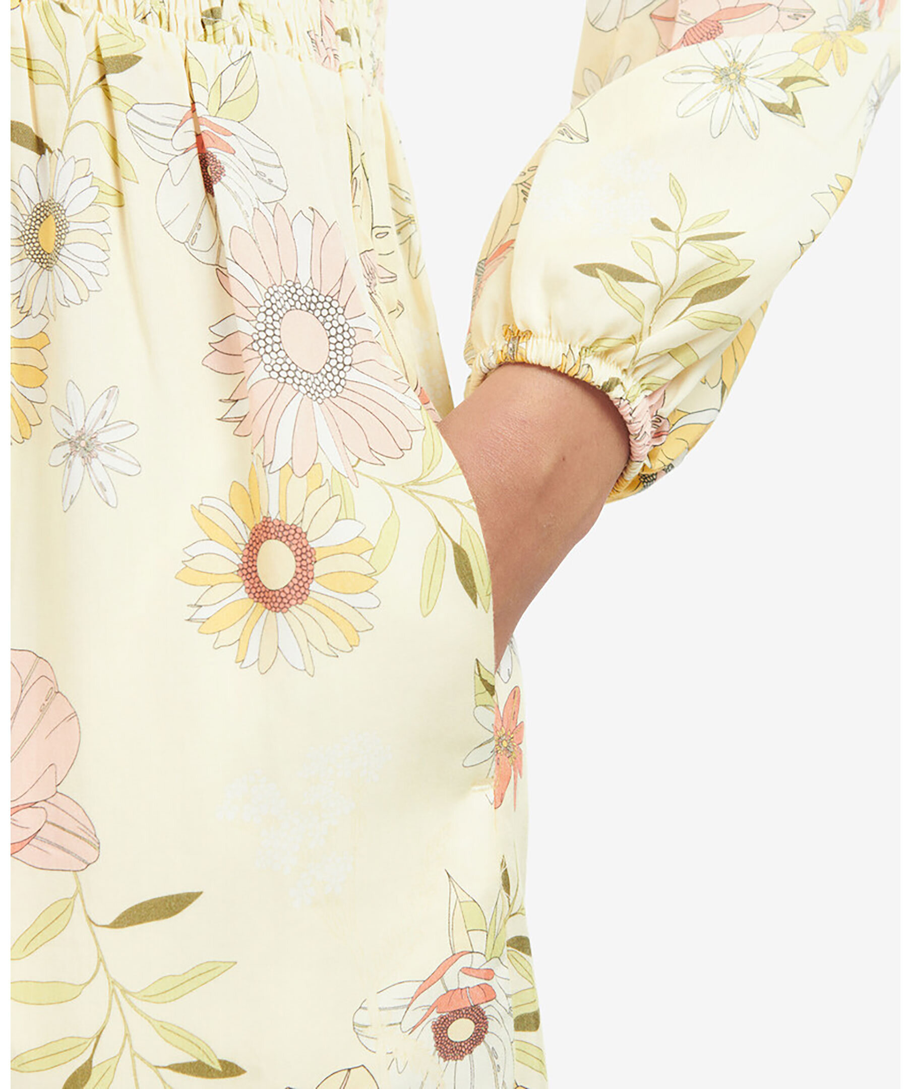 Citrongul vintage-inspirerad klänning som har rynkningar genom midjan för en smickrande feminin känsla. Tillverkad i 100% lyocell. Genomgående blommönster. Långa ärmar. Liten logotyp i metall i nacken. Två sidfickor. Avslappnad passform.