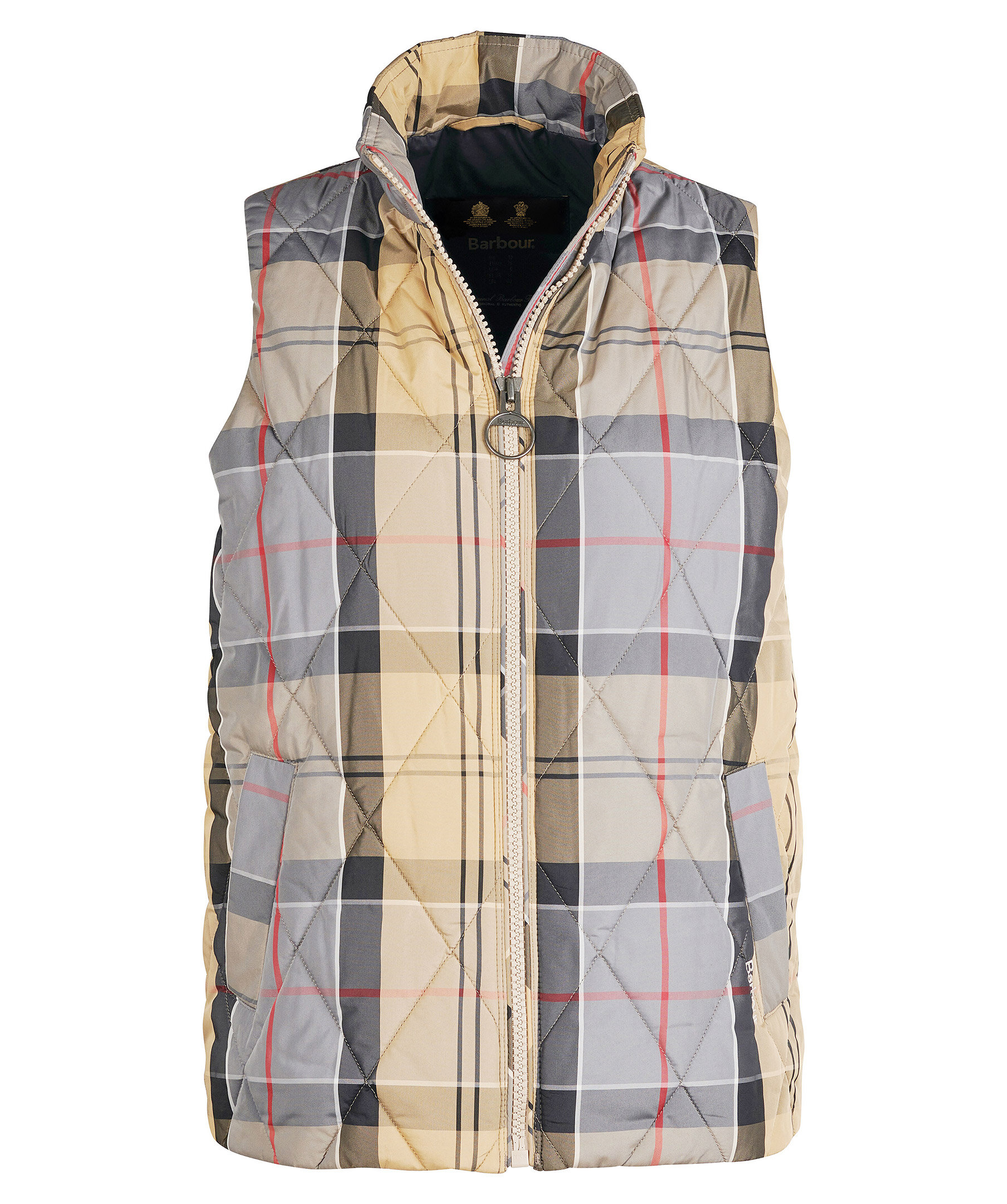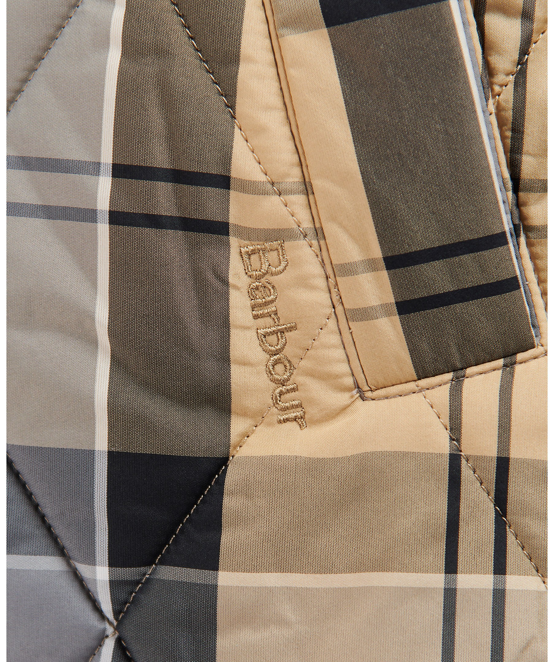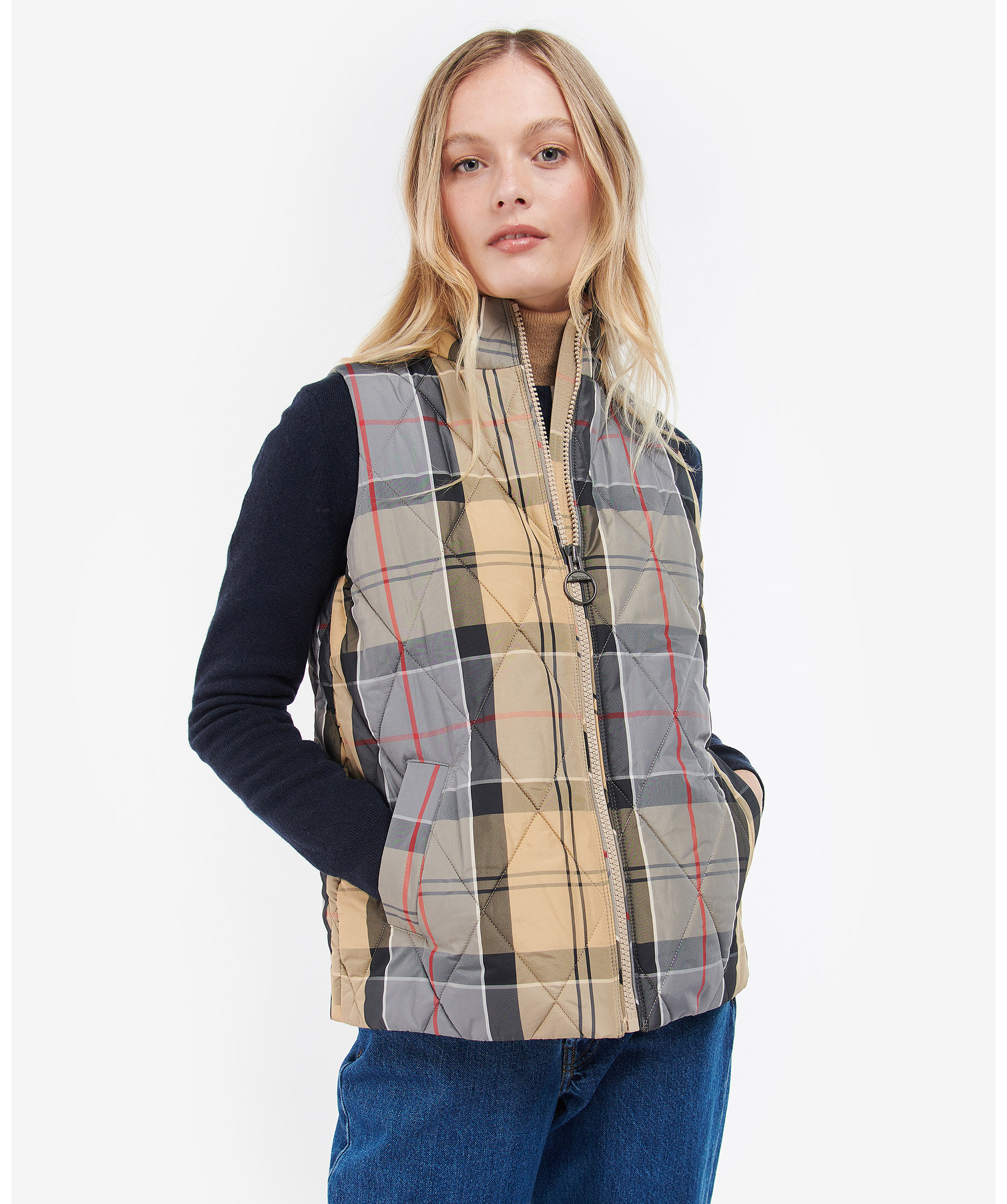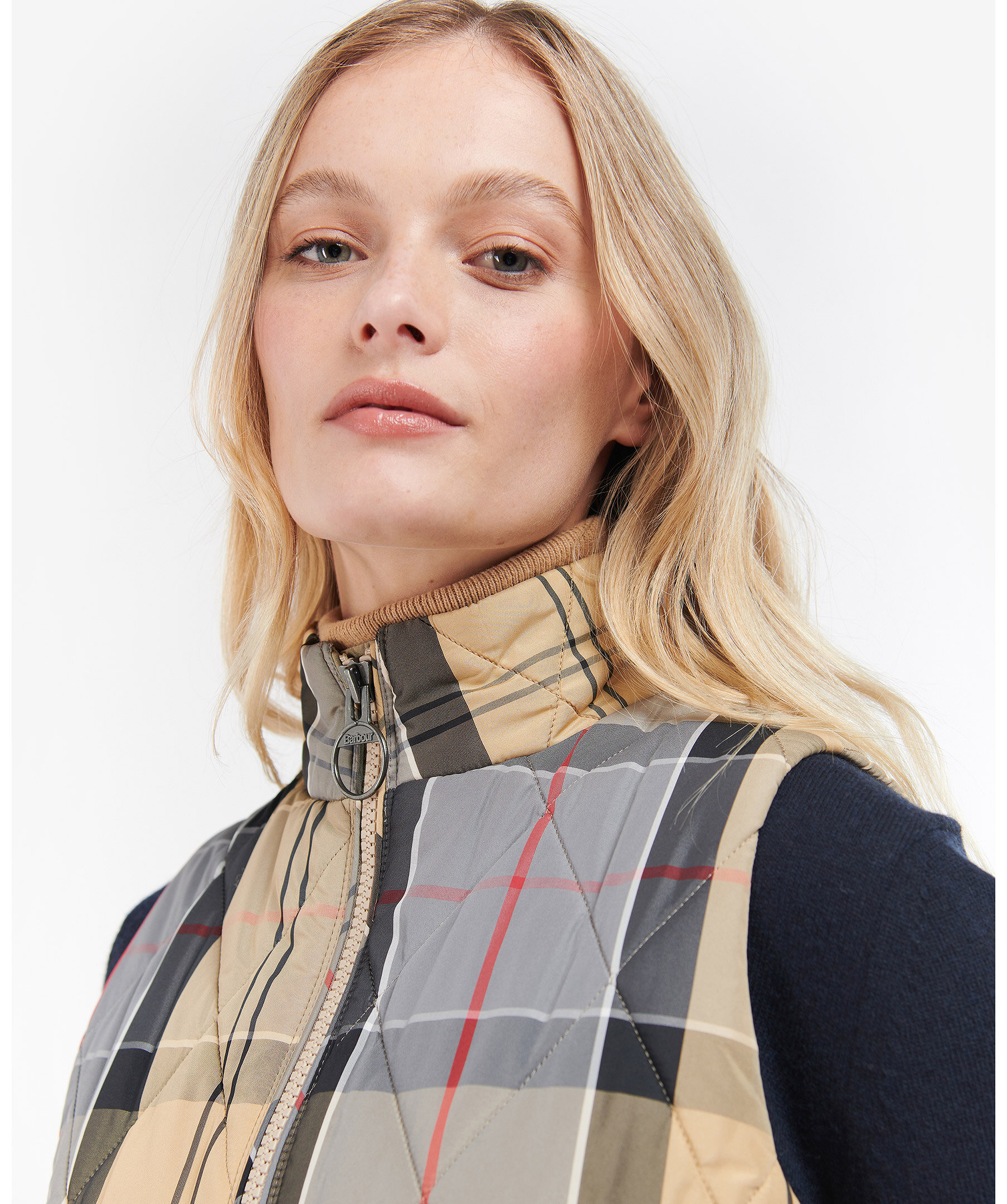 Beige, rutig väst med heltäckande diamantquiltdesign från Barbour. Trattkrage, passpoalfickor och en dragkedja framtill. Detta plagg kan bäras som lager eller som en fristående del.