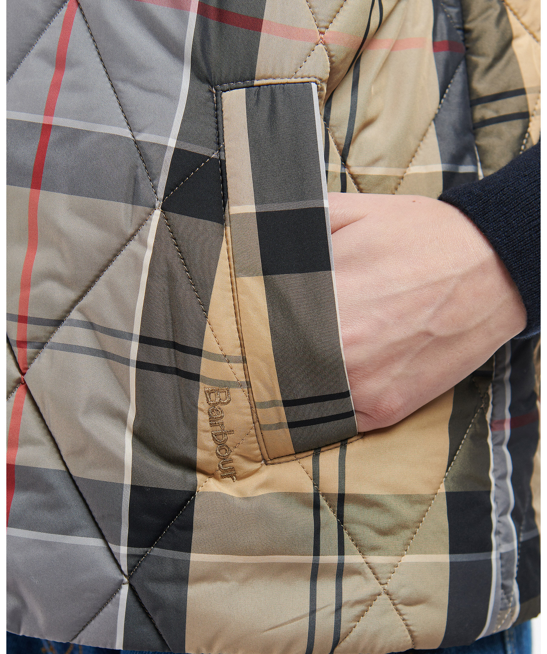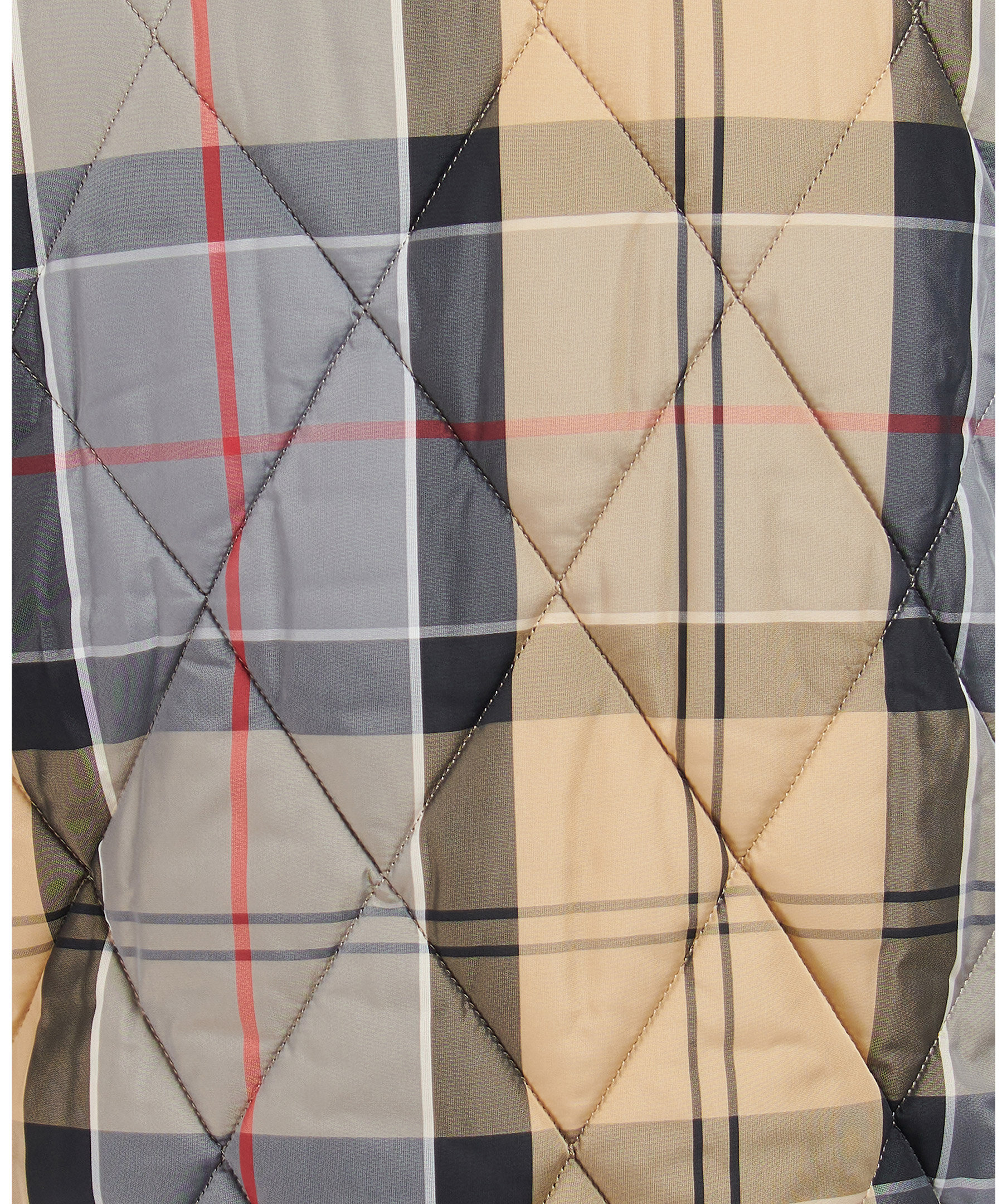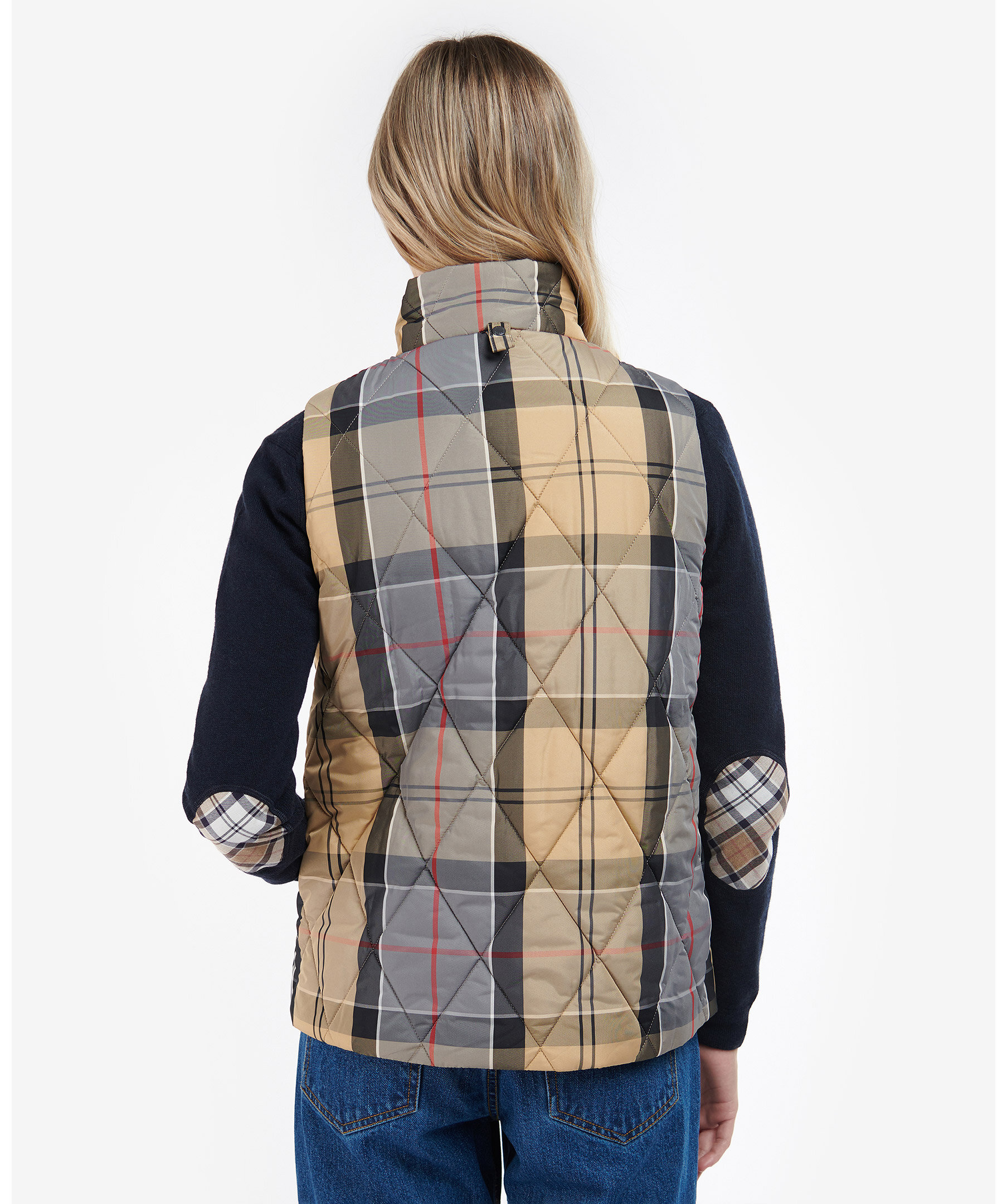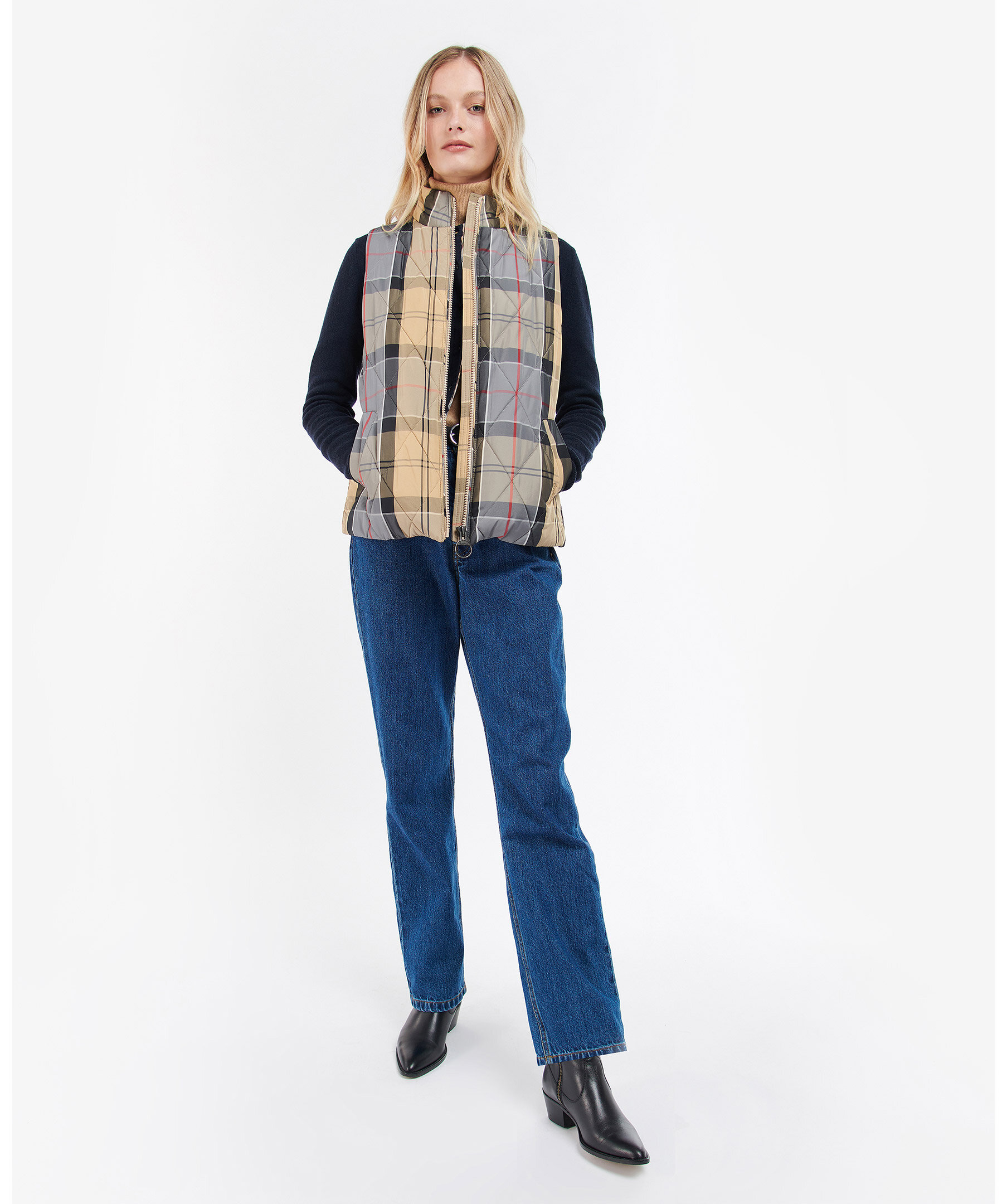 Beige, rutig väst med heltäckande diamantquiltdesign från Barbour. Trattkrage, passpoalfickor och en dragkedja framtill. Detta plagg kan bäras som lager eller som en fristående del.