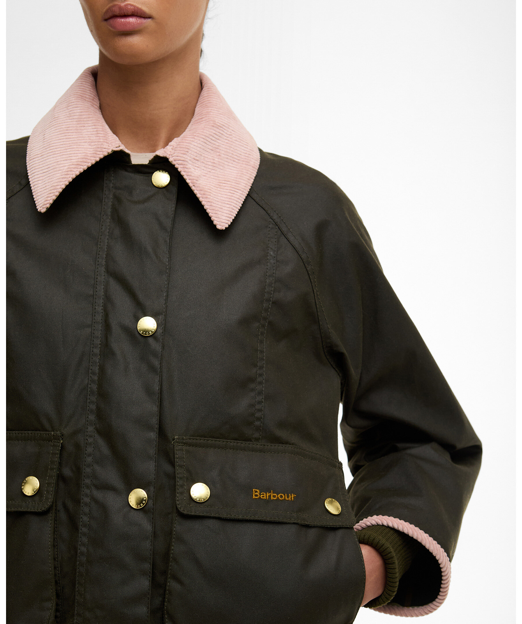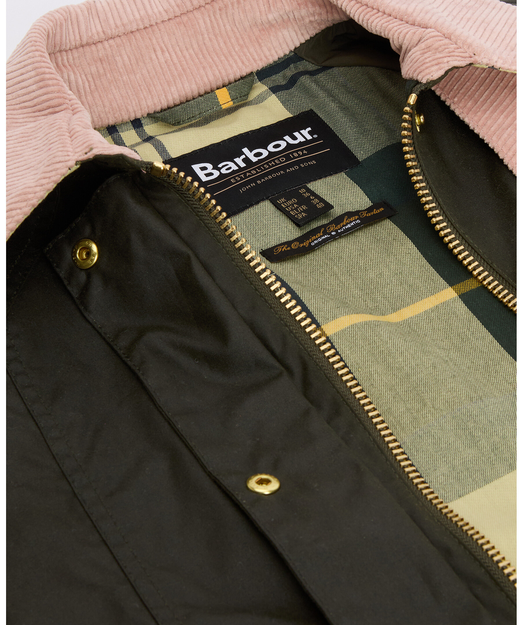 Jacka från Barbour i olivgrön vaxad bomull med klassiska storm‑slåar och tartanfodrade detaljer. Jackan har en kortare silhuett med vaxad finish, två gylfförsedda handfickor och ribbade muddar för en modern, ändå tidlös look som passar perfekt för lager‑på‑lager‑stil.