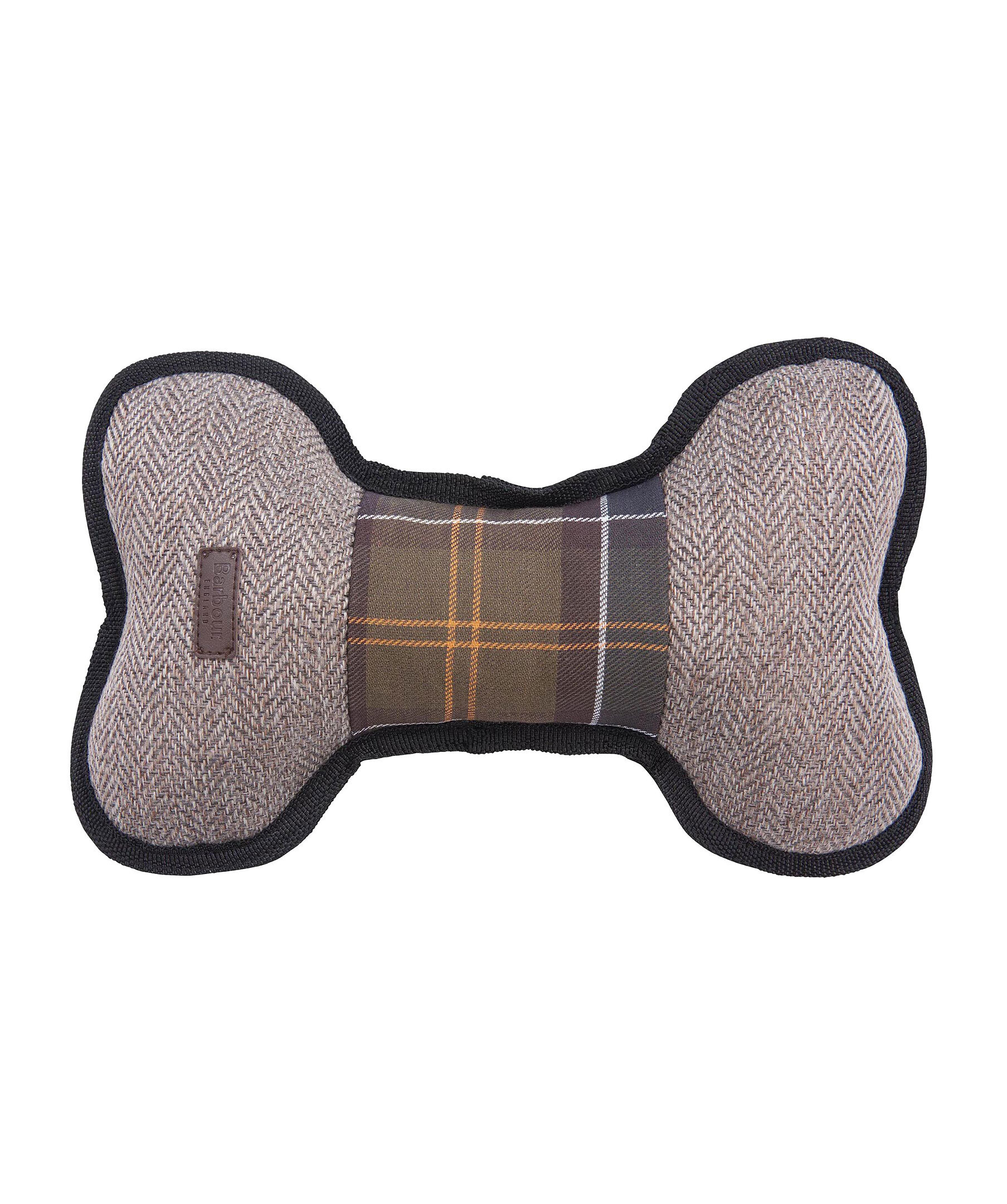 Pipande hundleksak, ben, från Barbour. Brunt fleecematerial på ena sidan, grå materialmix på andra sidan. Tartanmönstrat band går över mitten av benet. Liten läderlapp med logotyp under.