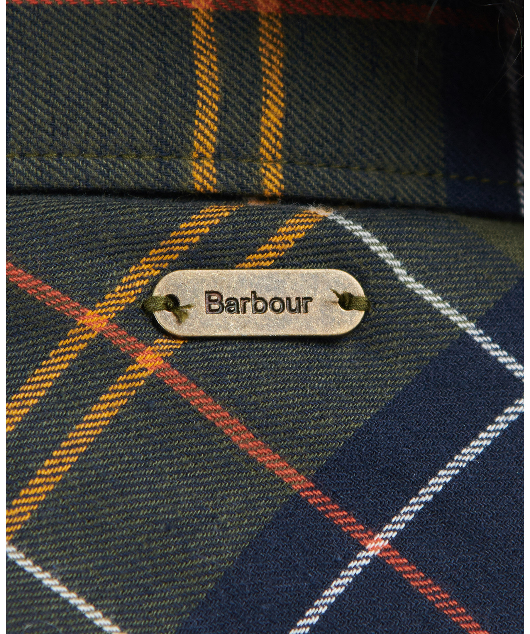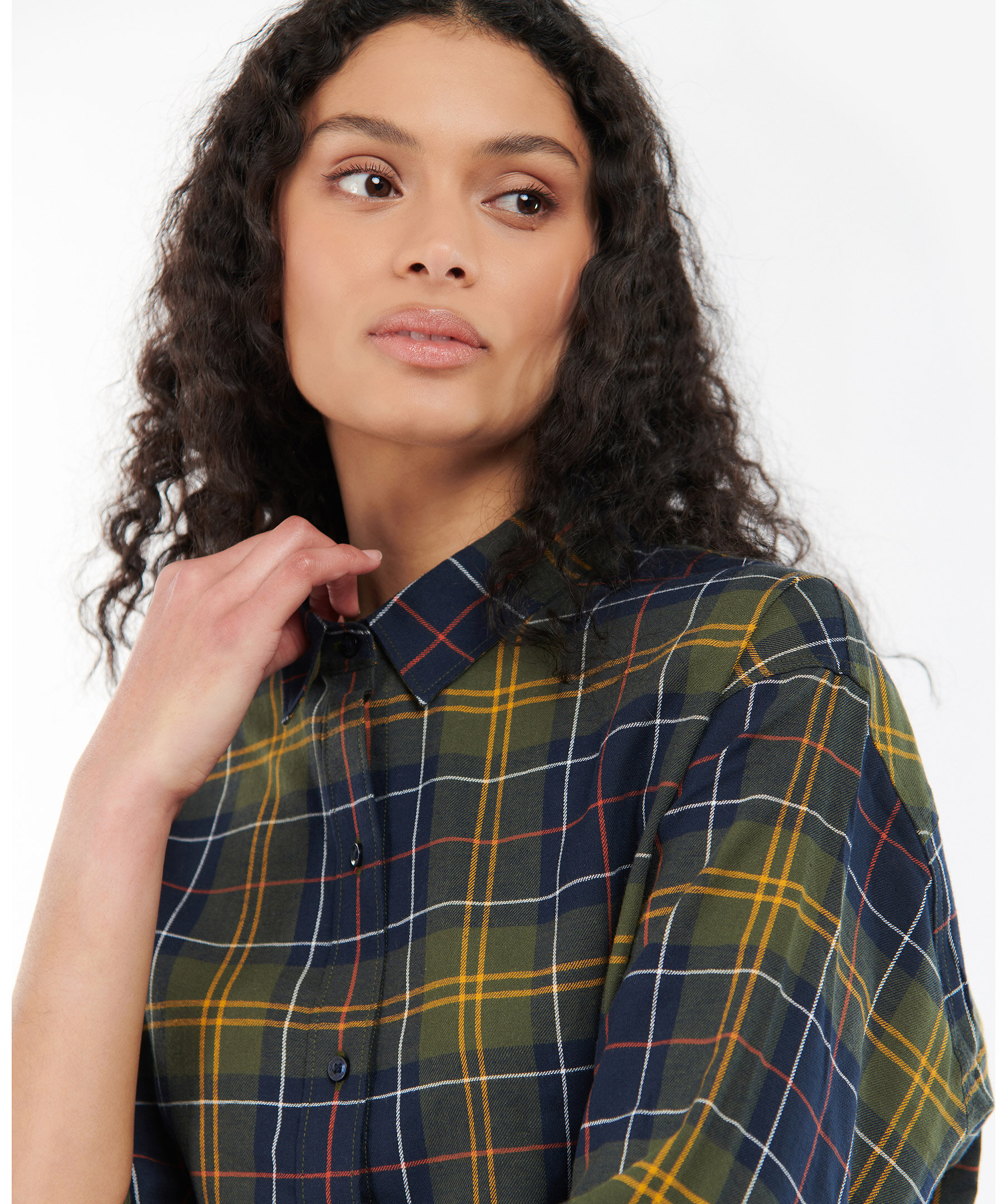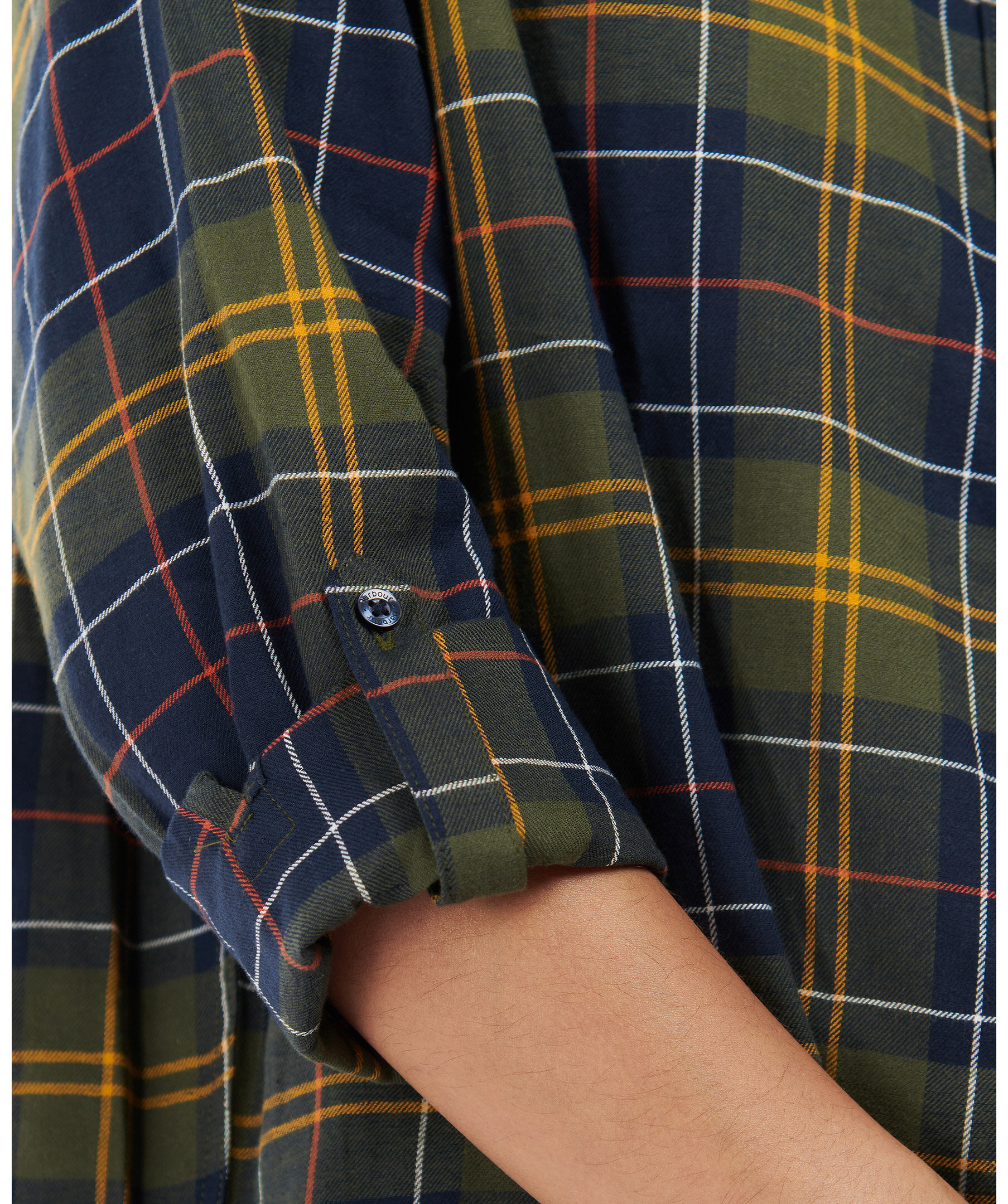 Mossgrön, rutig skjorta i oversize modell tillverkad i 100% bomull från Barbour. Långa ärmar, nedfällda axlar och knäppning hela vägen fram och i ärmslut.