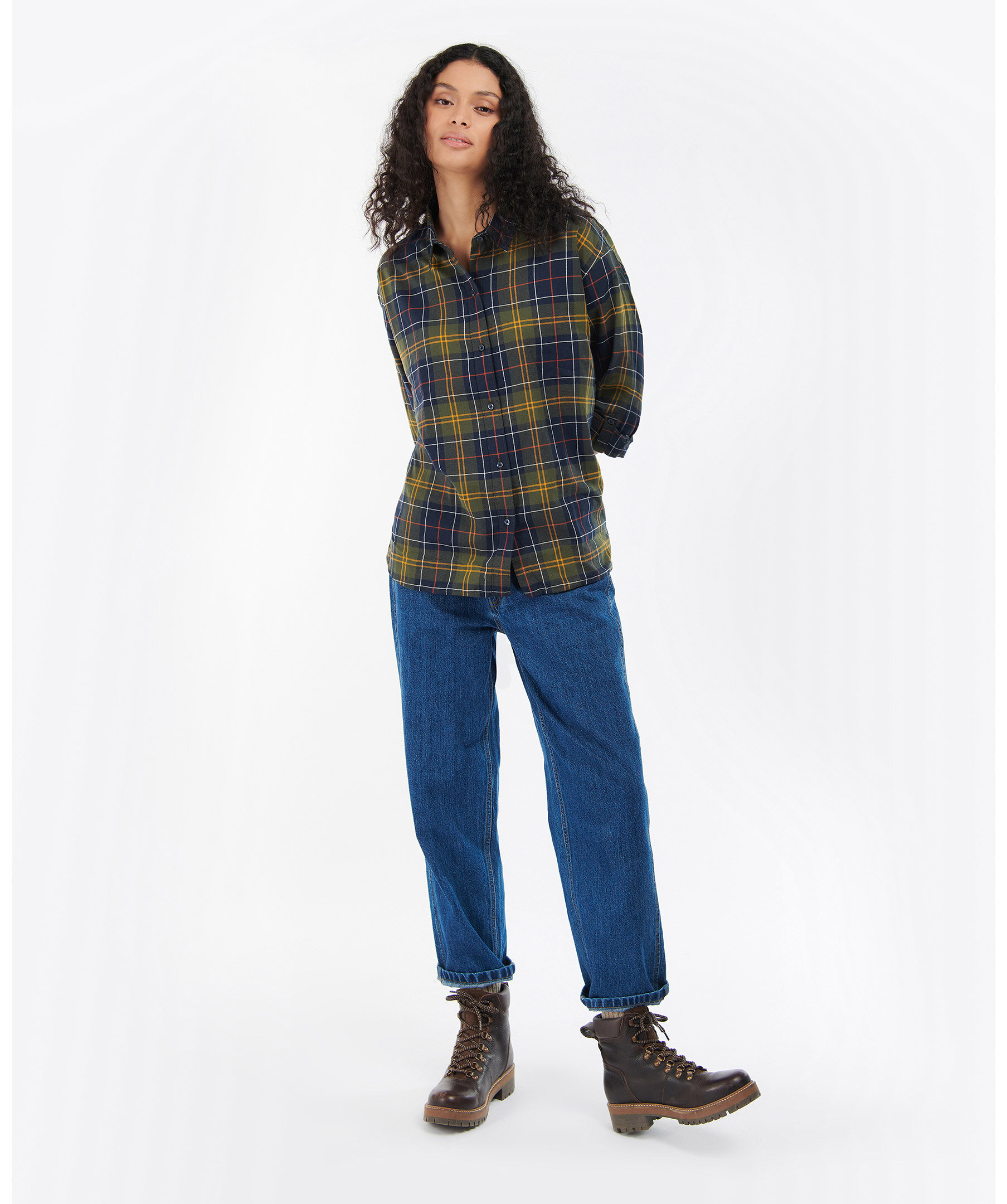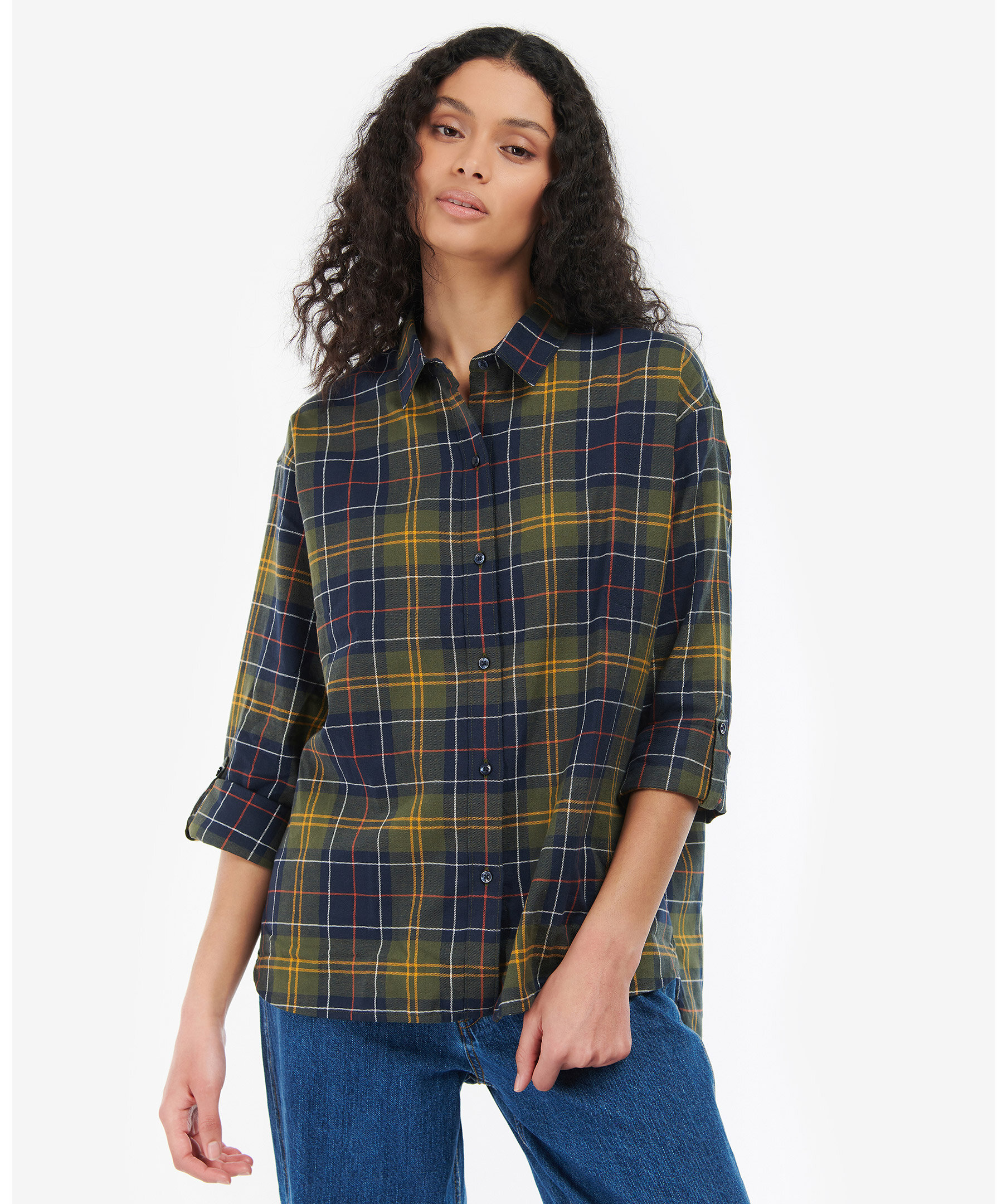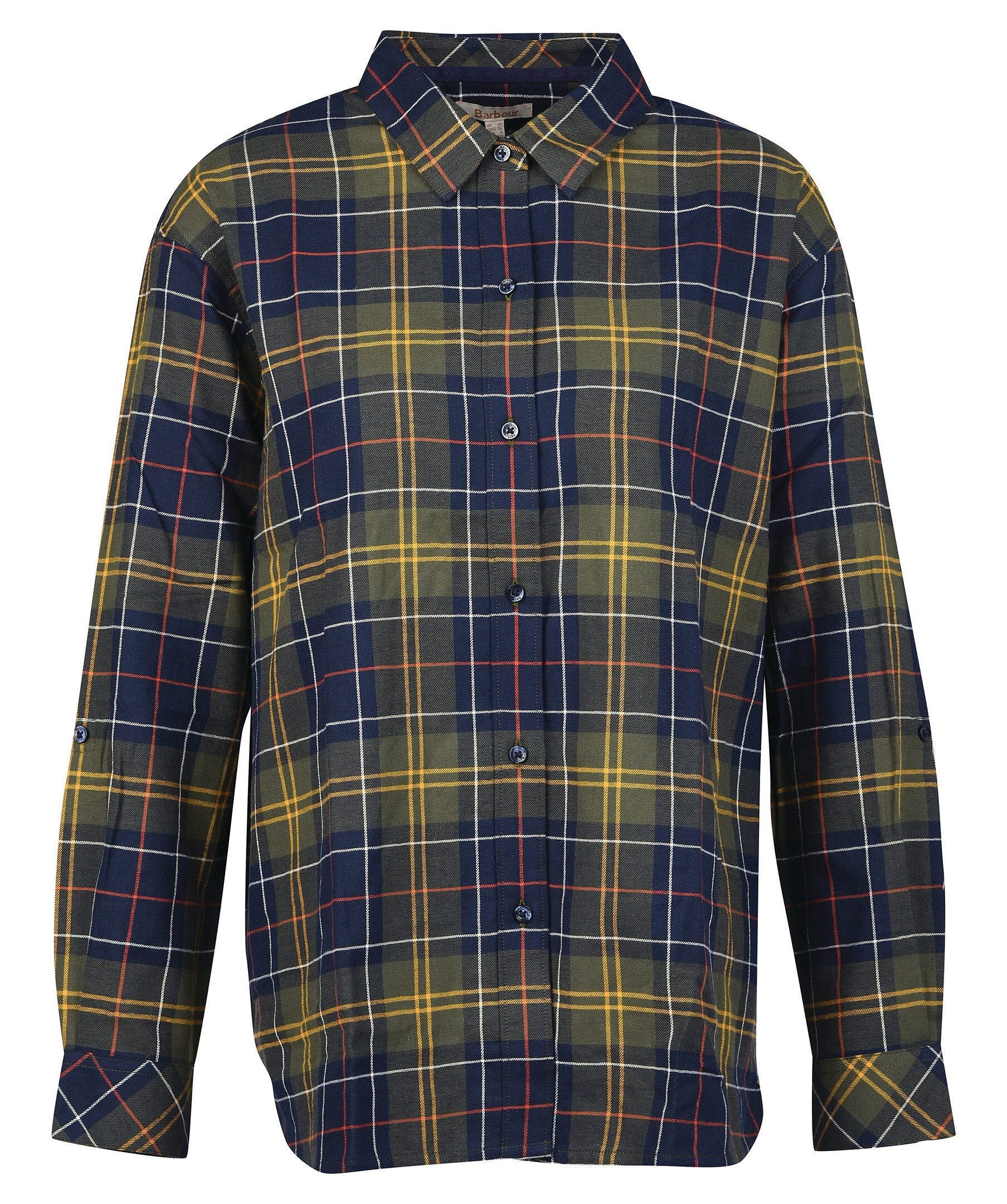 Mossgrön, rutig skjorta i oversize modell tillverkad i 100% bomull från Barbour. Långa ärmar, nedfällda axlar och knäppning hela vägen fram och i ärmslut.