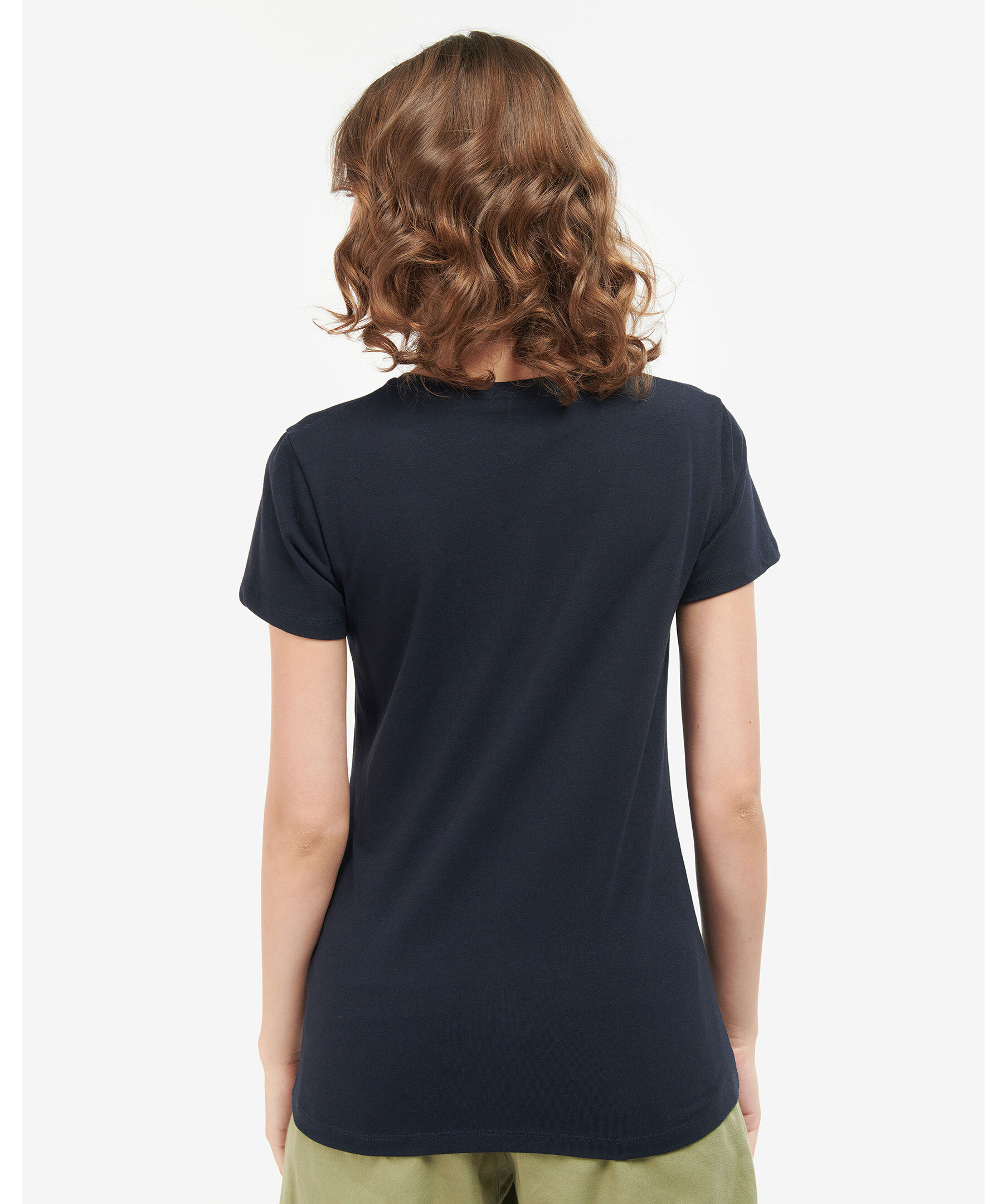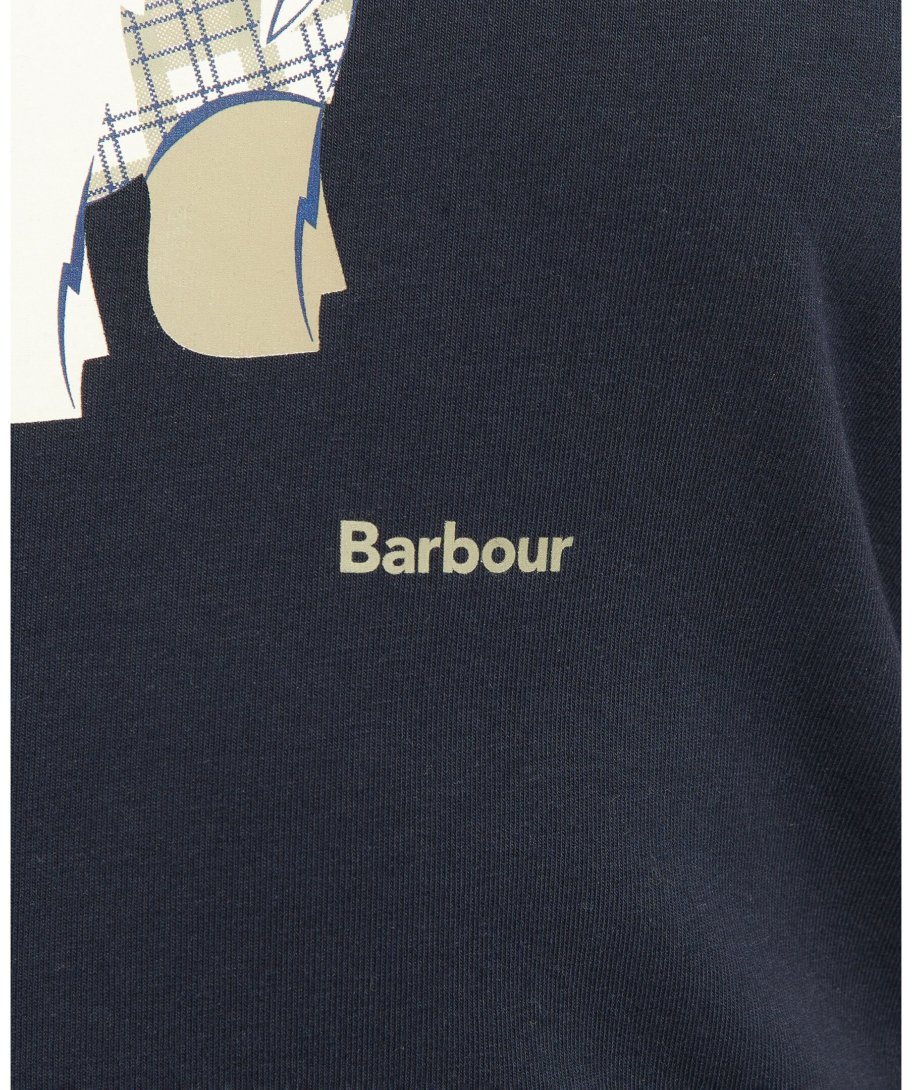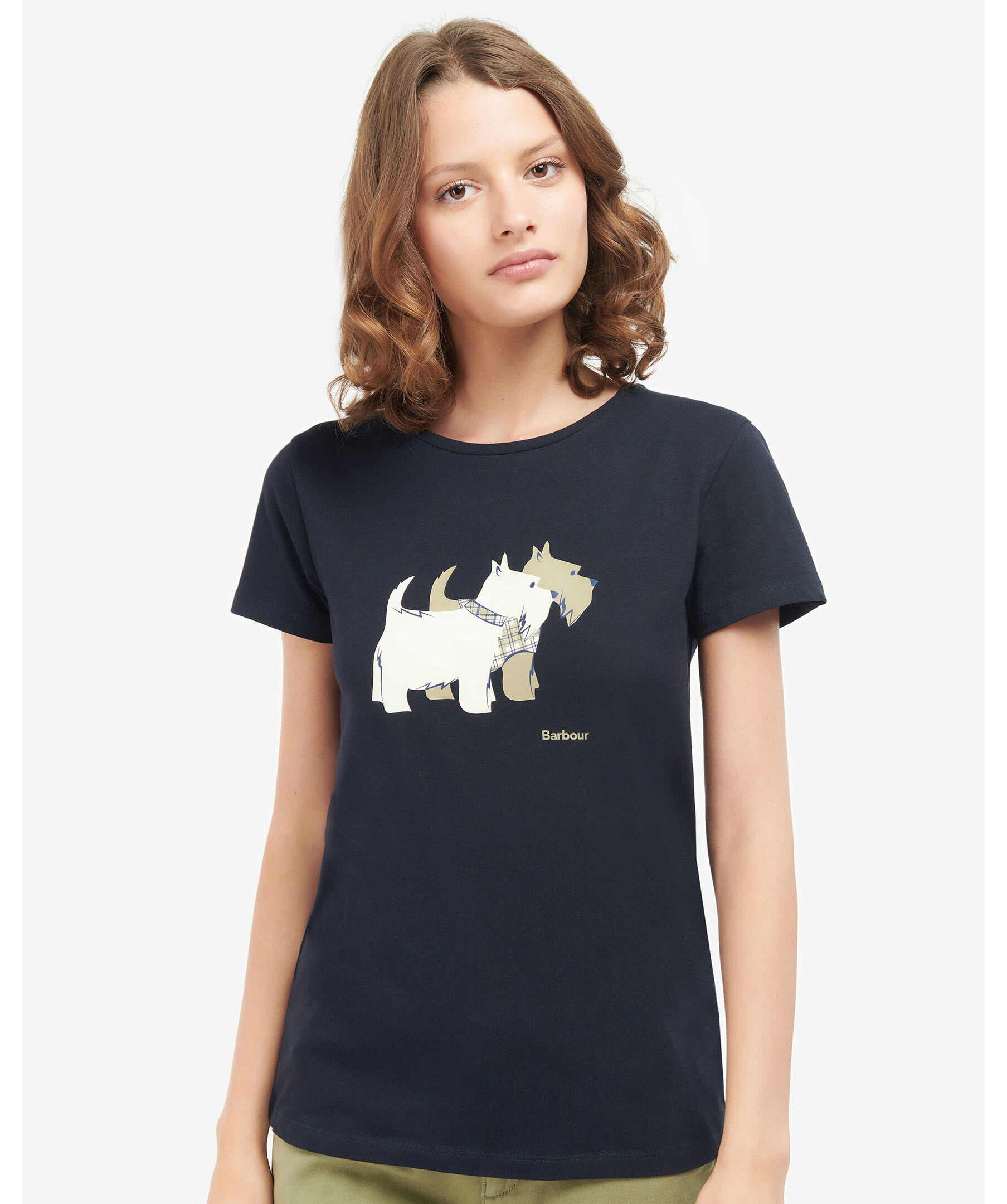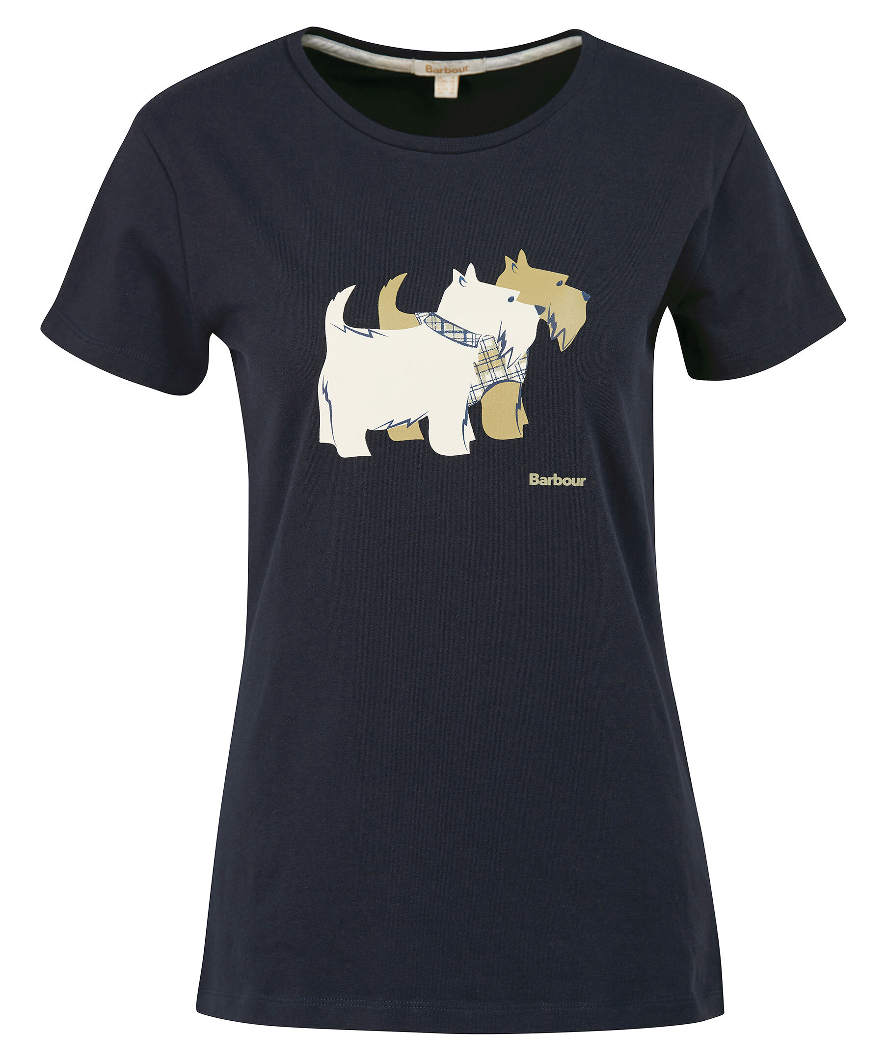 Marinblå t-shirt med en Scottie-hund tryckt på bröstet från Barbour. Den är gjord av en mjuk och lätt bomullsblandning, vilket gör den till ett bekvämt alternativ för hela dagen. Rundad halsringning och avslappnad passform.