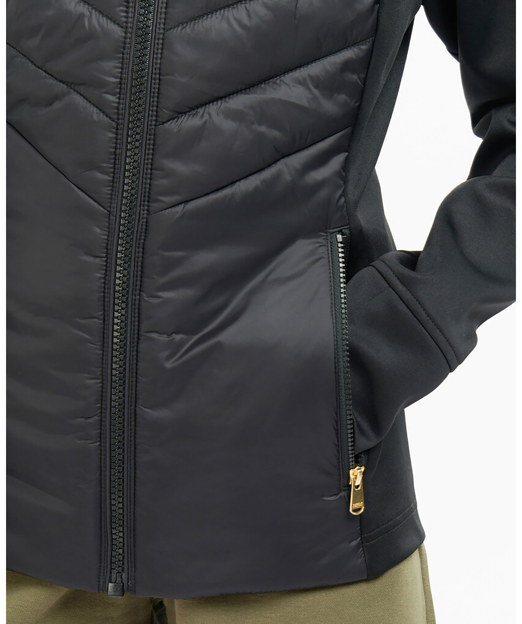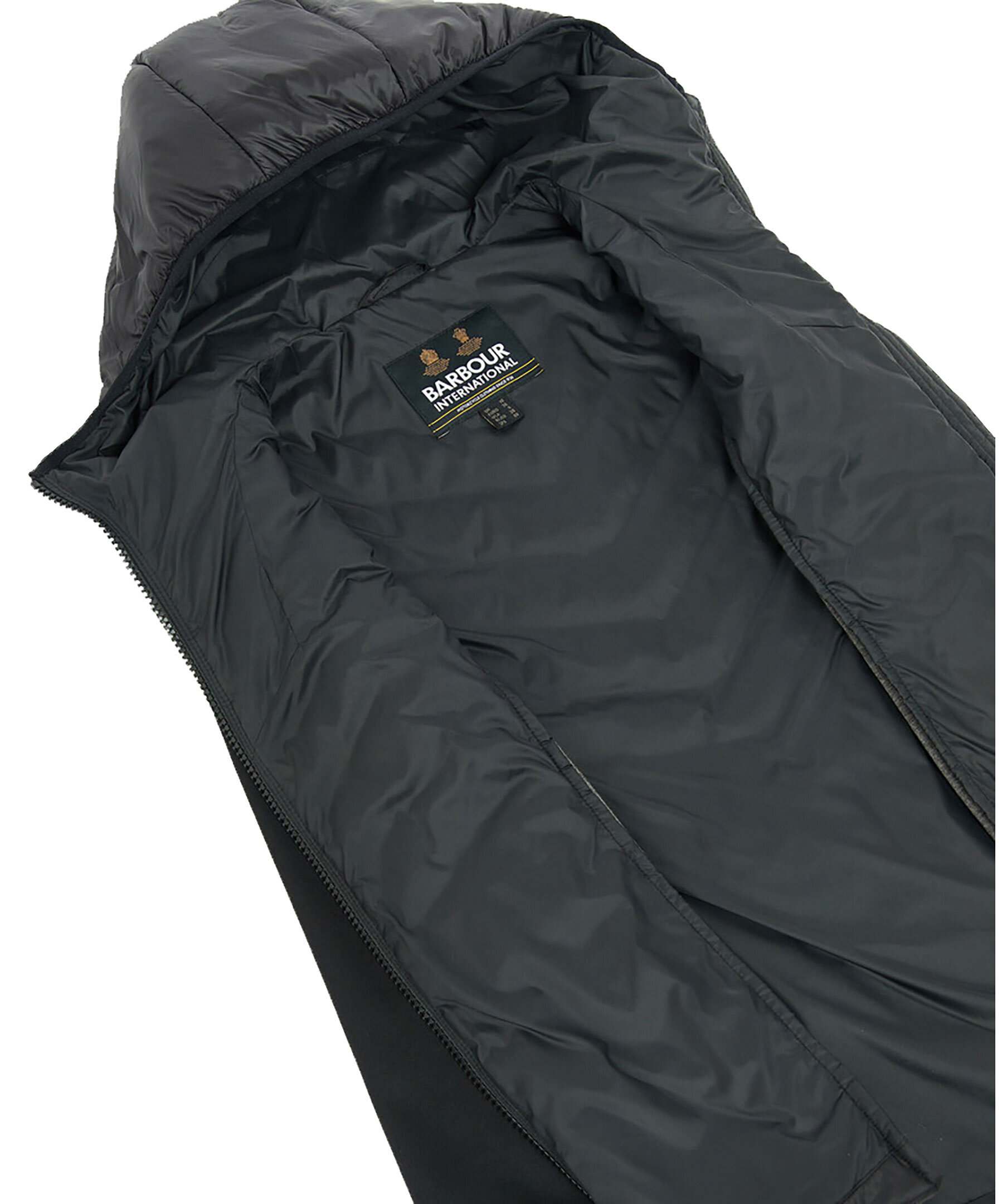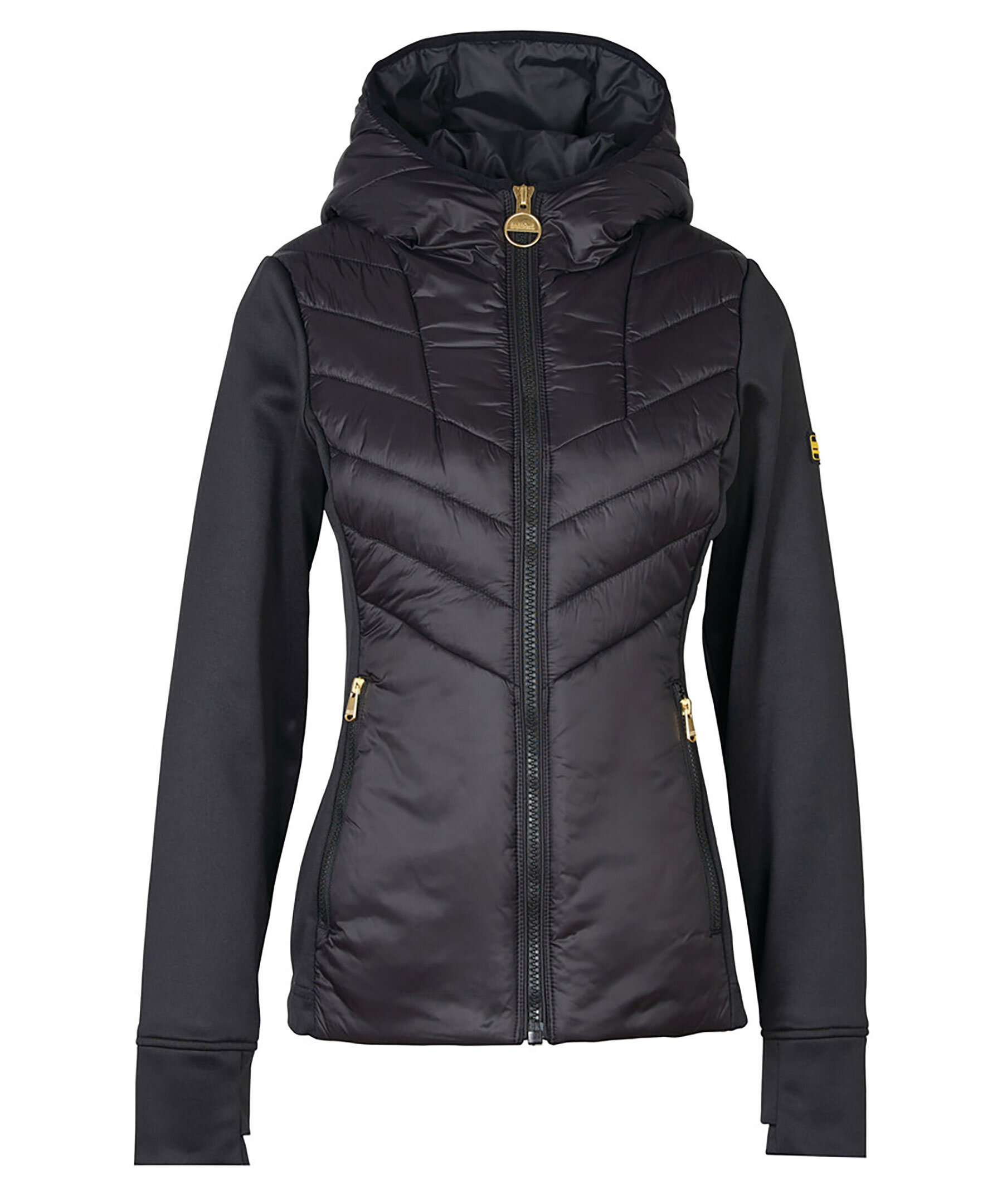 Svart quiltad jacka från Barbour med kontrasterande tygärmar. Tillverkad i en polyesterblandning. Designad med en ombonad huva och dragkedja framtill. Två sidfickor som stängs med dragkedja. Gul patch-logotyp på vänster arm.