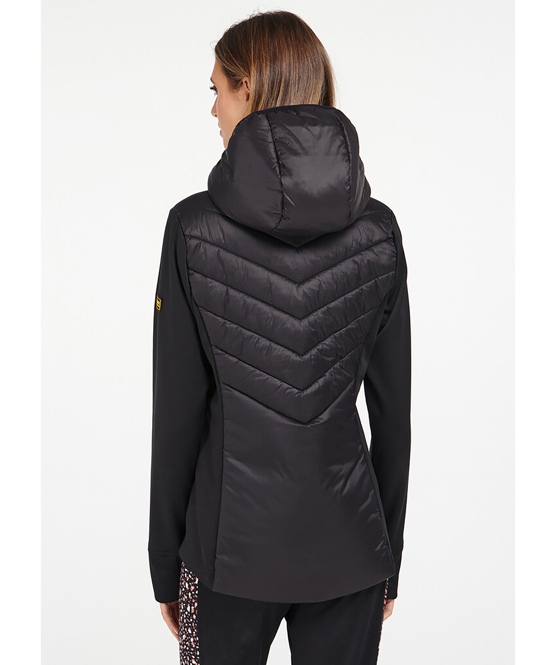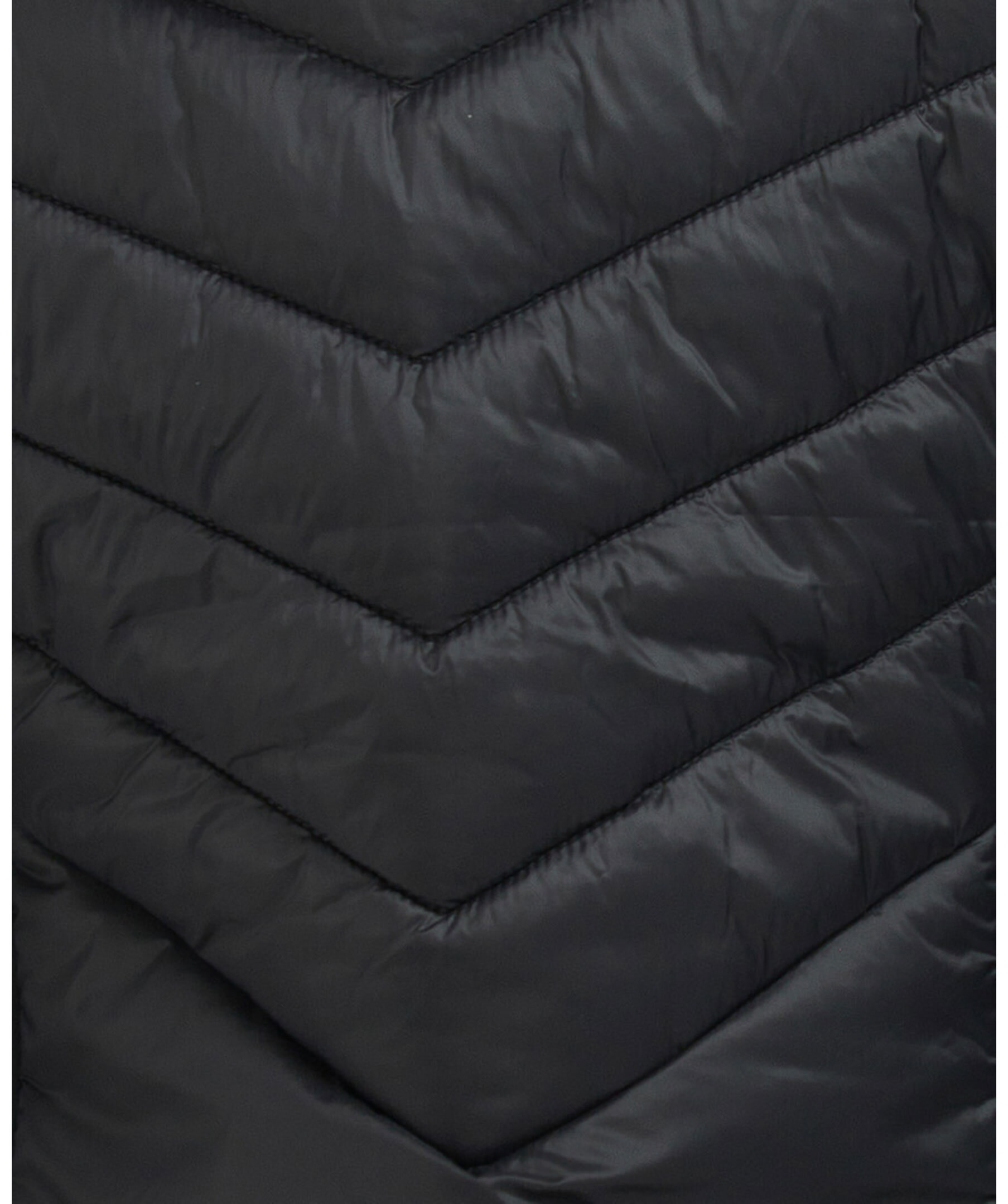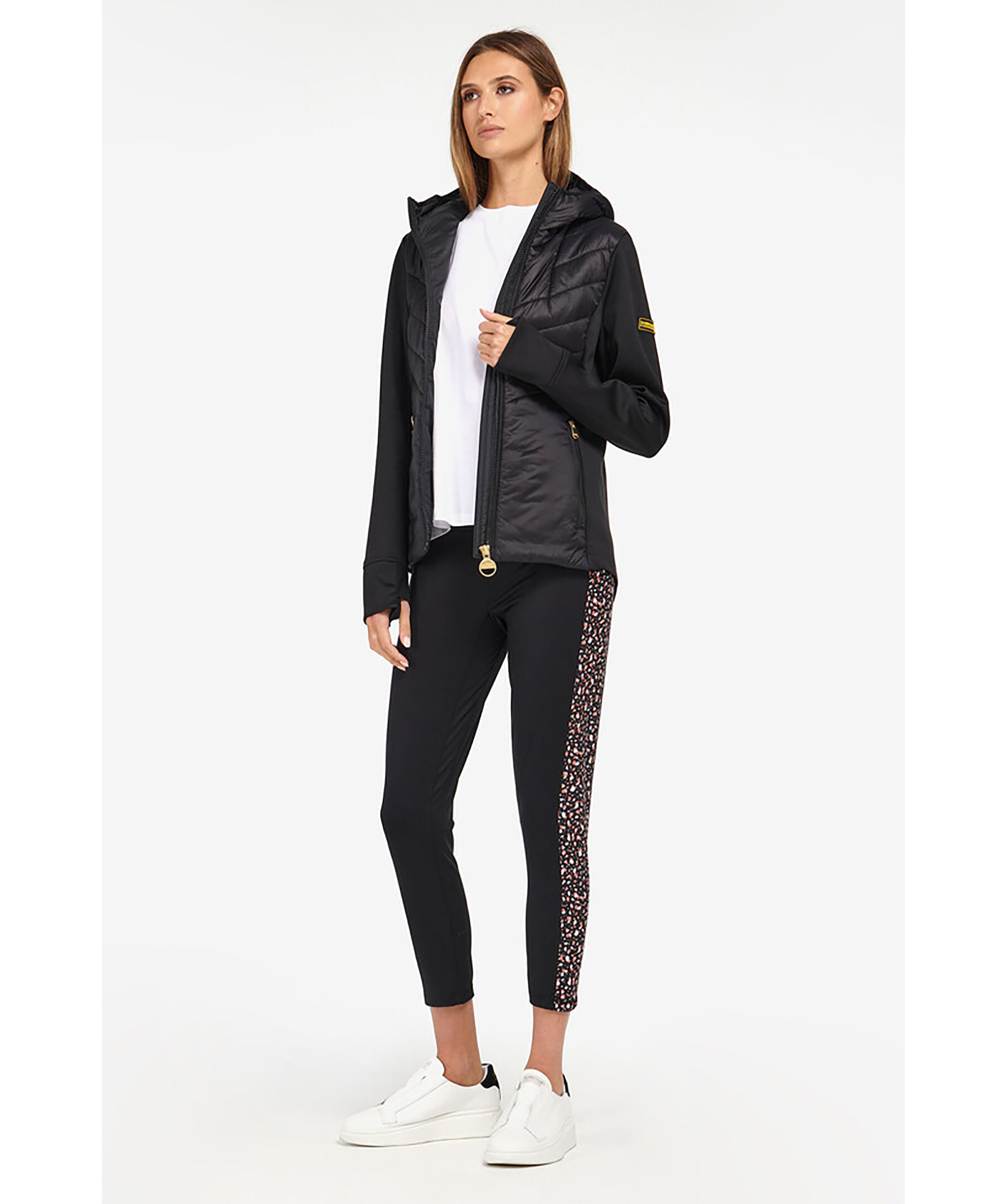 Svart quiltad jacka från Barbour med kontrasterande tygärmar. Tillverkad i en polyesterblandning. Designad med en ombonad huva och dragkedja framtill. Två sidfickor som stängs med dragkedja. Gul patch-logotyp på vänster arm.