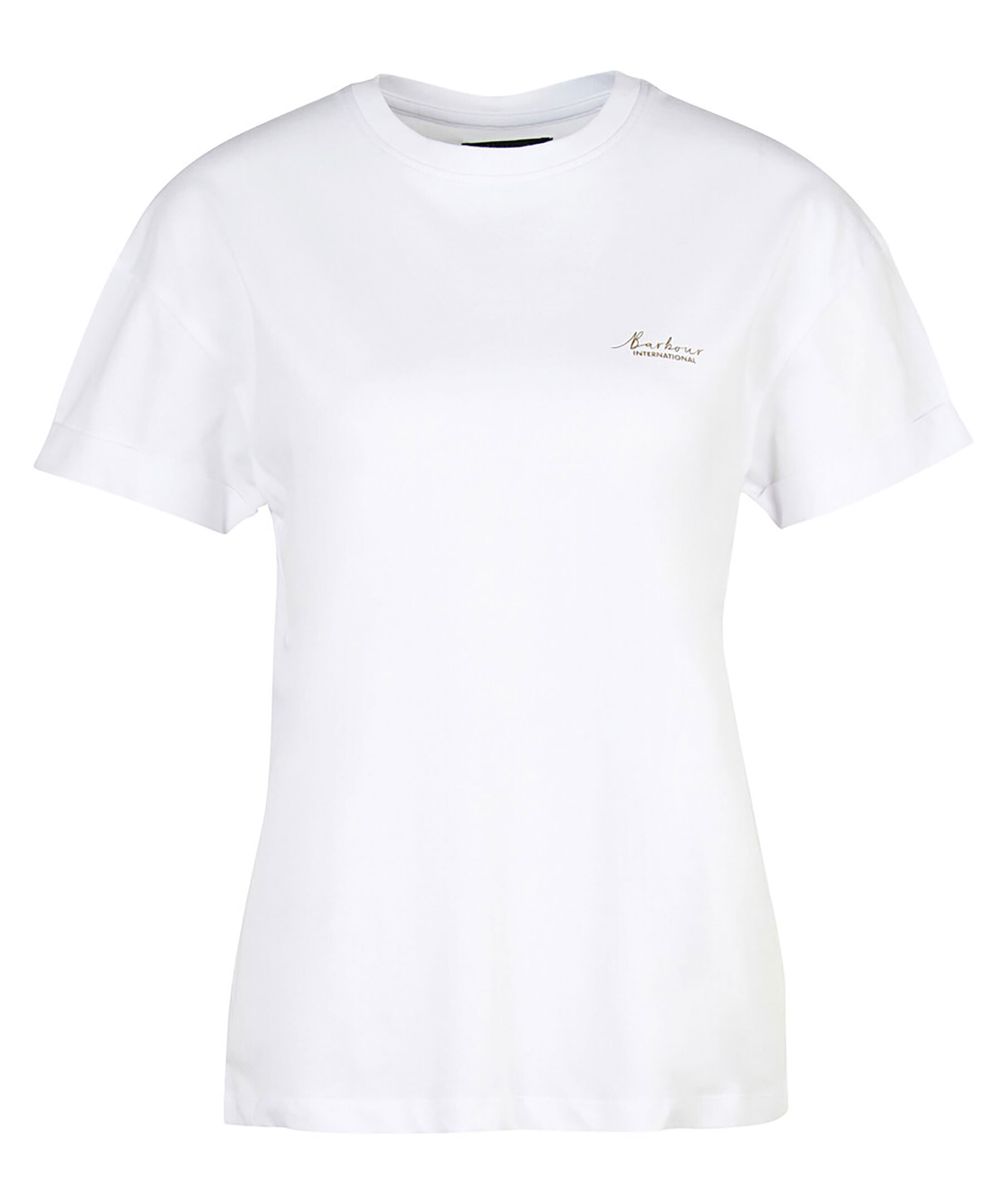 Vit t-shirt från Barbour. Tillverkad i 100% bomull. Rundad halsring. Guldig, tryckt logotyp på vänster sida av bröstet. Normal passform.