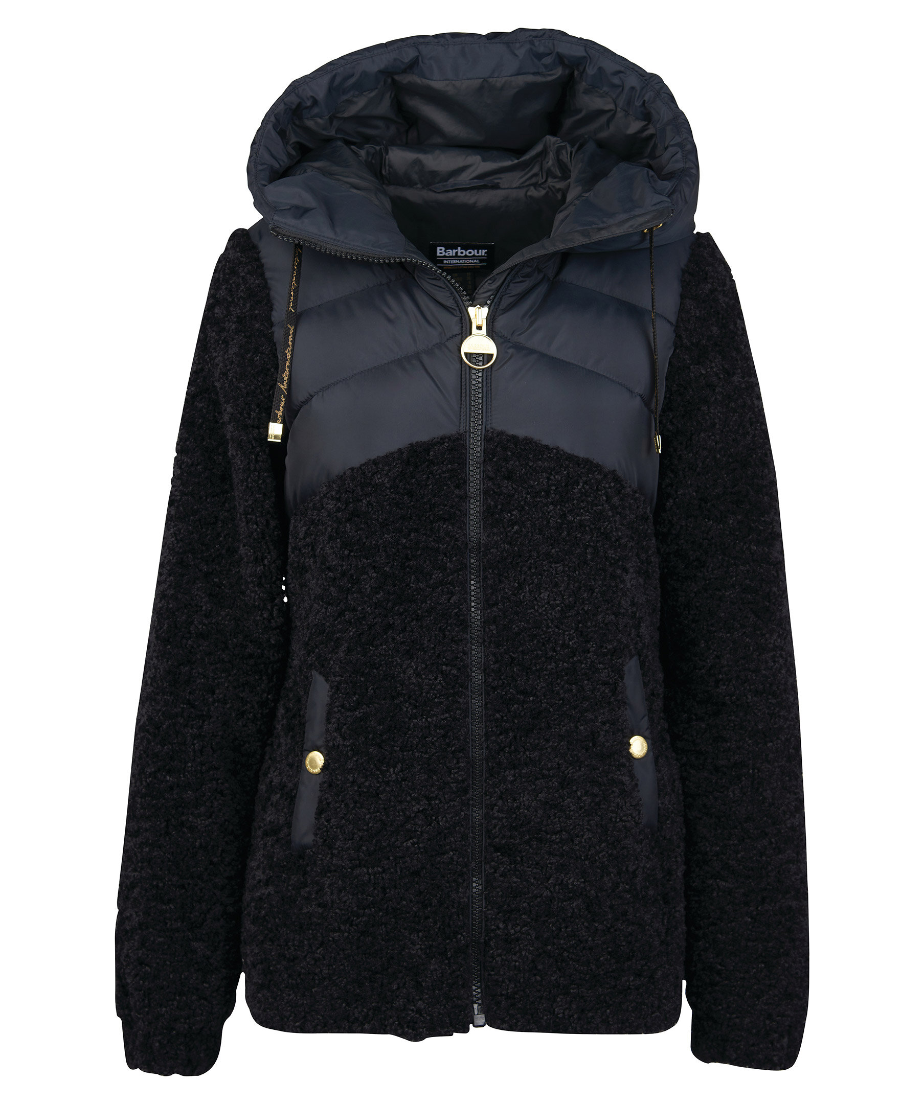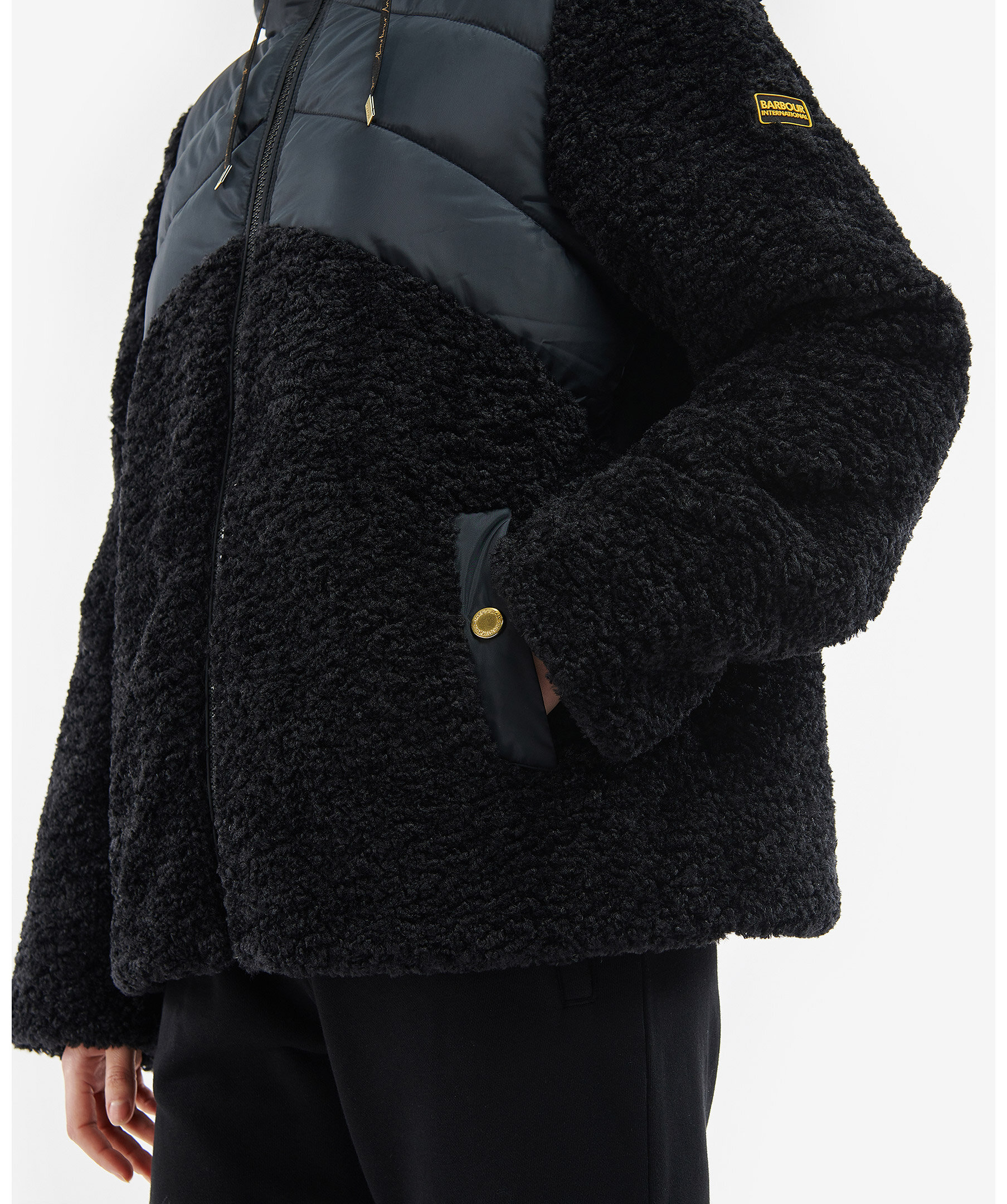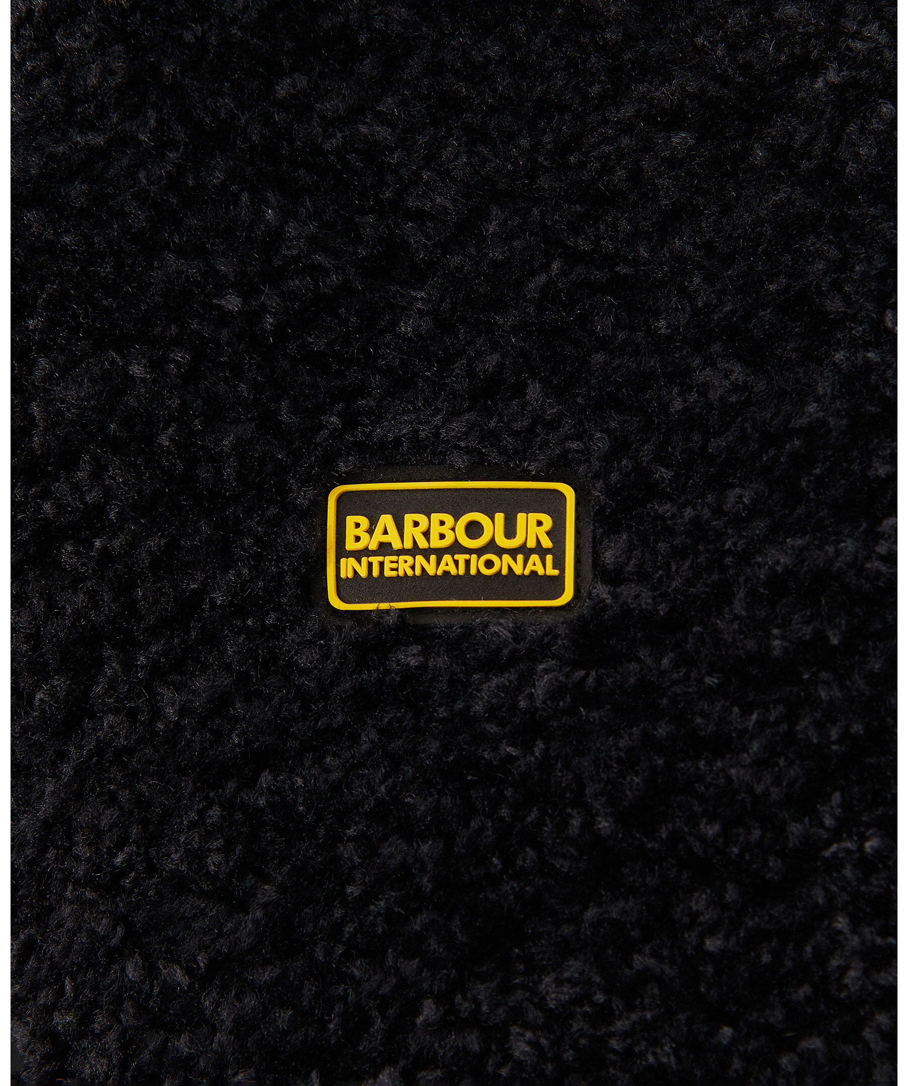 Svart fleecetröja i teddystil från Barbour International. Quiltat ok till huvan, snörning i luvan med logotyper på och en gummerad logotyp på vänster ärm.Stängs med dragkedja fram och har framfickor som stängs med tryckknapp. Denna är stor i storleken, gå ner i storlek om du inte vill ha den alltför oversize.