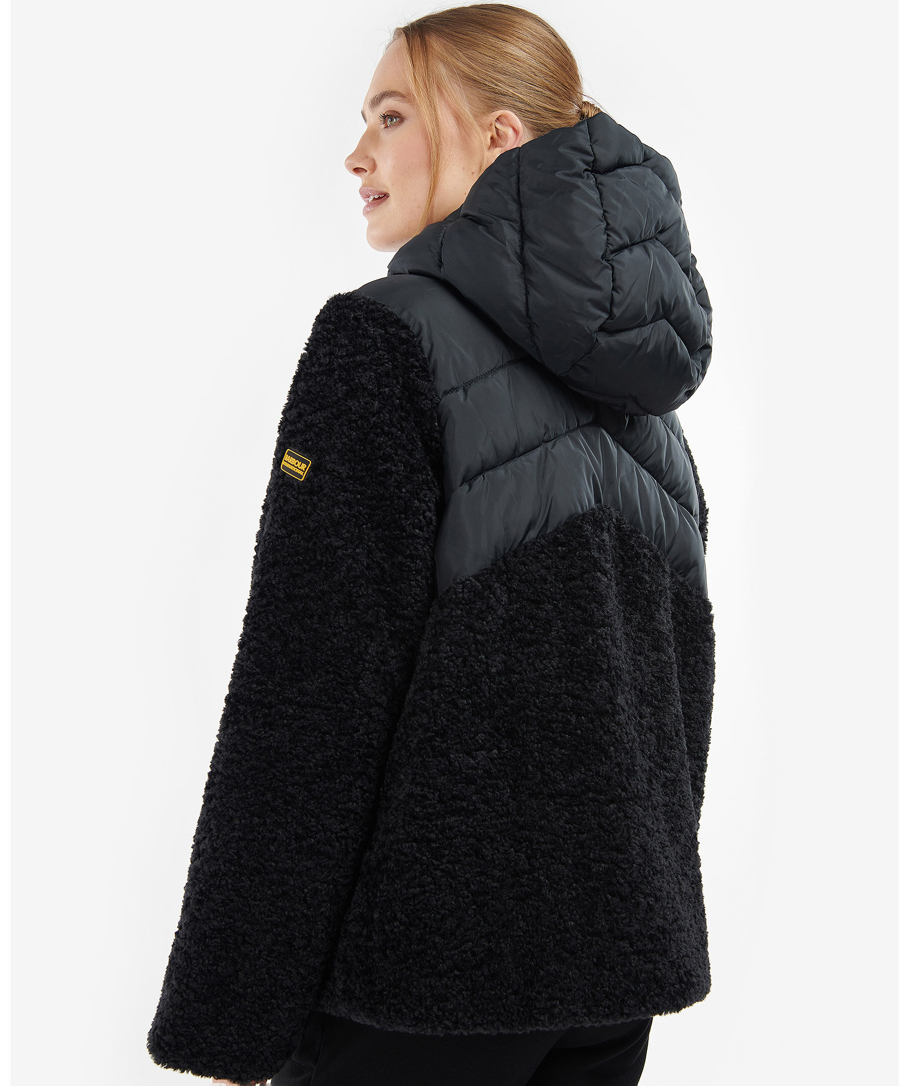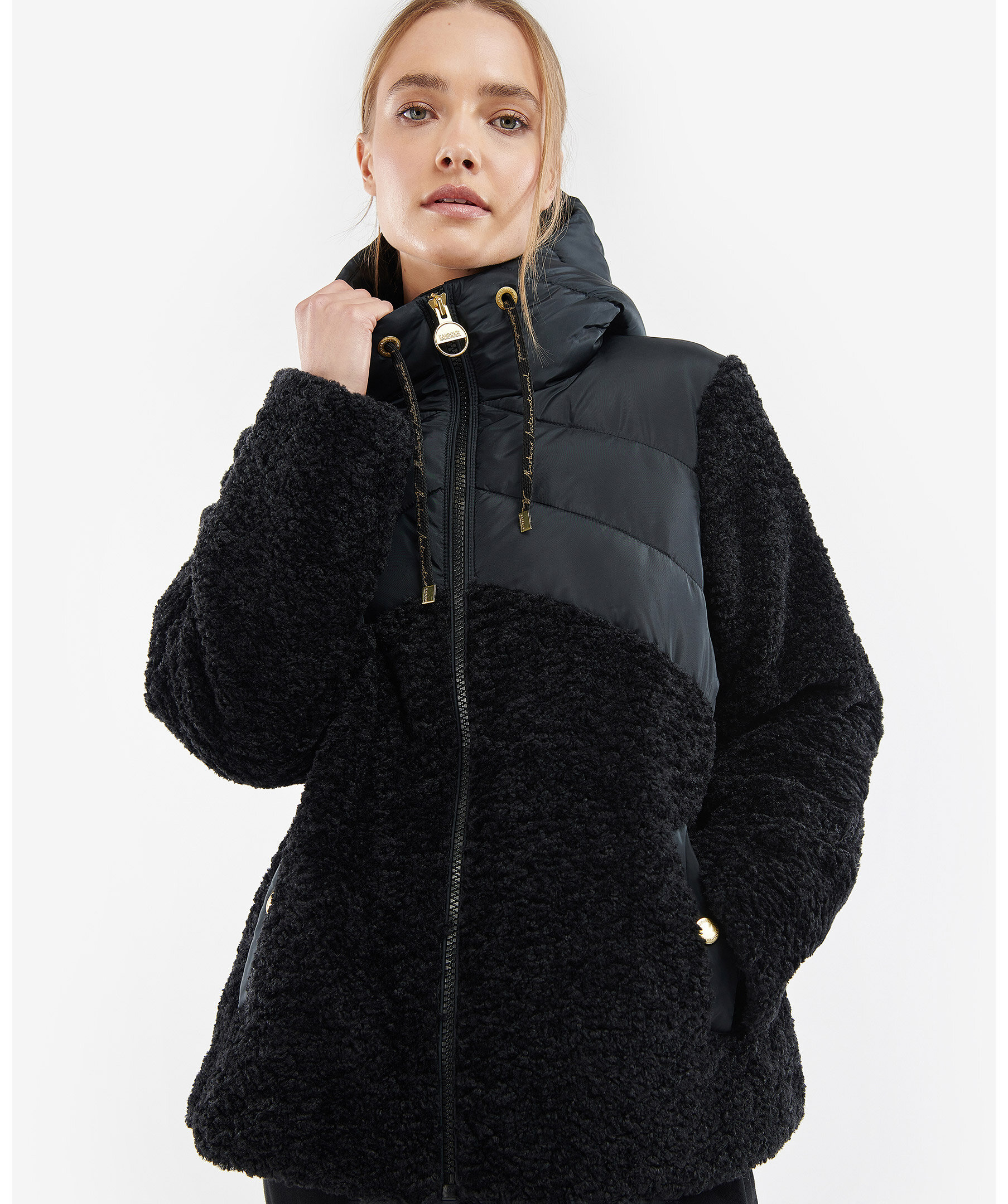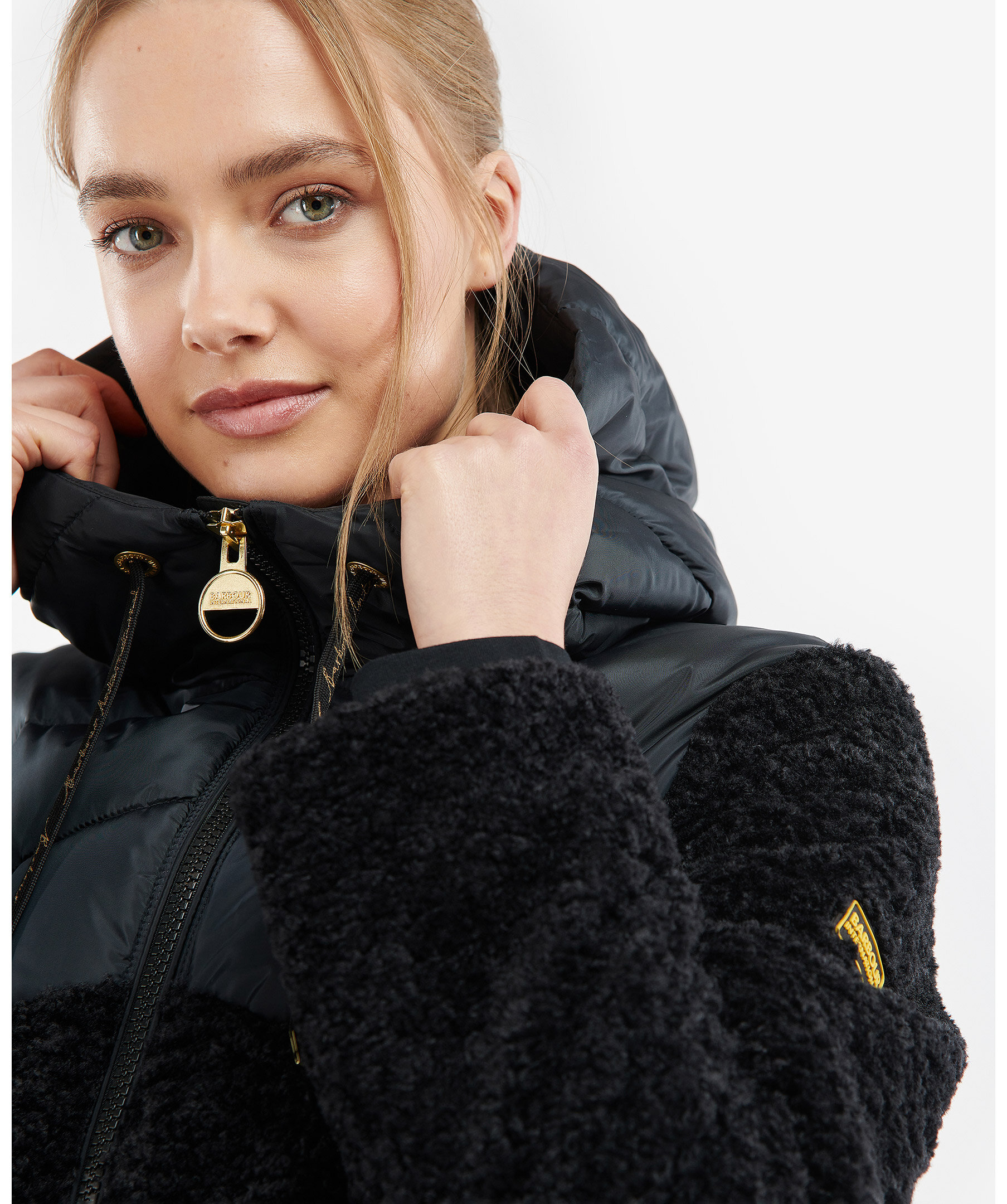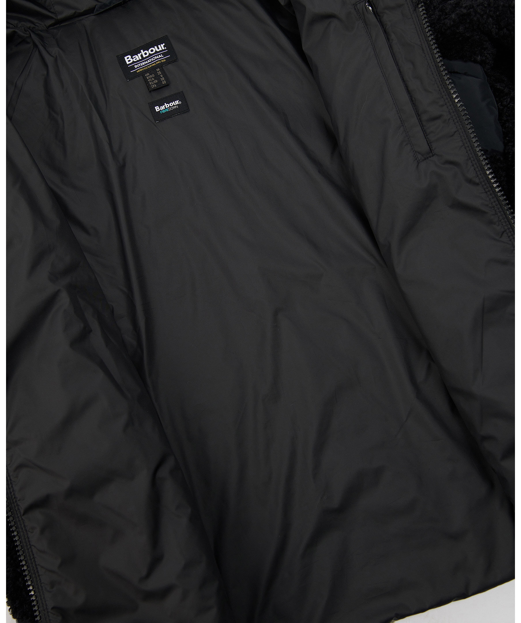 Svart fleecetröja i teddystil från Barbour International. Quiltat ok till huvan, snörning i luvan med logotyper på och en gummerad logotyp på vänster ärm.Stängs med dragkedja fram och har framfickor som stängs med tryckknapp. Denna är stor i storleken, gå ner i storlek om du inte vill ha den alltför oversize.