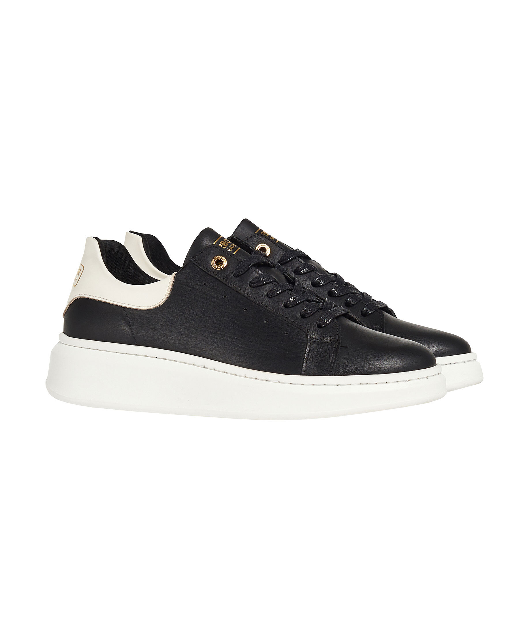 Svarta sneaker i läder från Barbour International. De är gjorda av 100 % läder med en klassiskt snörning med svarta skosnören och guldfärgade öljetter längst upp. Guldfärgad logotyp på plösen och bak på hälen. Vit sula i gummi och vit kontrastdetalj på hälen.