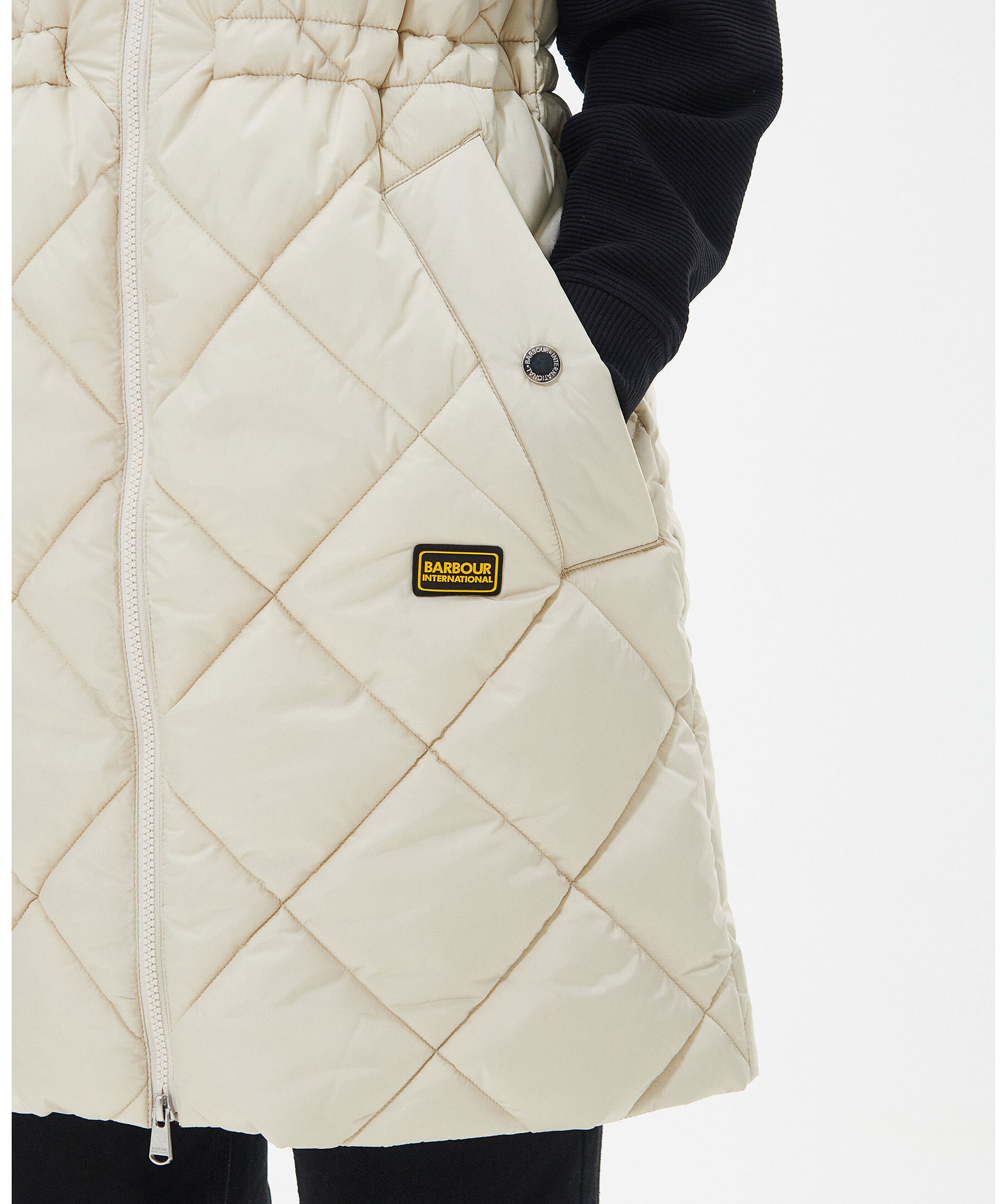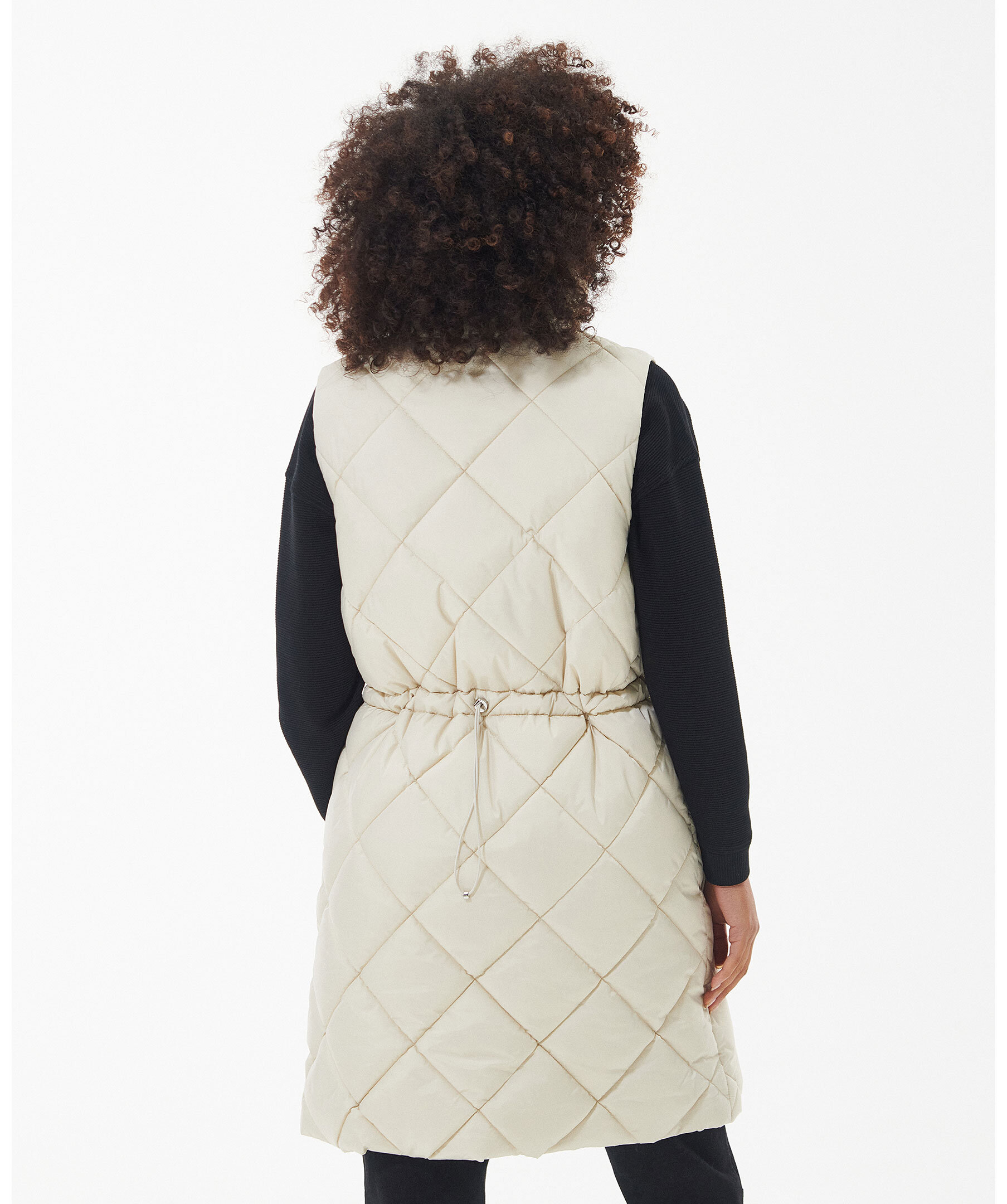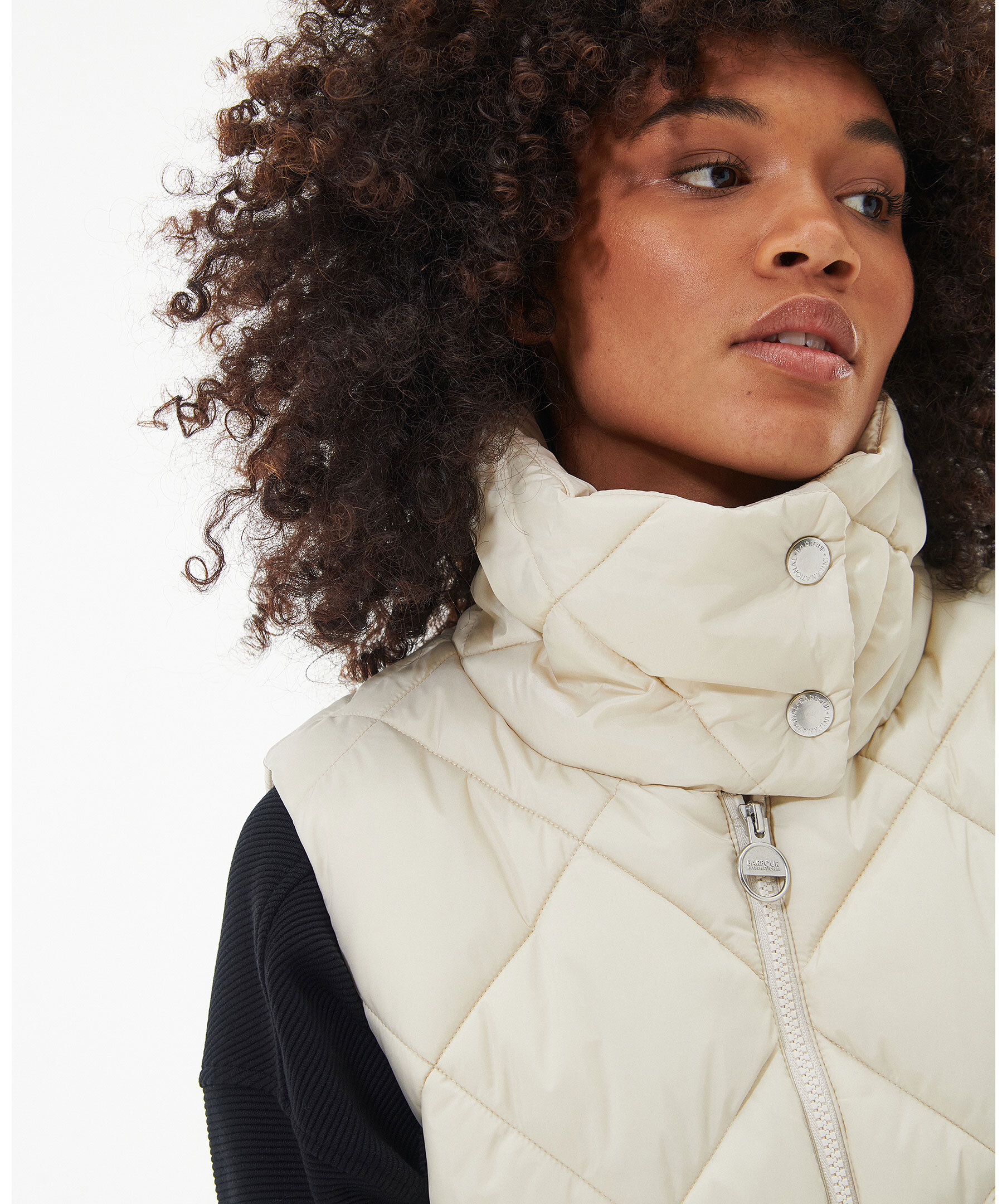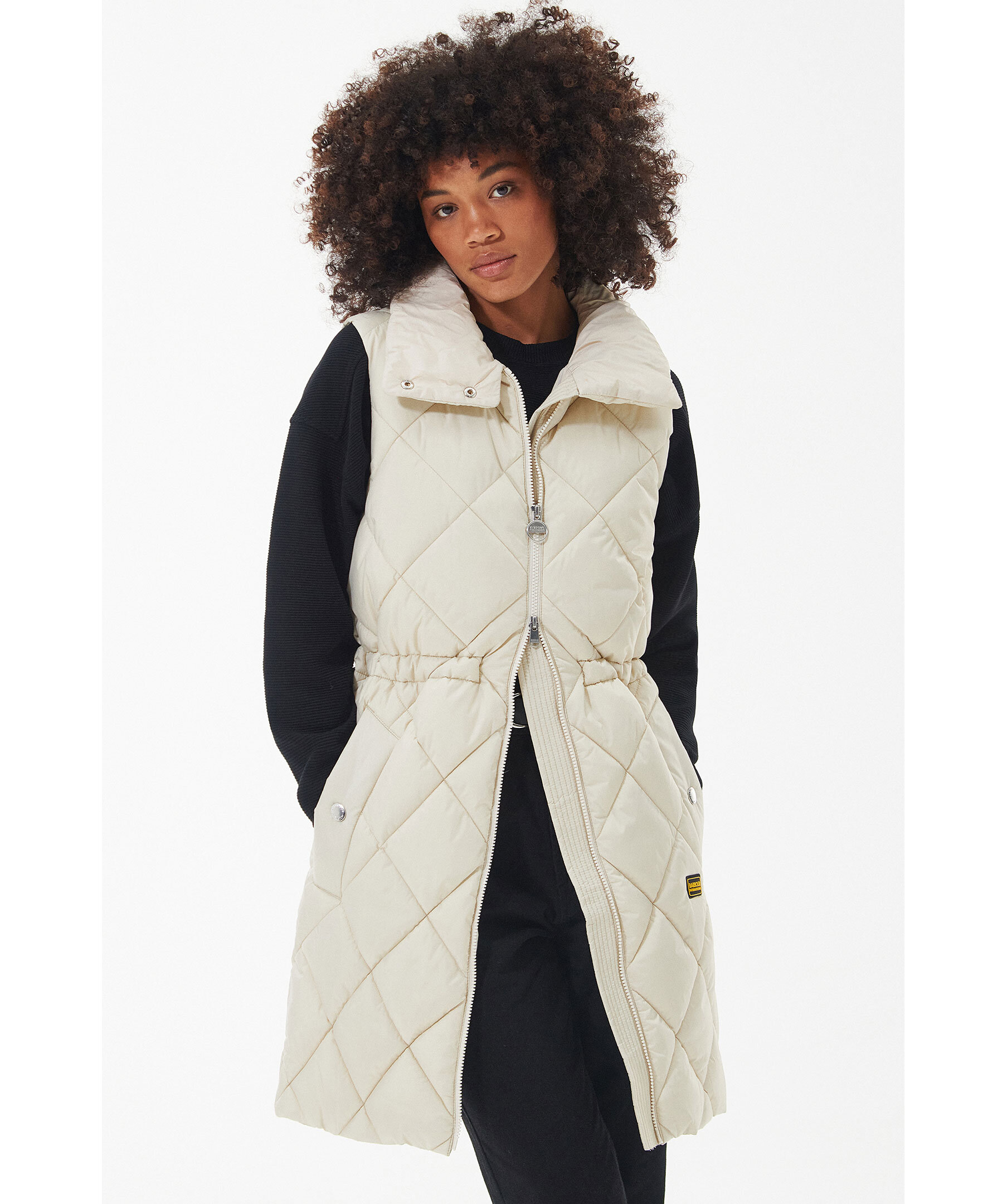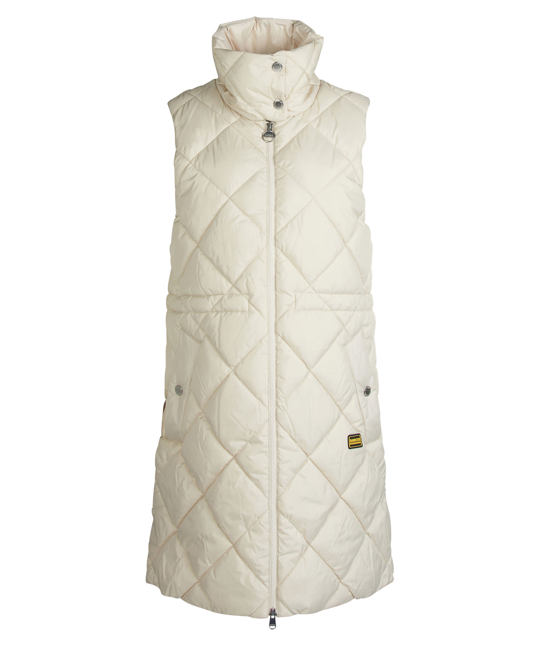 Vit quiltad vadderad väst från Barbour, Stängs framtill med tvåvägsdragkedja. Dragsko i midjan. Två fickor framtill som stängs med tryckknapp. Hög krage med tryckknappar. Gummerad patch med logotyp under vänster ficka.