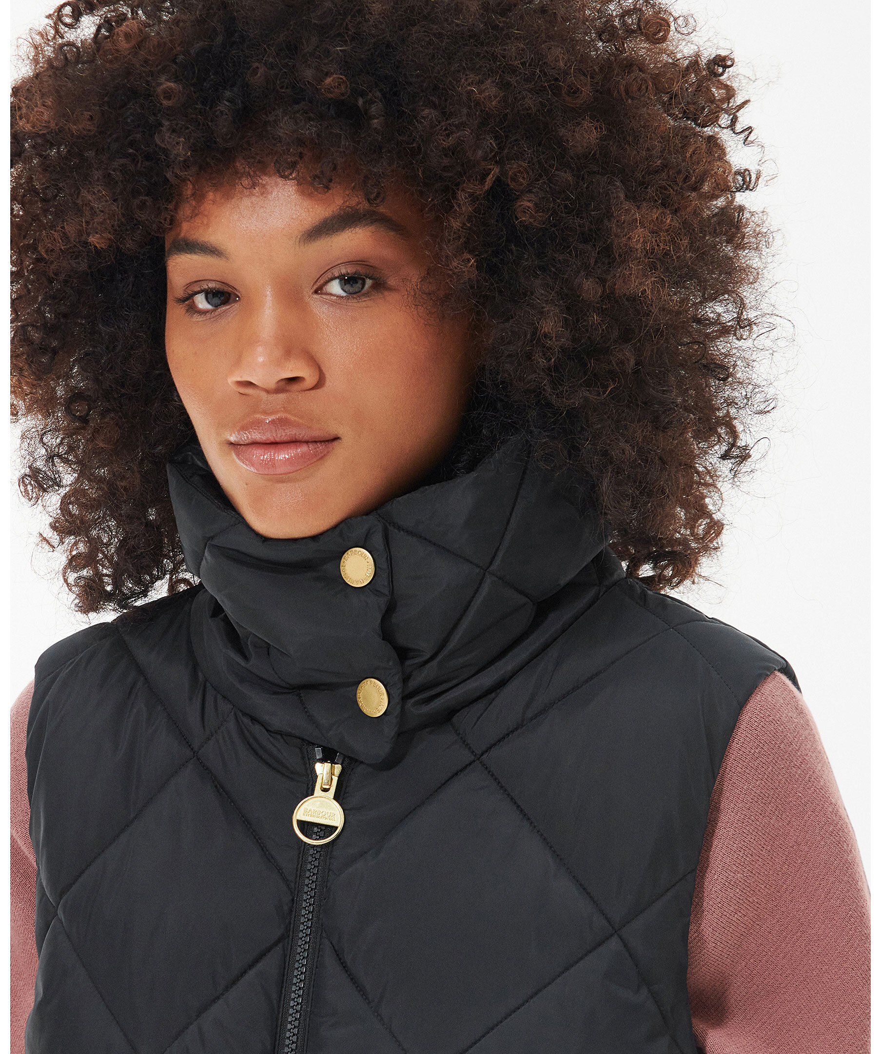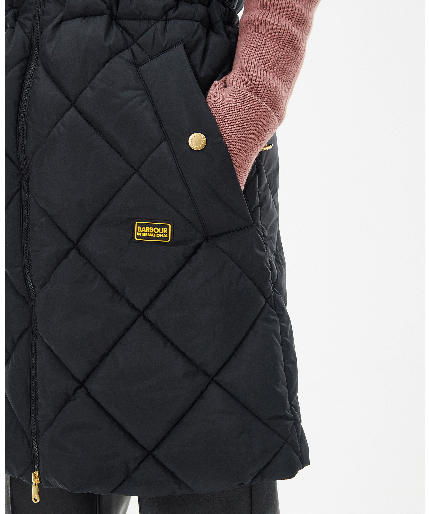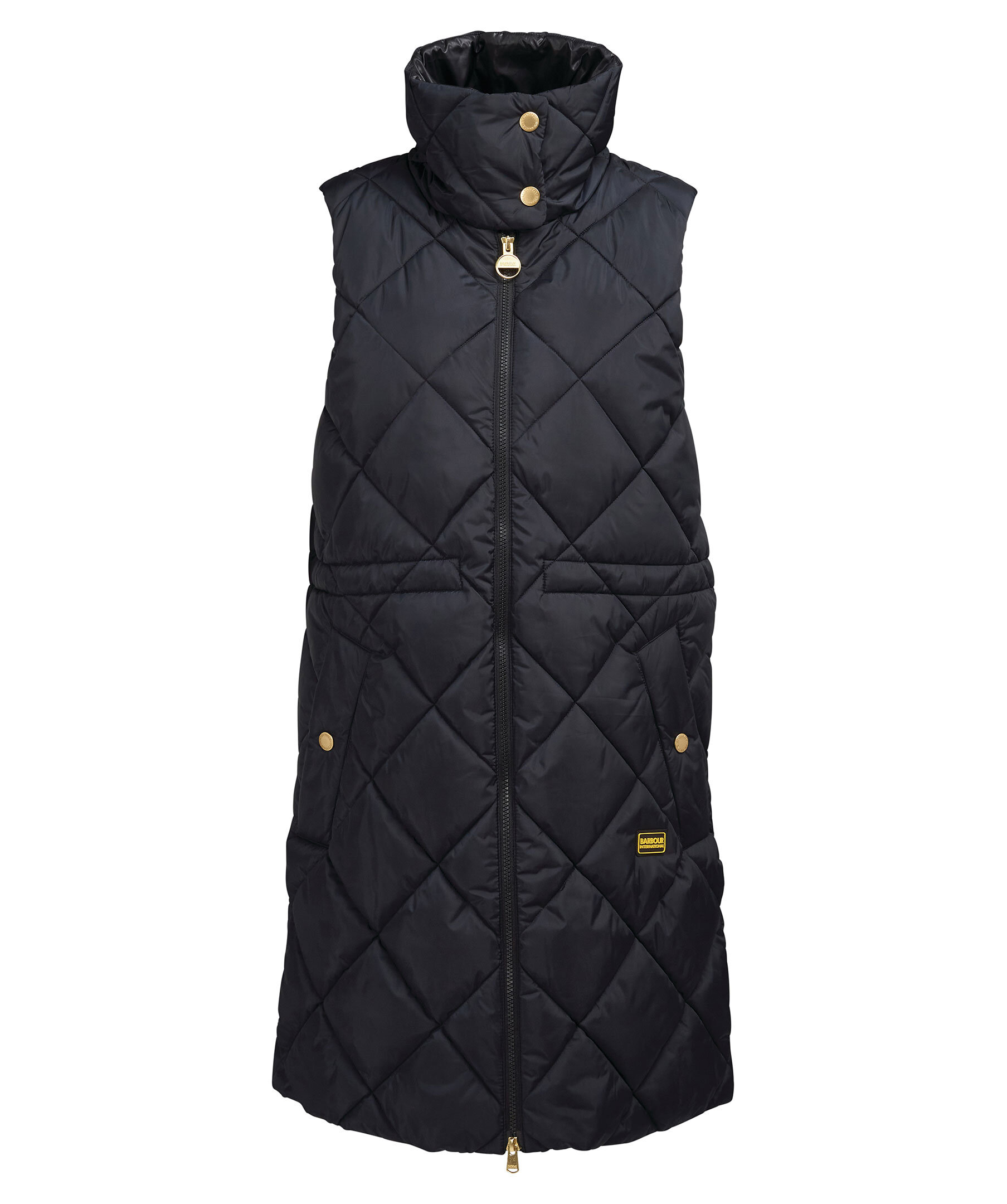 Svart quiltad vadderad väst från Barbour, Stängs framtill med tvåvägsdragkedja. Dragsko i midjan. Två fickor framtill som stängs med tryckknapp. Hög krage med tryckknappar. Gummerad patch med logotyp under vänster ficka.