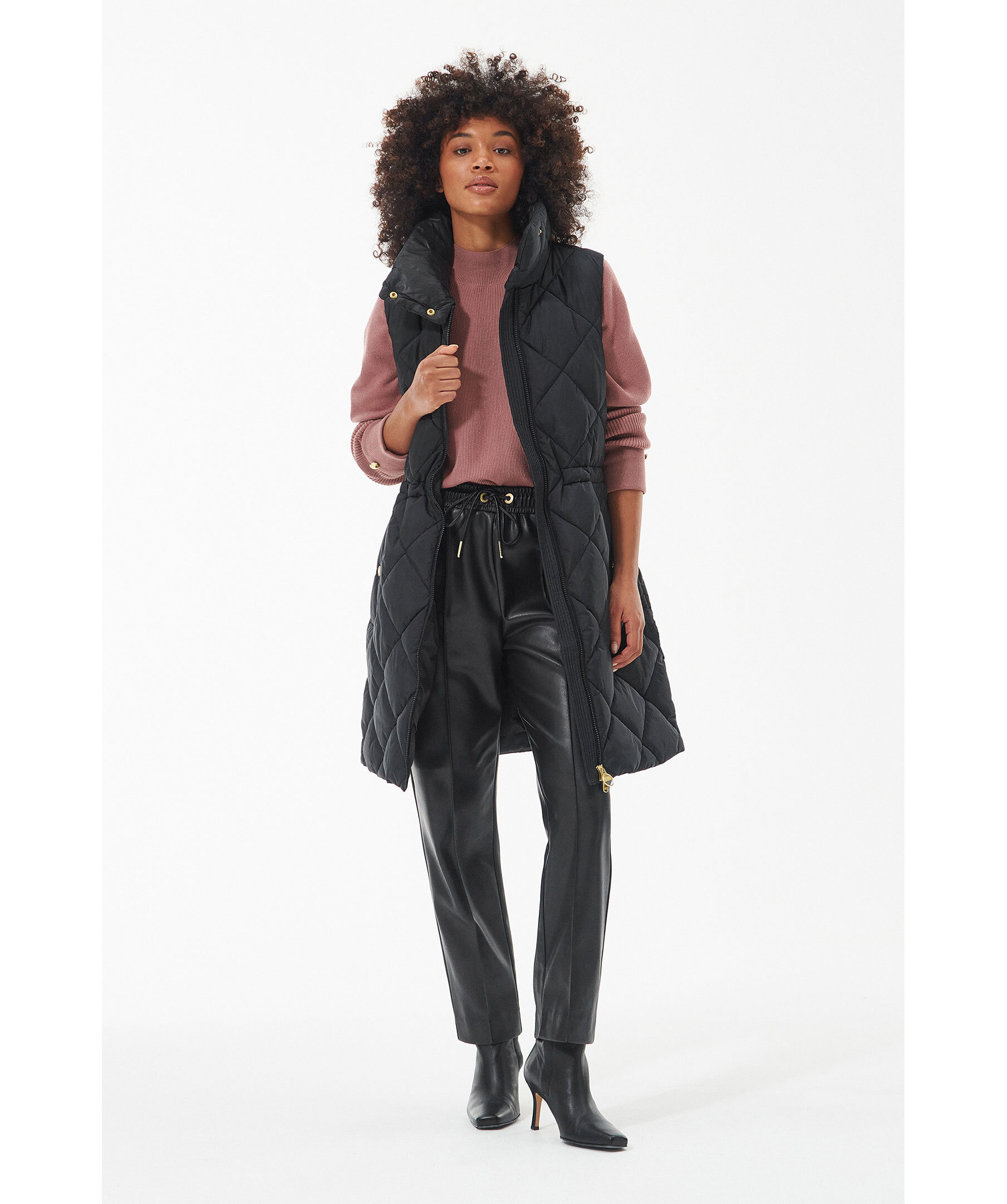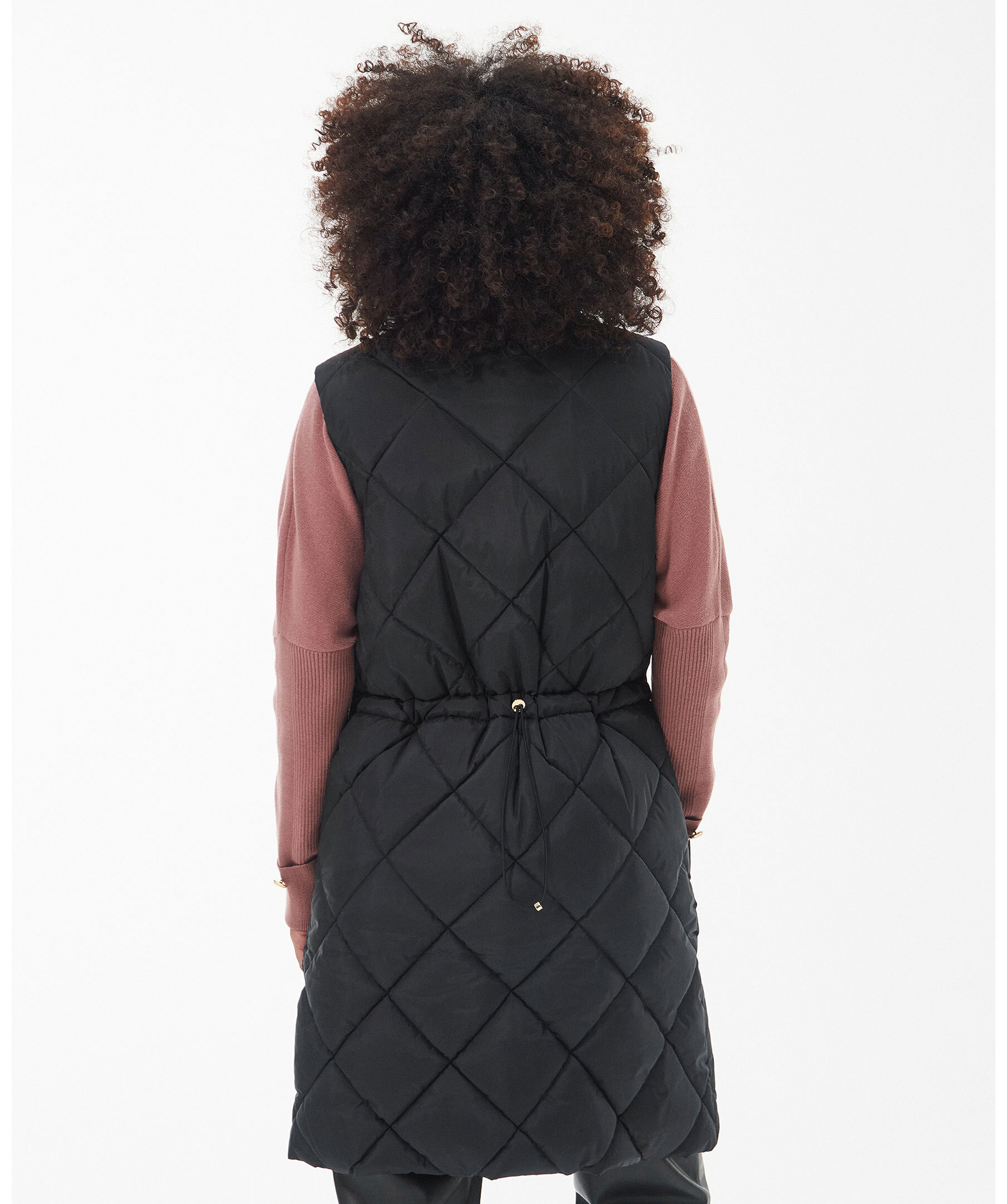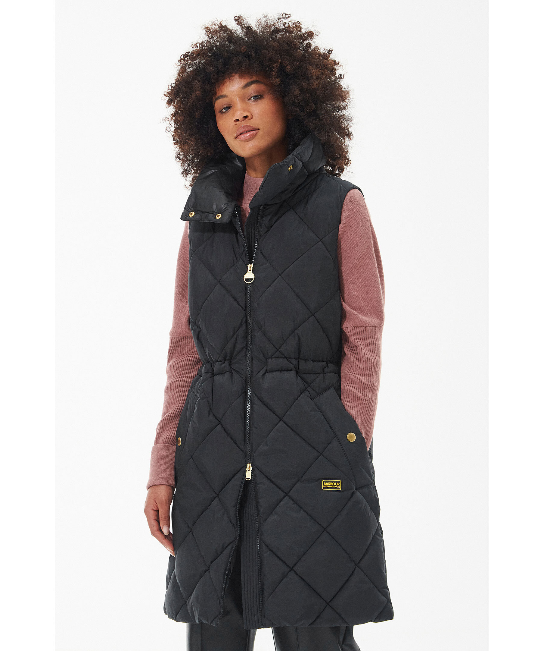 Svart quiltad vadderad väst från Barbour, Stängs framtill med tvåvägsdragkedja. Dragsko i midjan. Två fickor framtill som stängs med tryckknapp. Hög krage med tryckknappar. Gummerad patch med logotyp under vänster ficka.