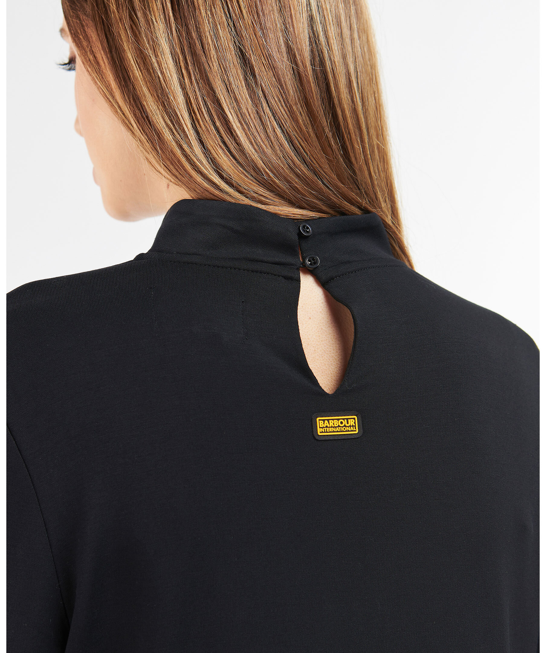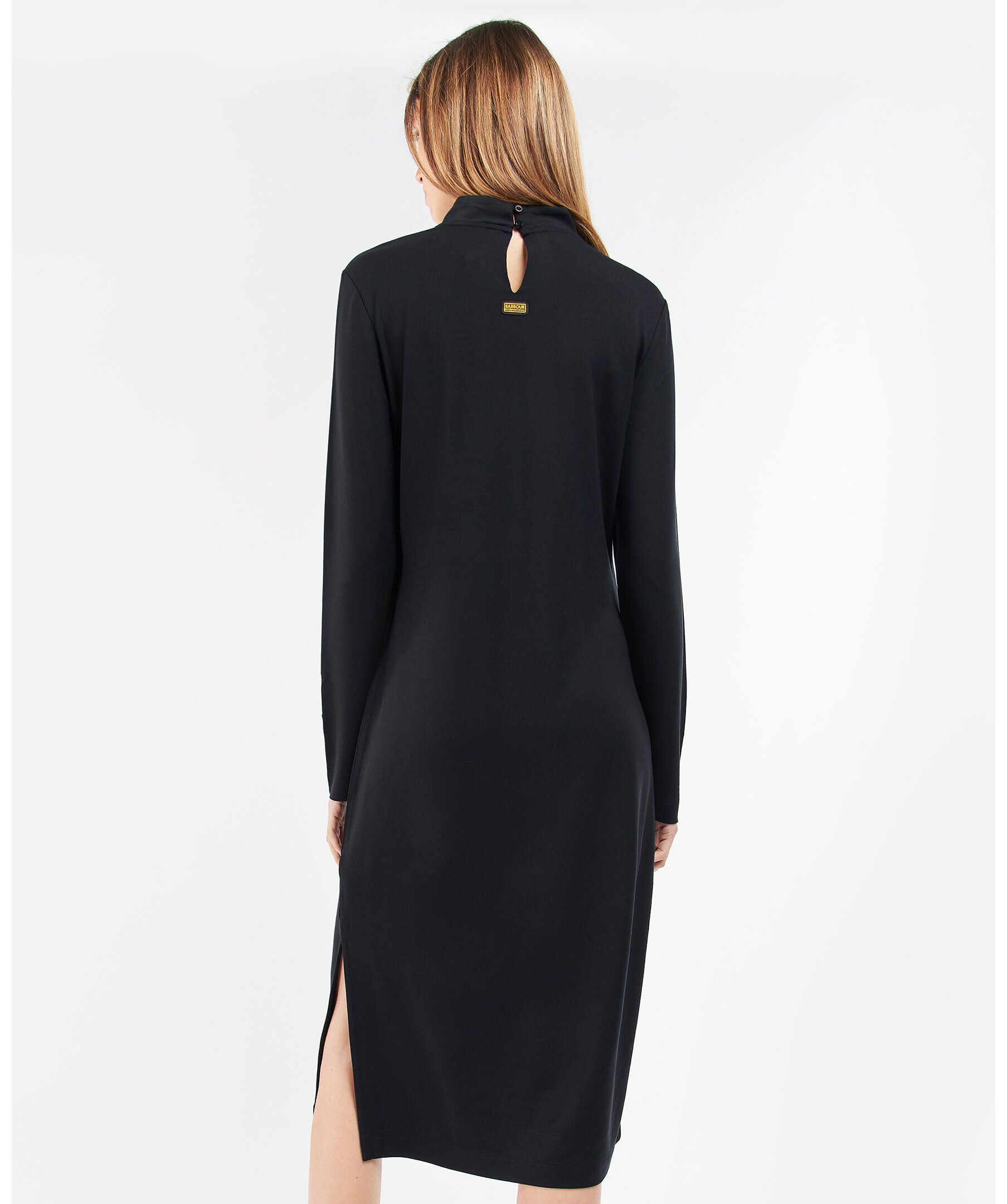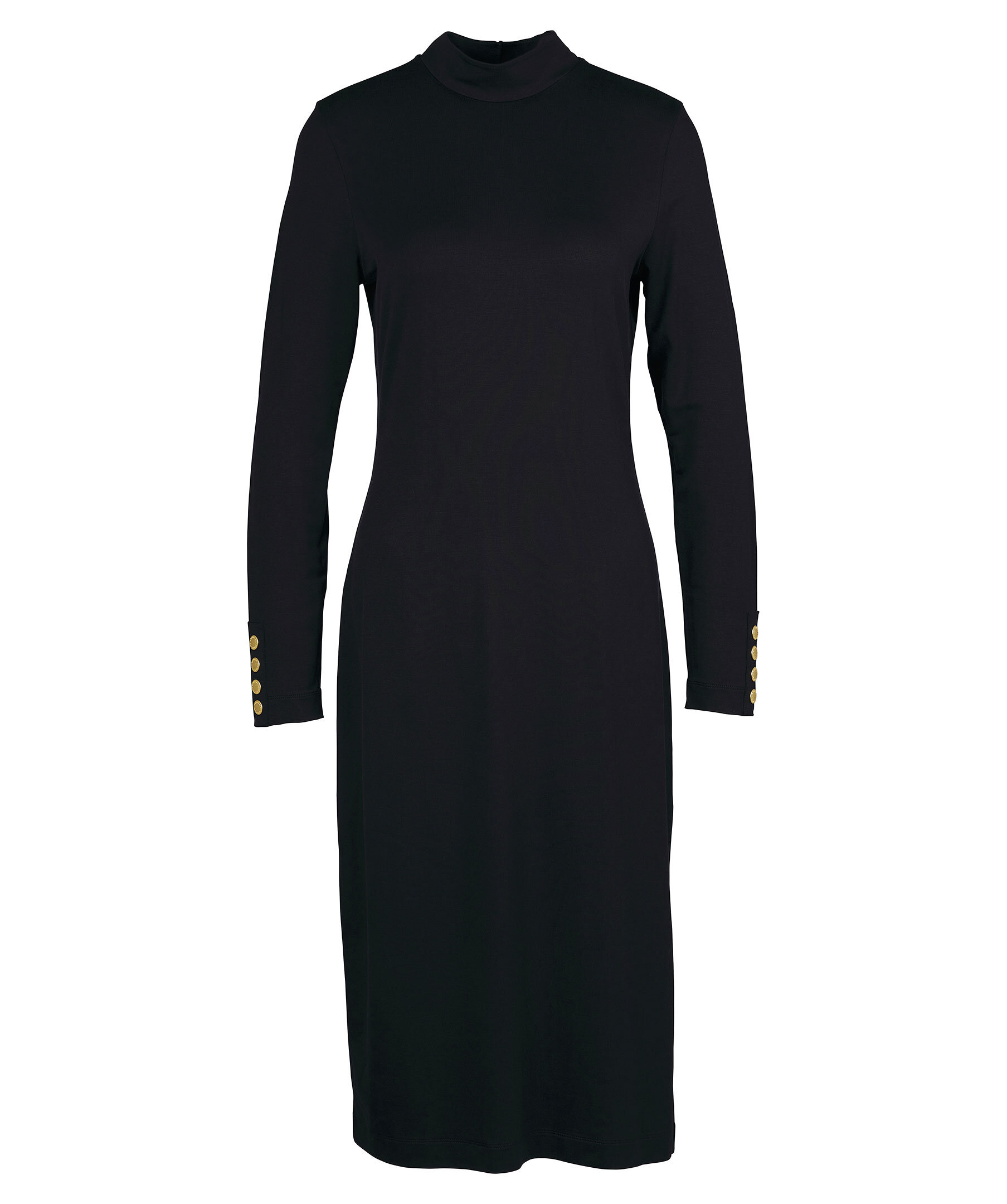 Svart finstickad klänning från Barbour med hög krage. Manschetter med guldfärgade knappar. Patch med logotyp baktill i nacken.