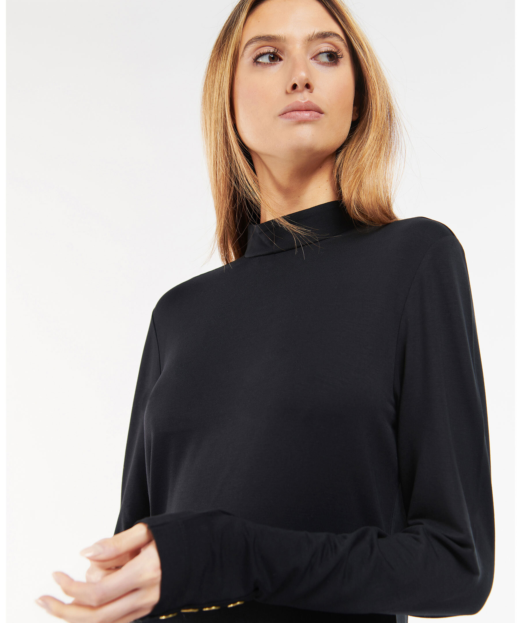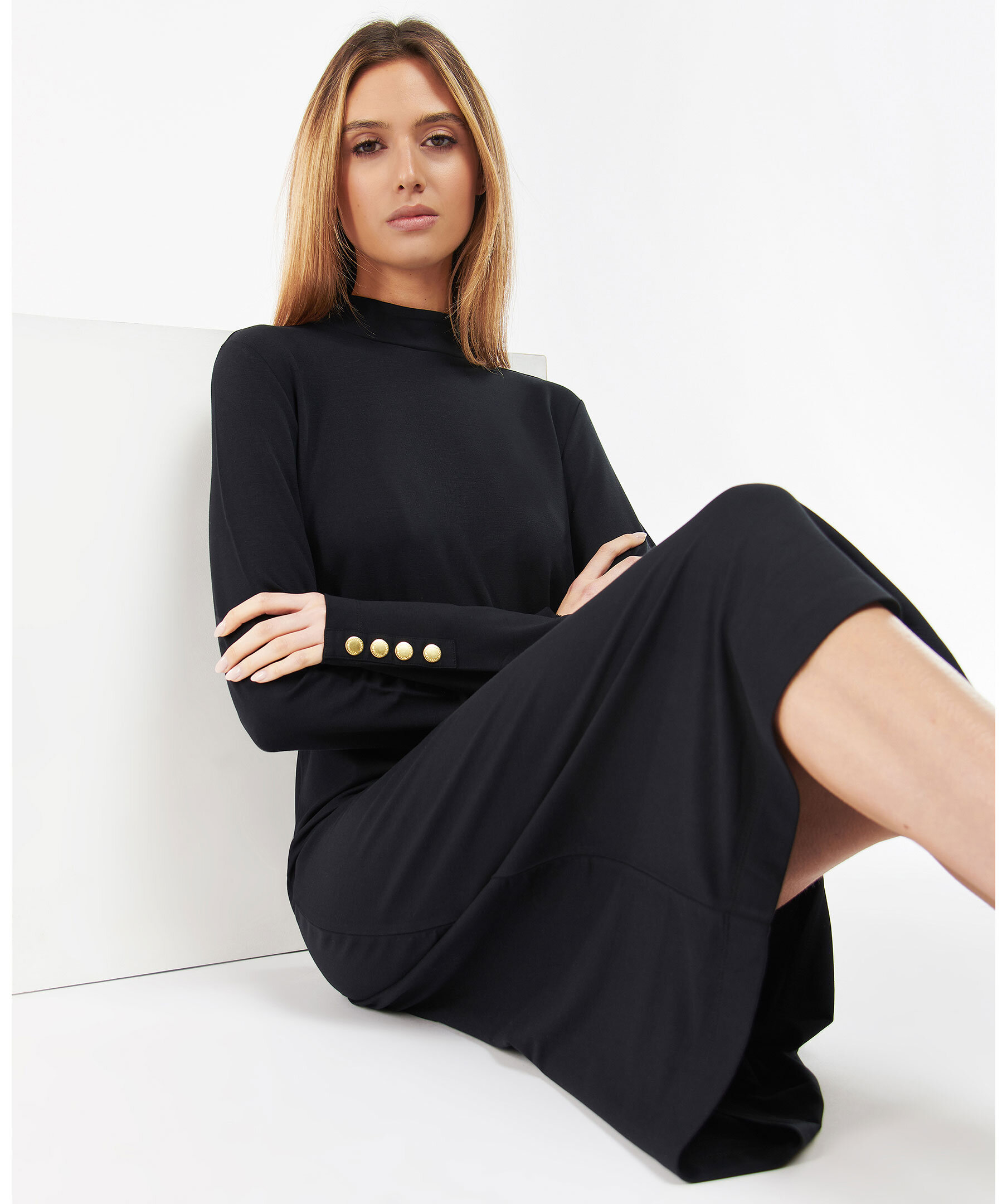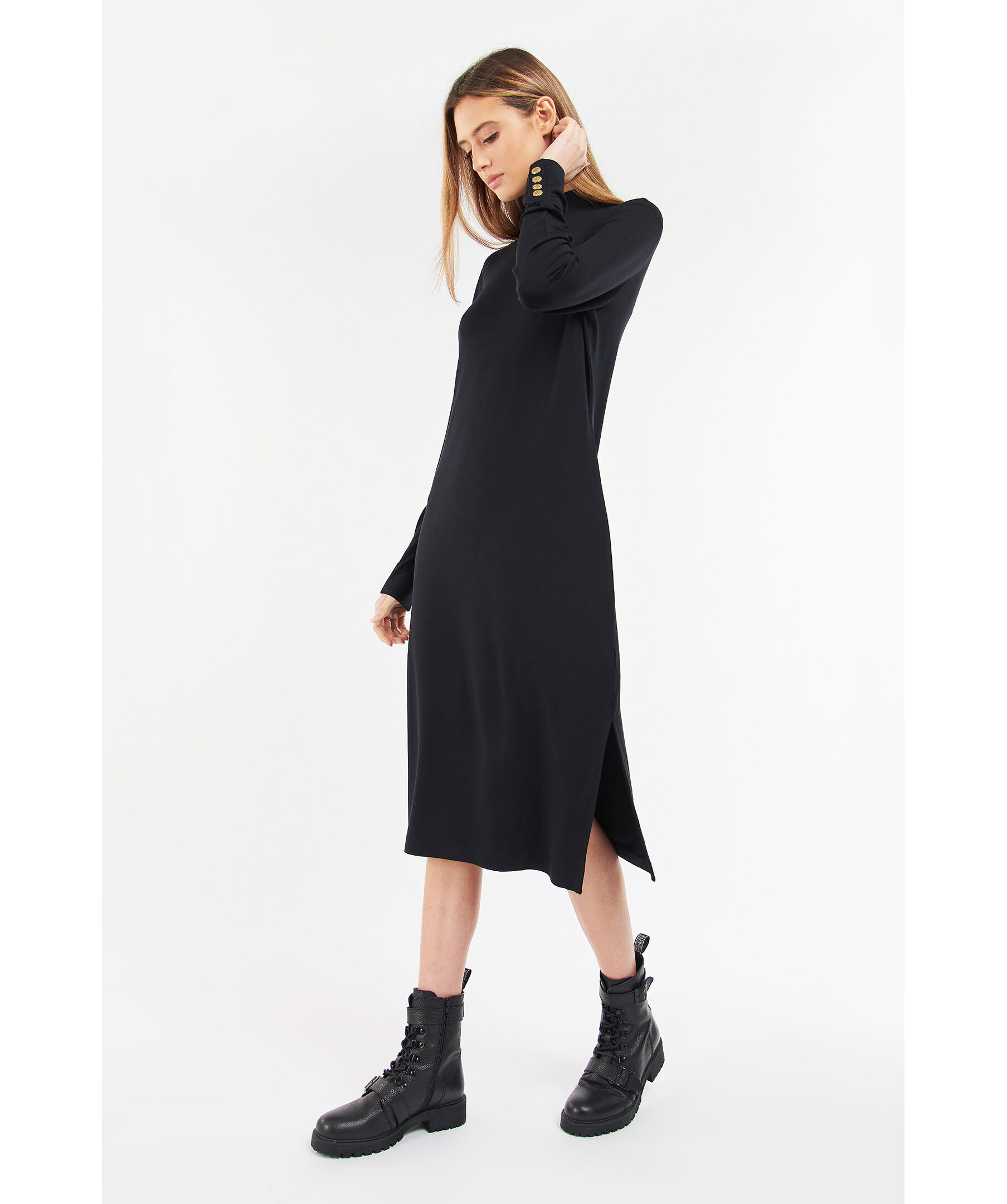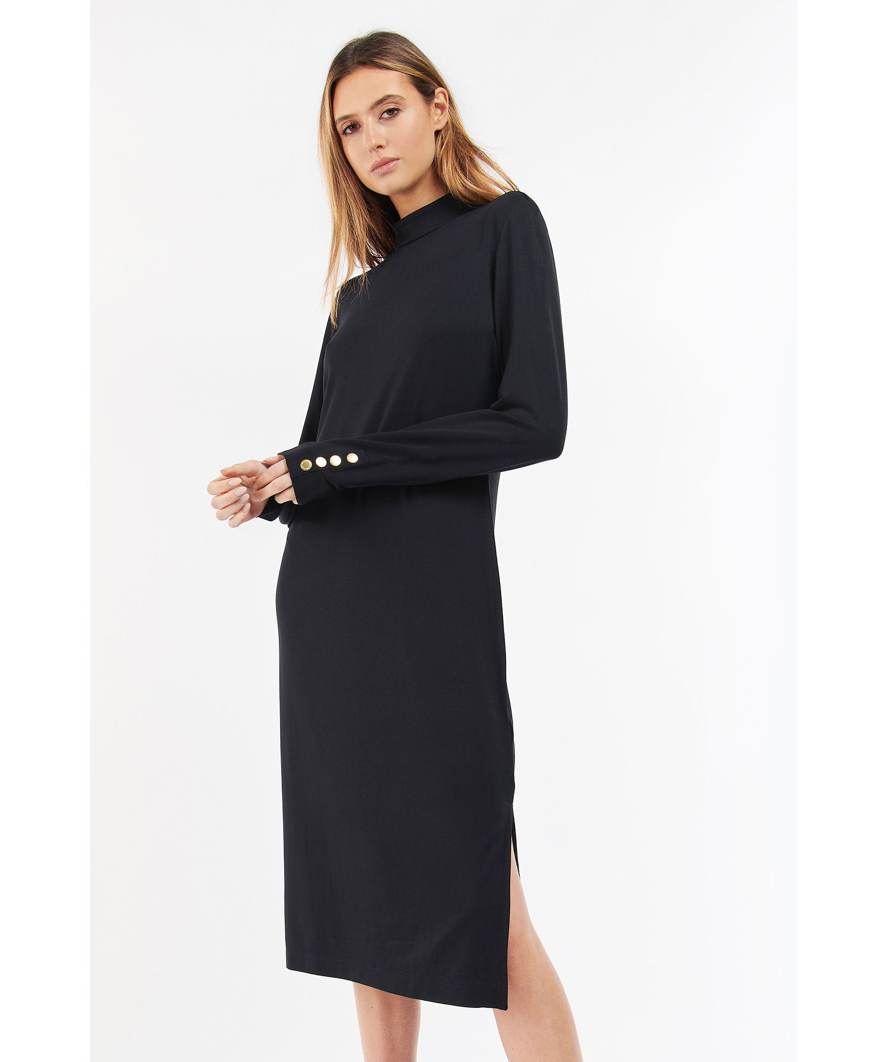 Svart finstickad klänning från Barbour med hög krage. Manschetter med guldfärgade knappar. Patch med logotyp baktill i nacken.