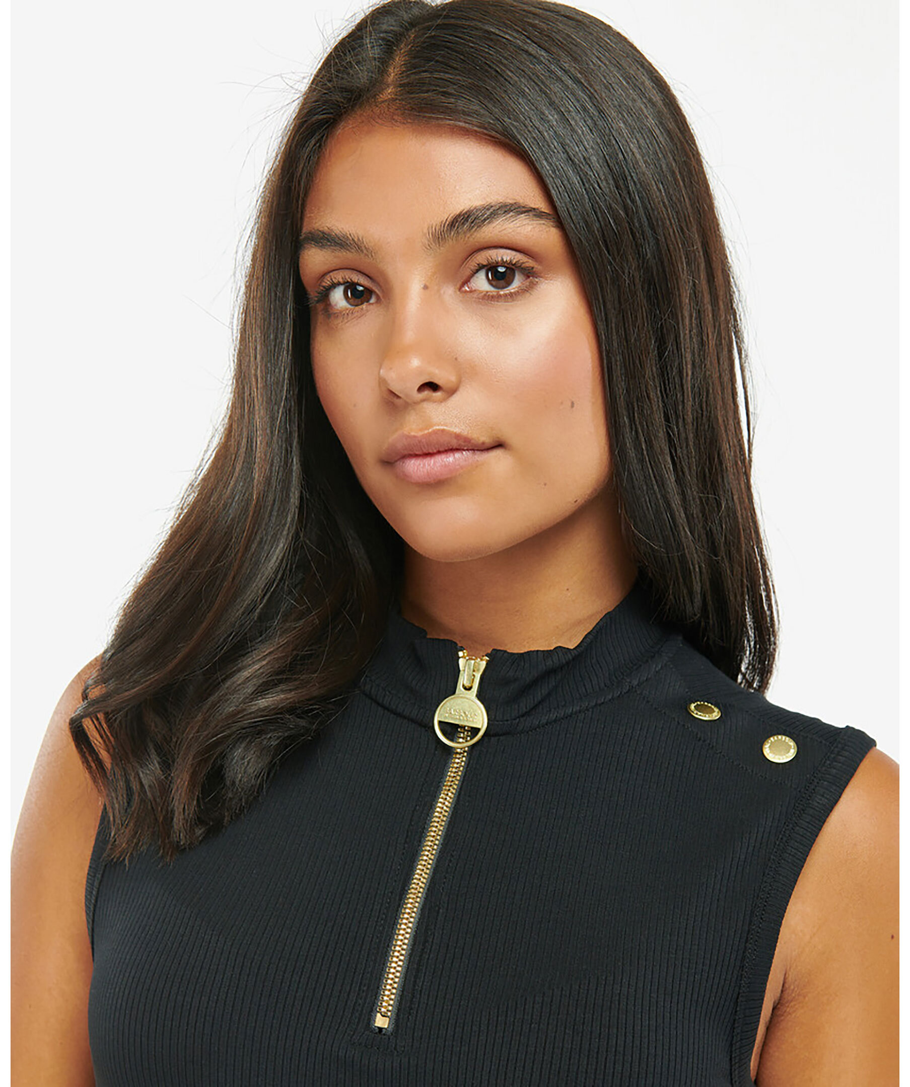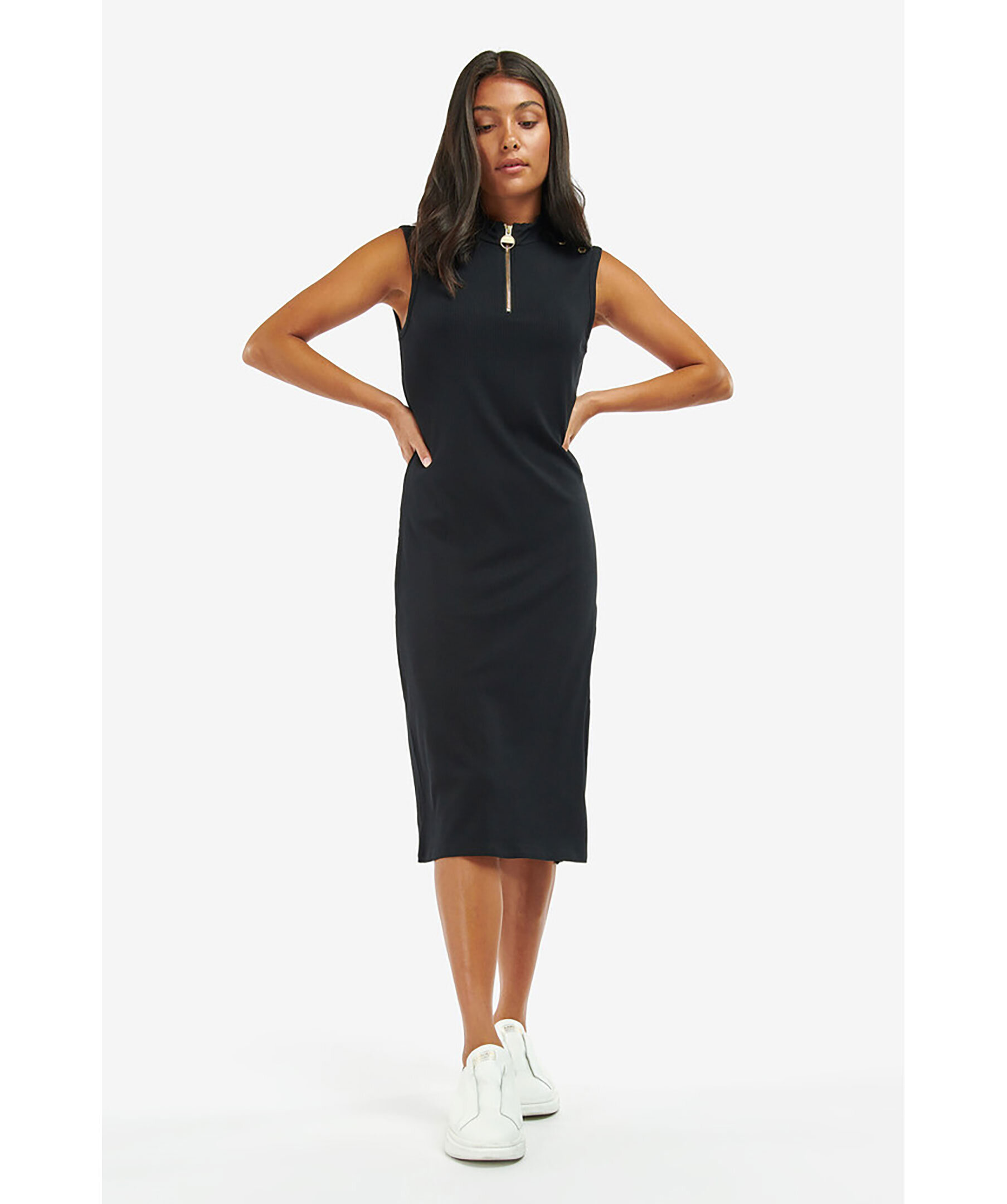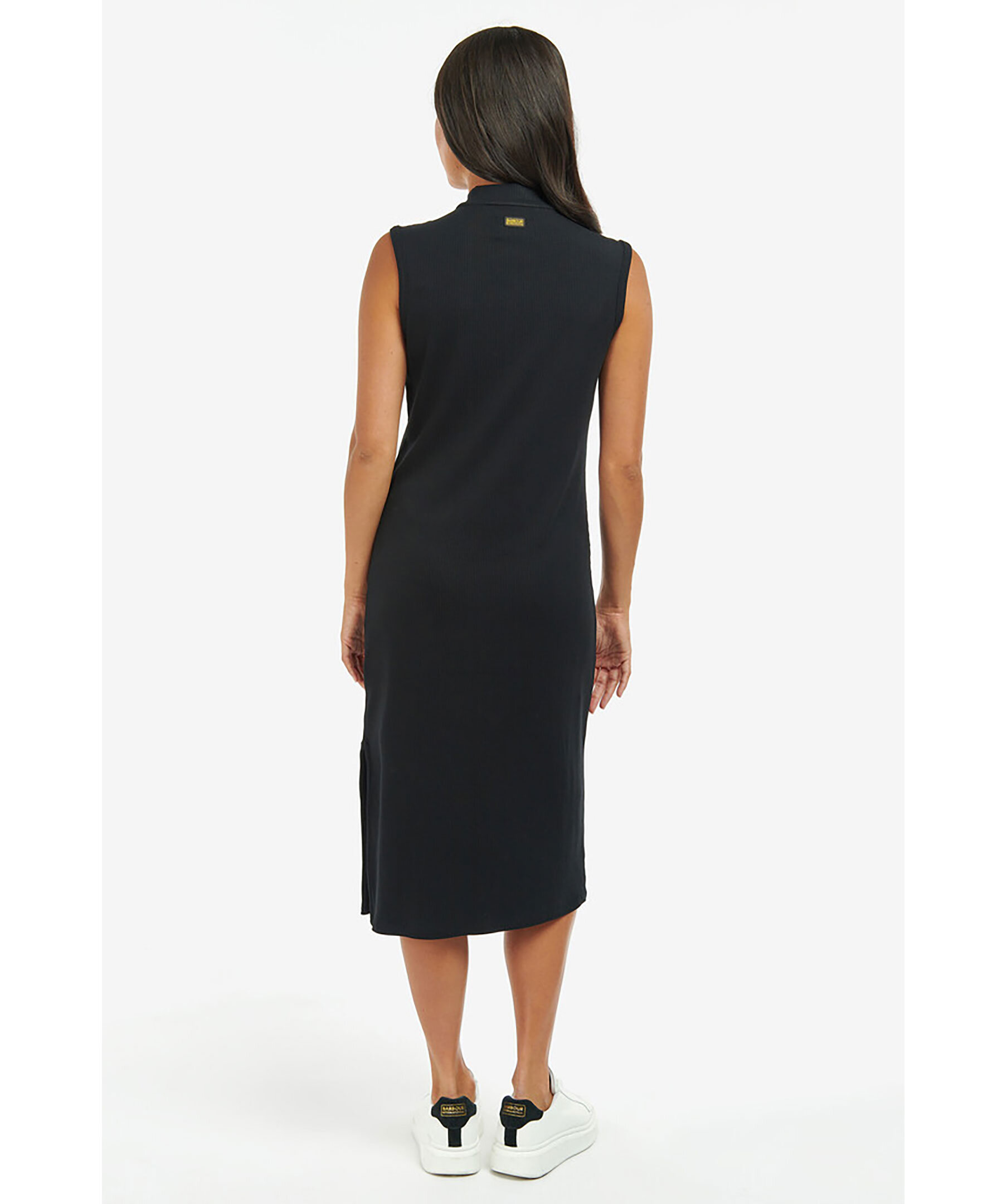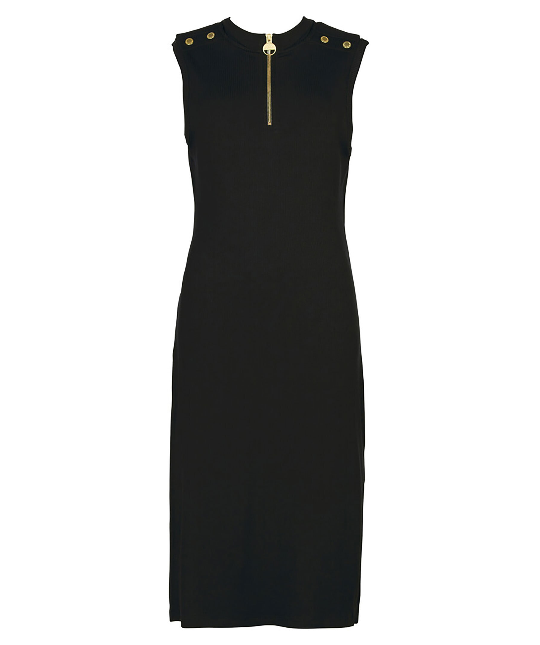 Svart, ribbad jerseyklänning från Barbour. Tillverkad i viskosblandning. Tratthals med halv dragkedja. Två guldiga knappar på vardera axel. Liten patch-logotyp bak i nacken.
