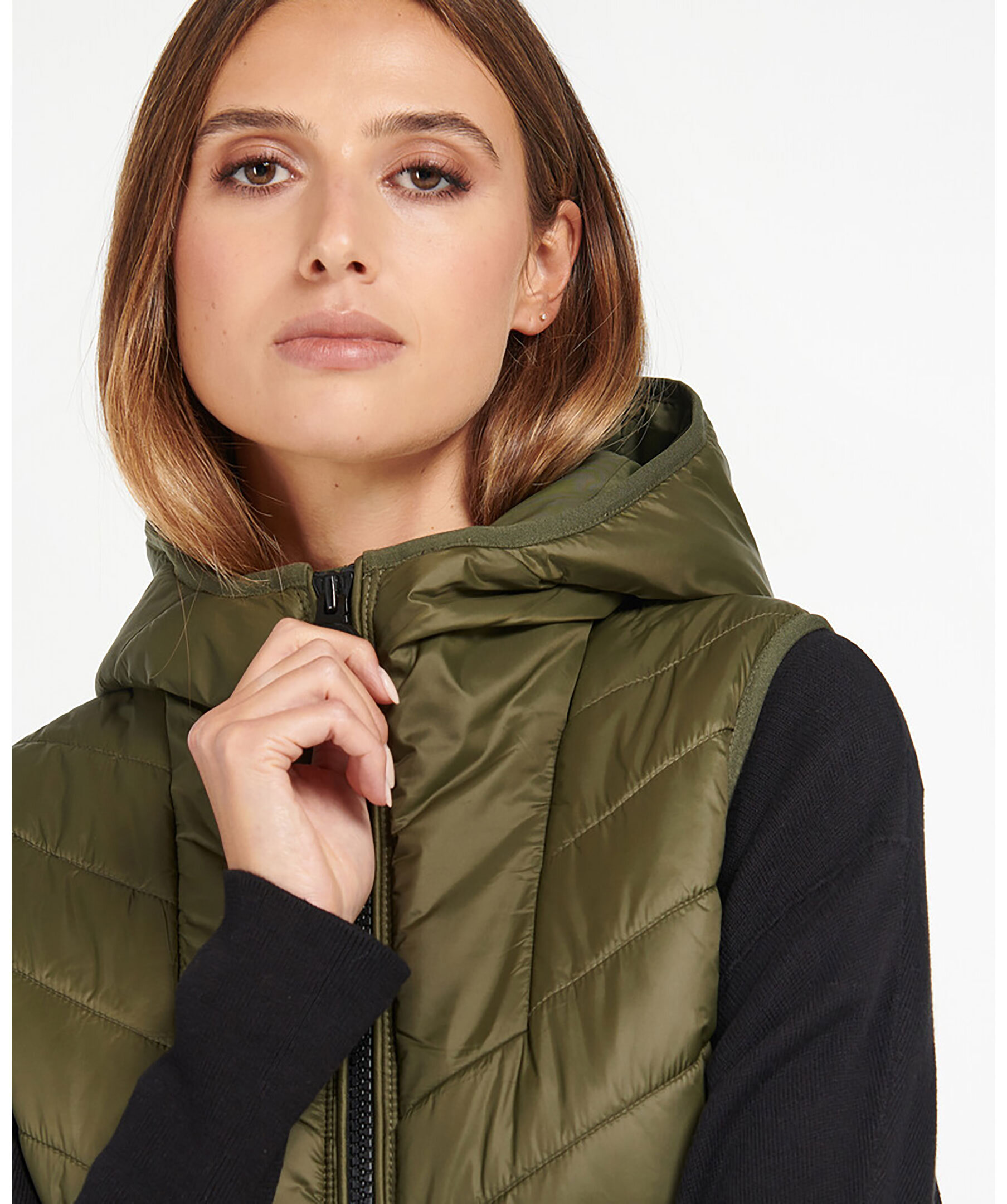 Quiltad olivgrön väst från Barbour. Tillverkad i polyamid och polyesterblandning. Kontrasterande sidopaneler. Stängs med dragkedja, två sidfickor med dragkedja och en fast huva. Patch-logotyp vid plaggslut.