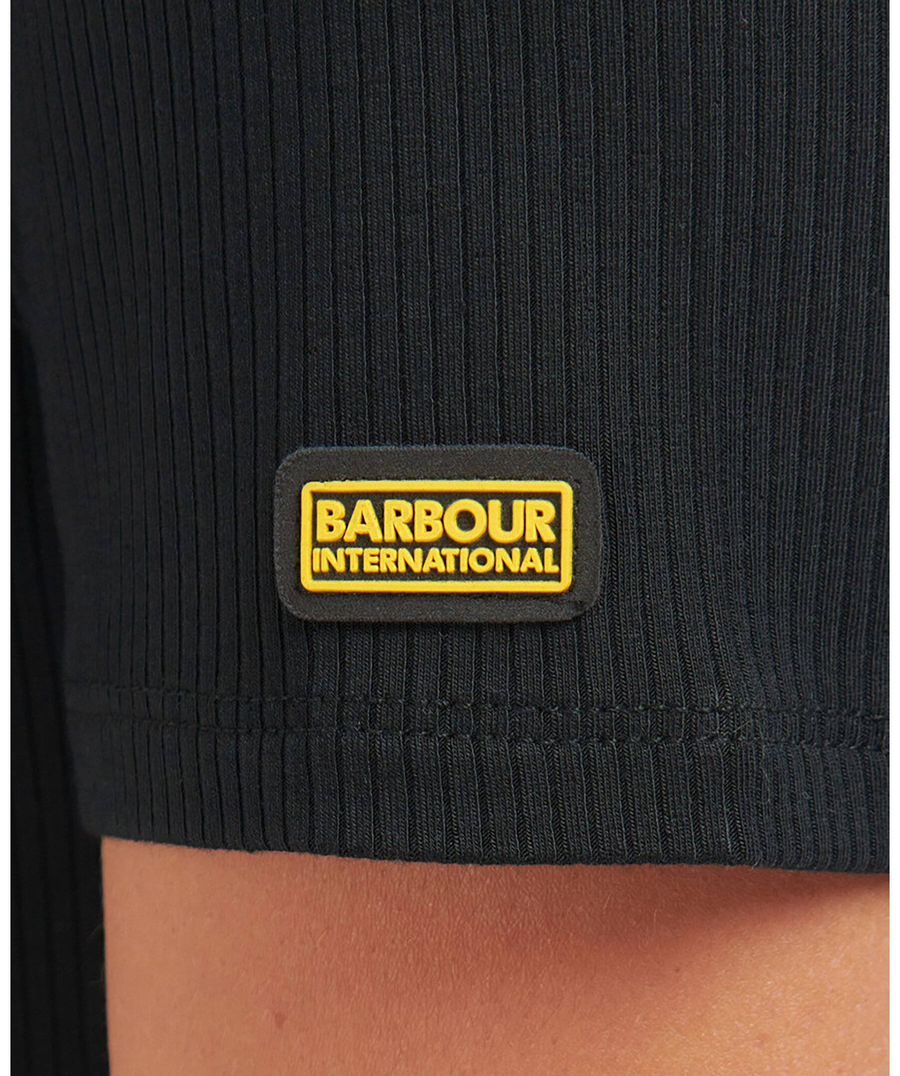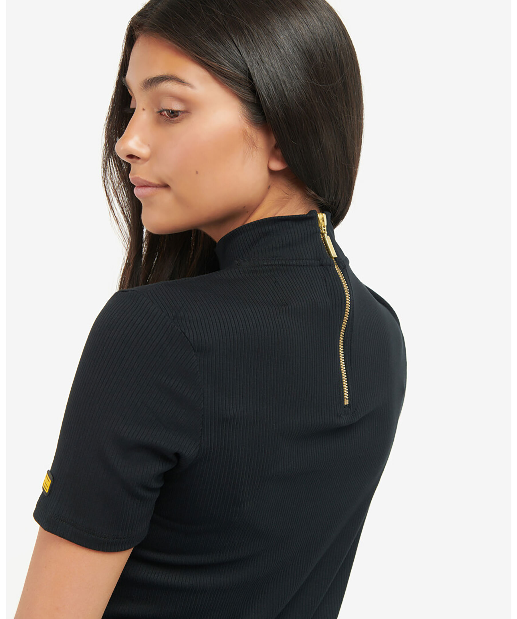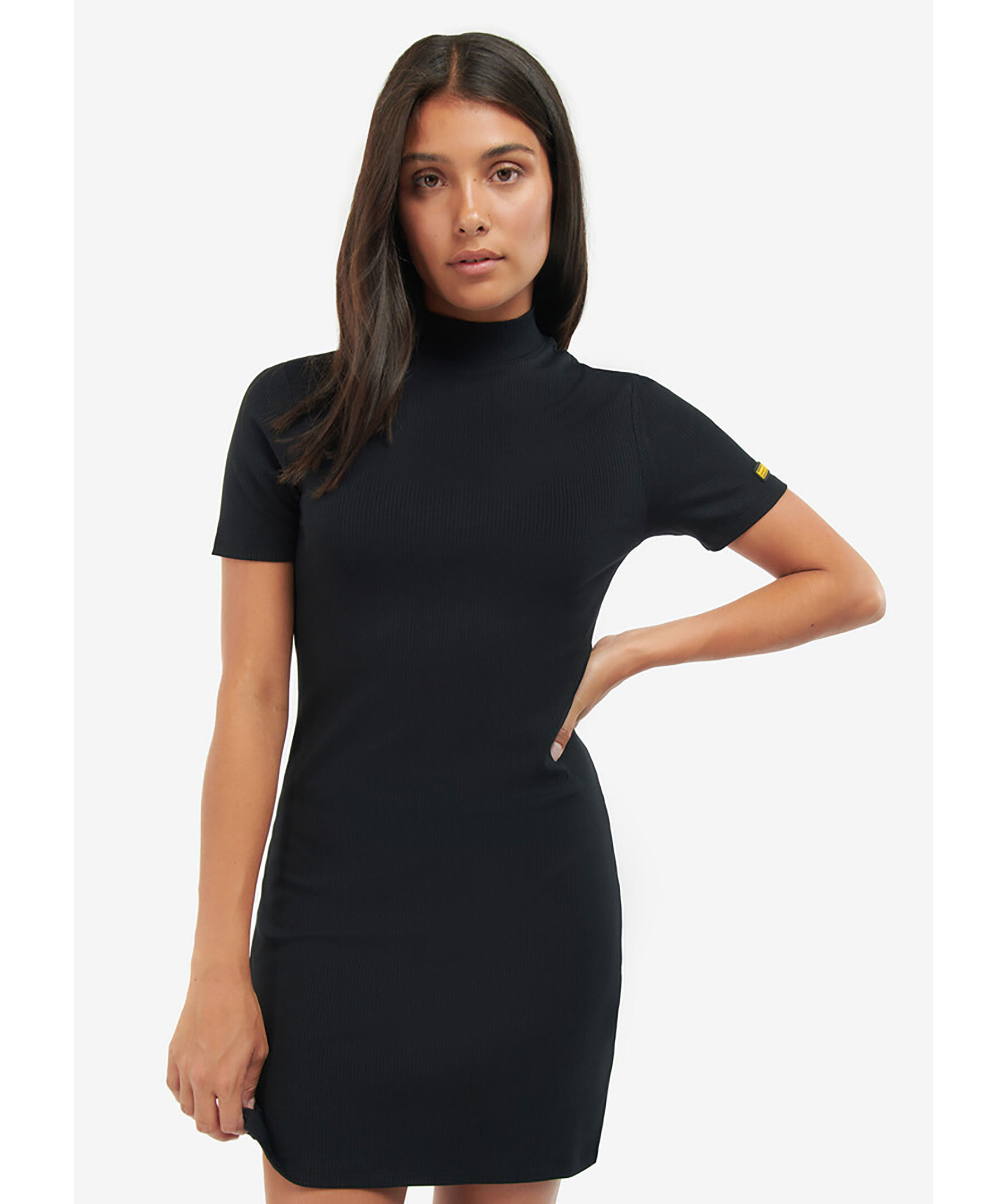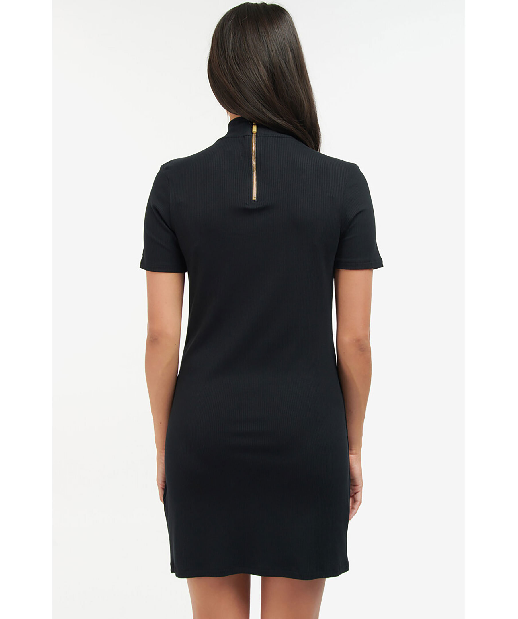 Svart, ribbad jerseyklänning från Barbour i t-shirt passform. Tillverkad i viskosblandning. Tratthals med halv dragkedja baktill i nacken för en sömnlös look. Liten patch-logotyp på vänster ärm.