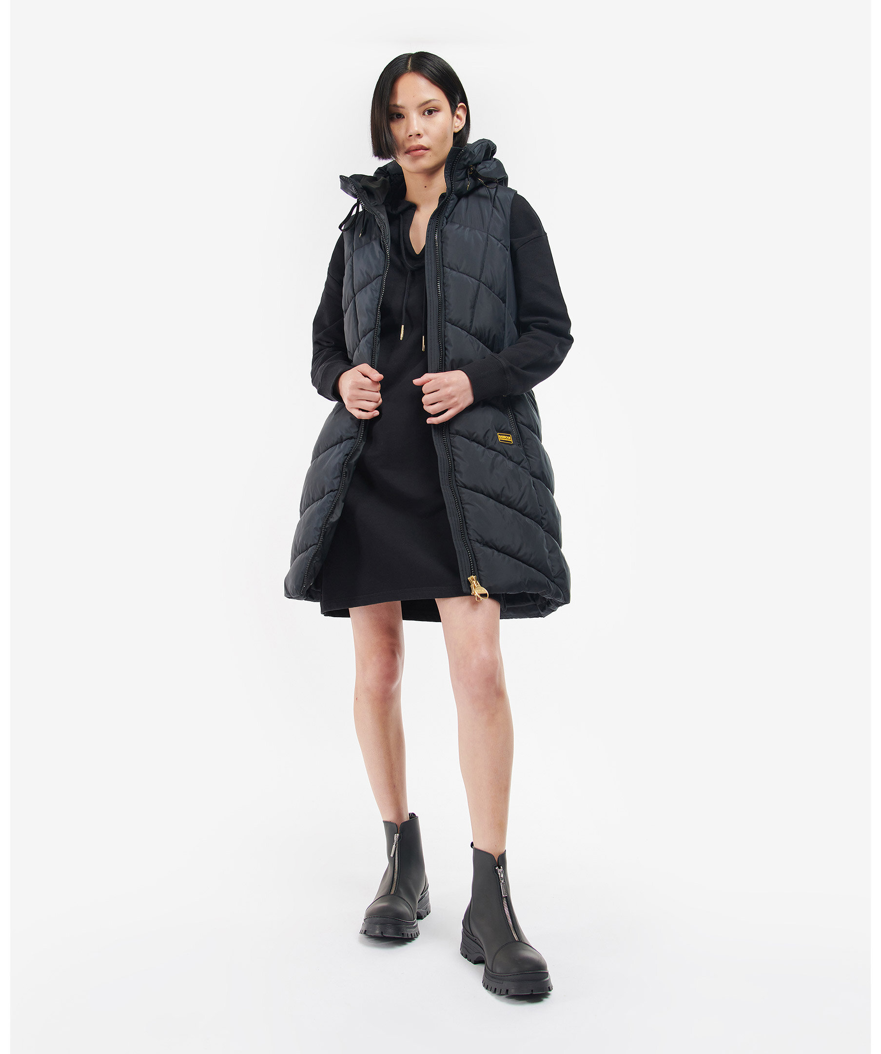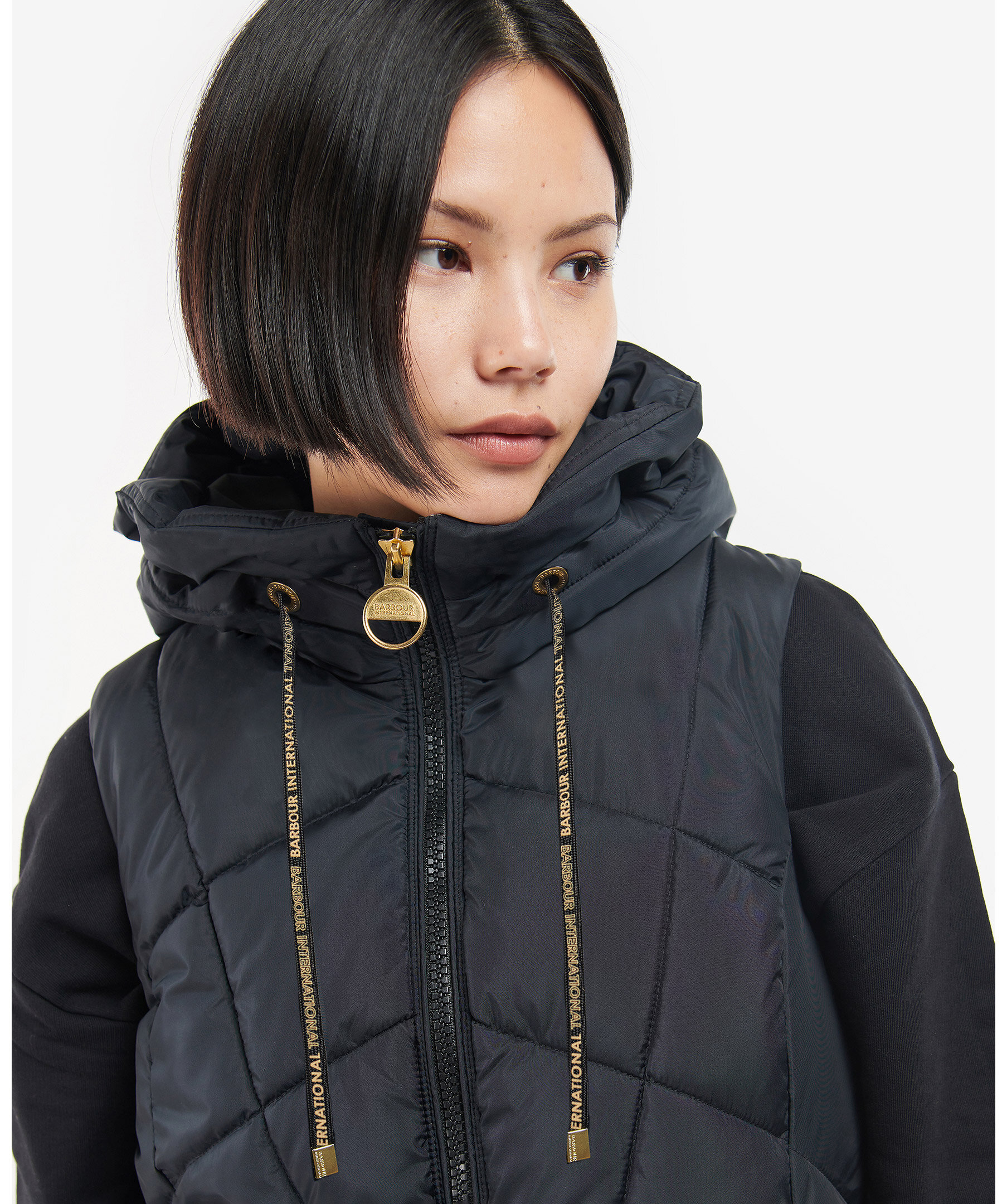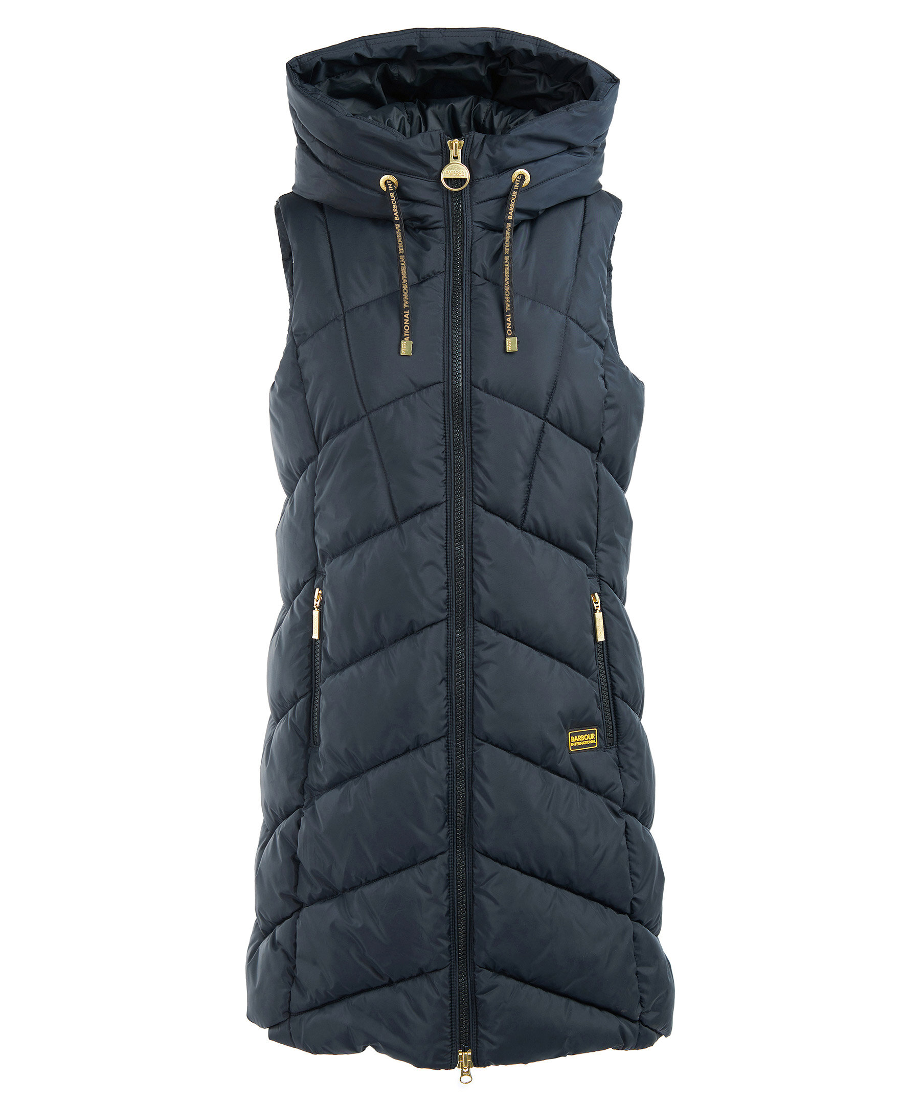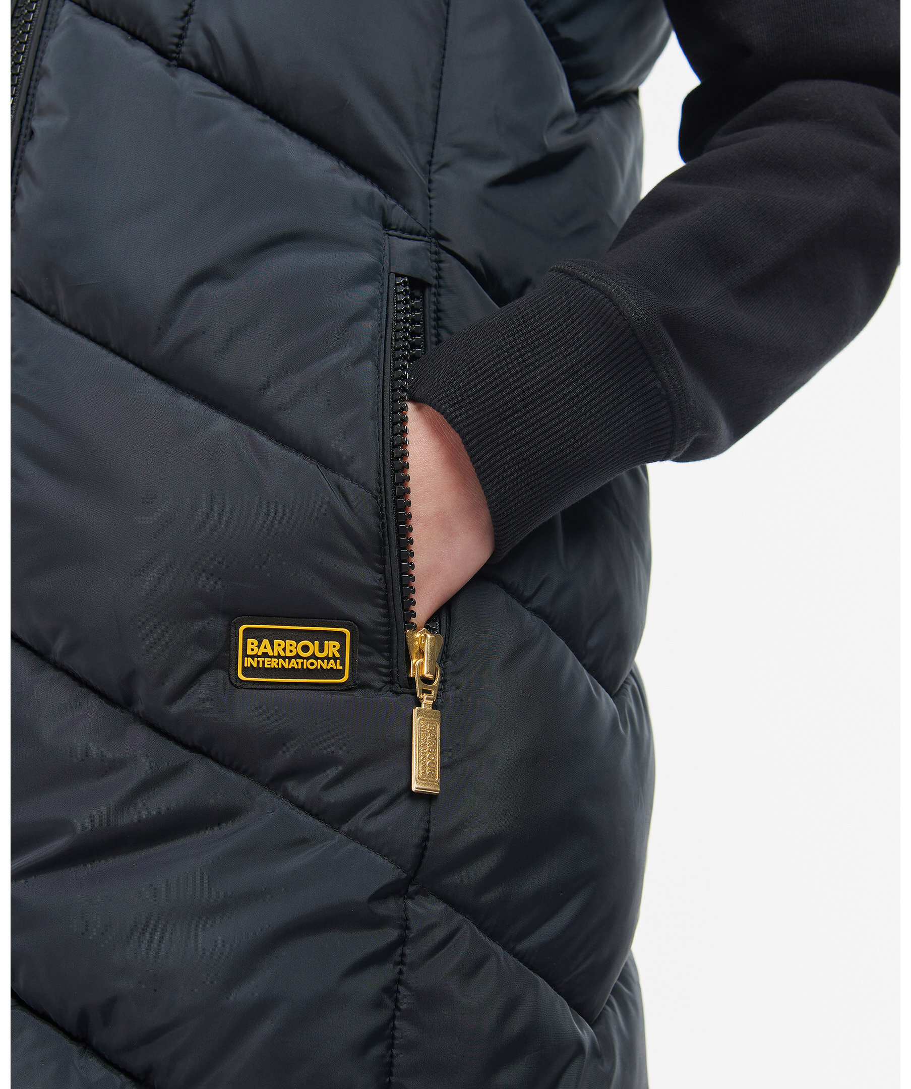 Svart, diagonalt quiltad och lång väst från Barbour International. Sportigt inspirerad design med en fast luva och stängs med dragkedja med gulddetaljer. Dragsko i luvan med guldfärgade logotyper på, två framfickor med dragkedja samt gummerad logotyp vid den vänstra fickan. Tillverkad i Polyester.