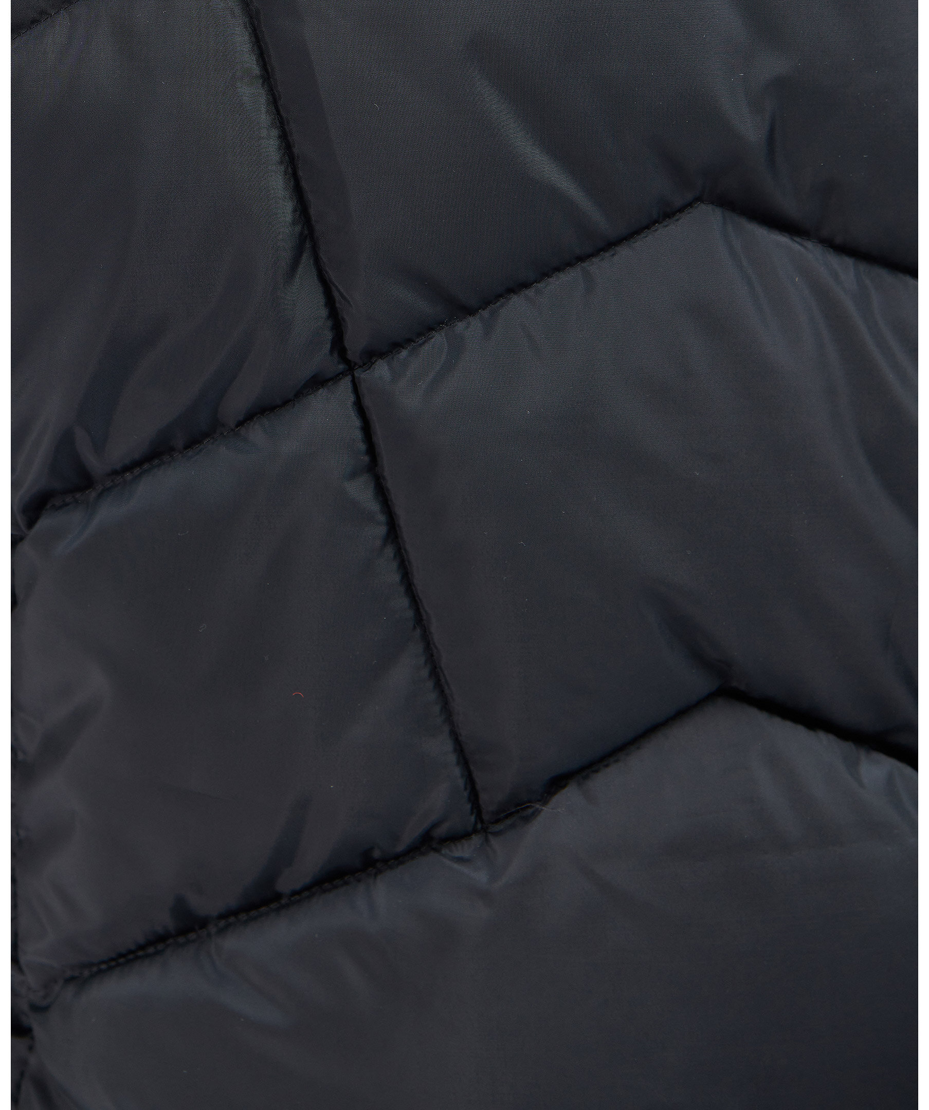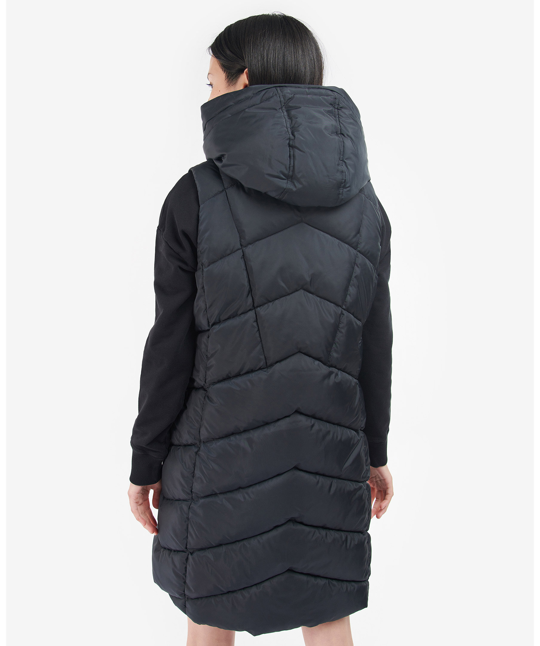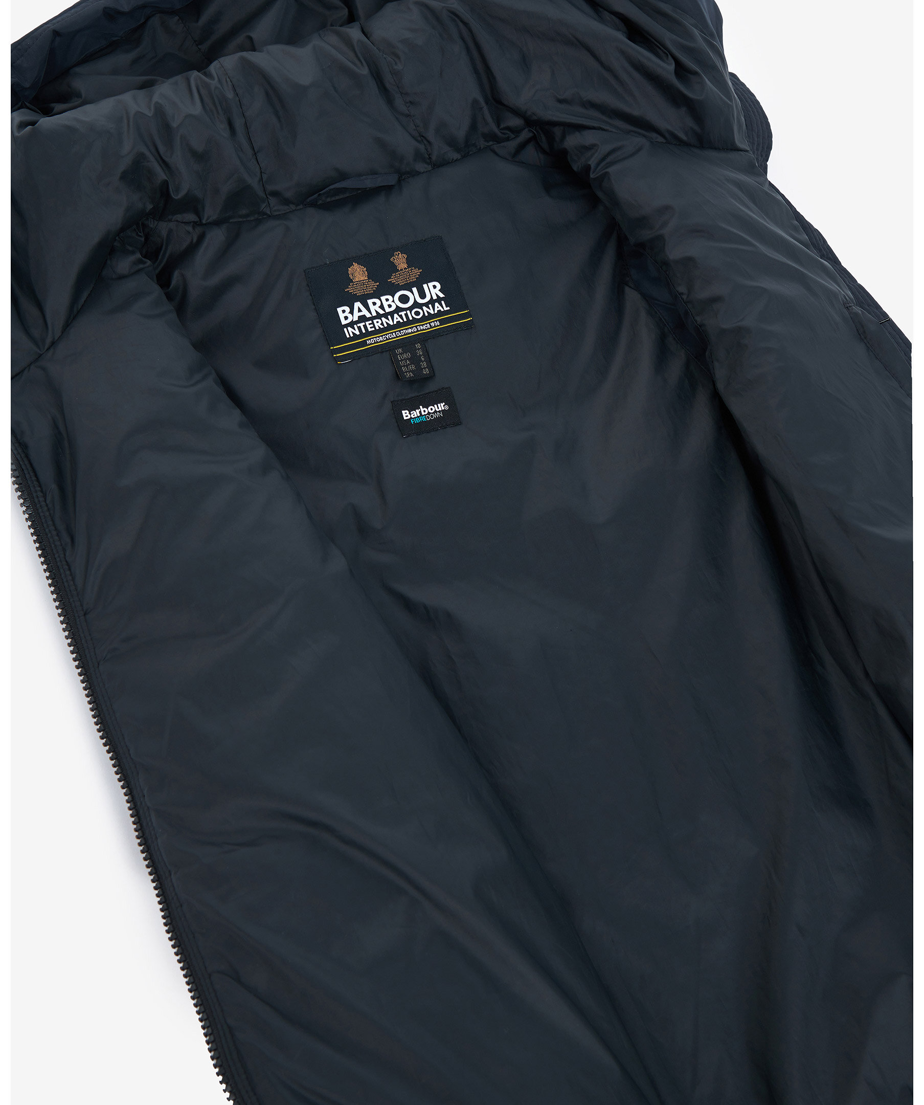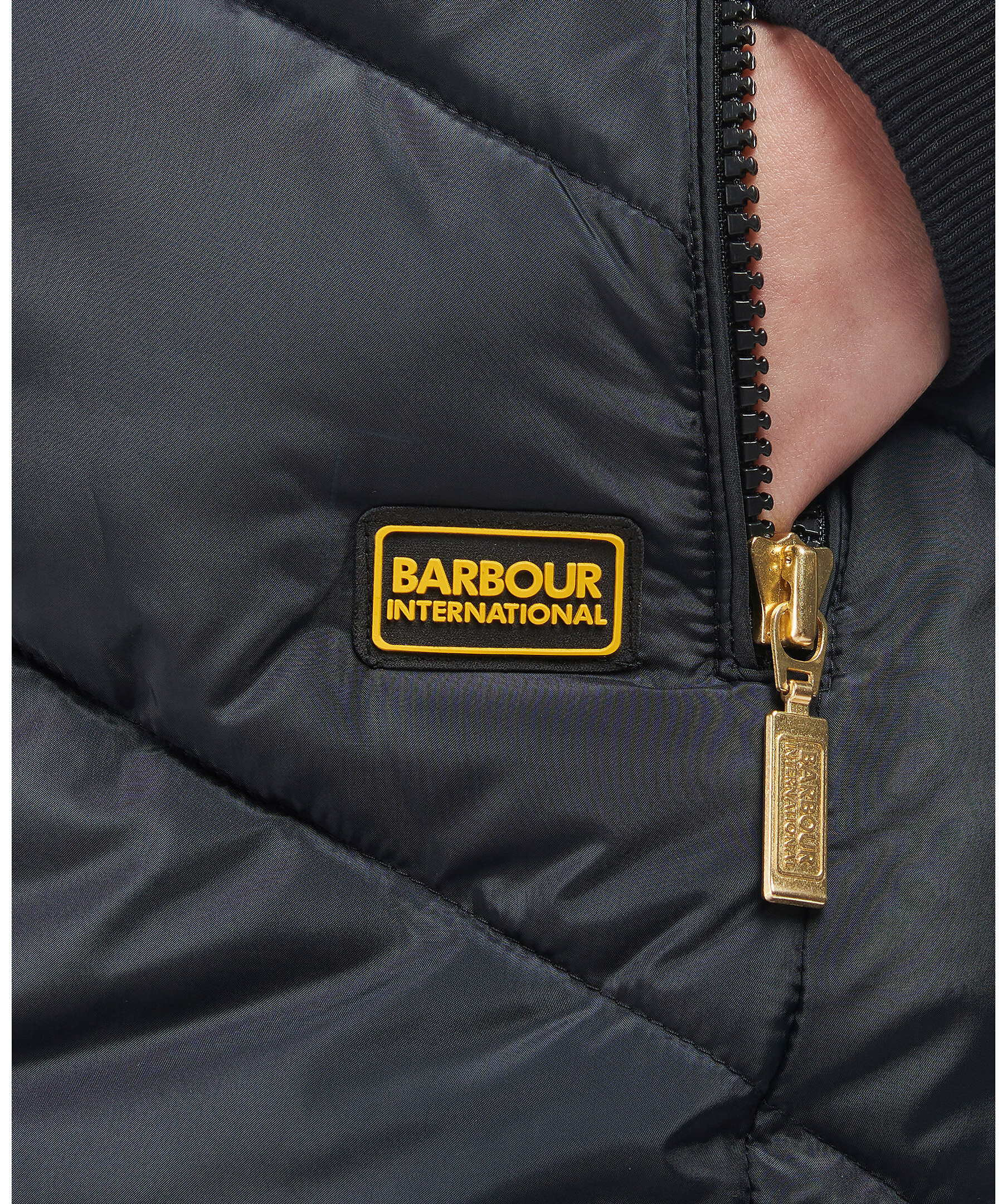 Svart, diagonalt quiltad och lång väst från Barbour International. Sportigt inspirerad design med en fast luva och stängs med dragkedja med gulddetaljer. Dragsko i luvan med guldfärgade logotyper på, två framfickor med dragkedja samt gummerad logotyp vid den vänstra fickan. Tillverkad i Polyester.